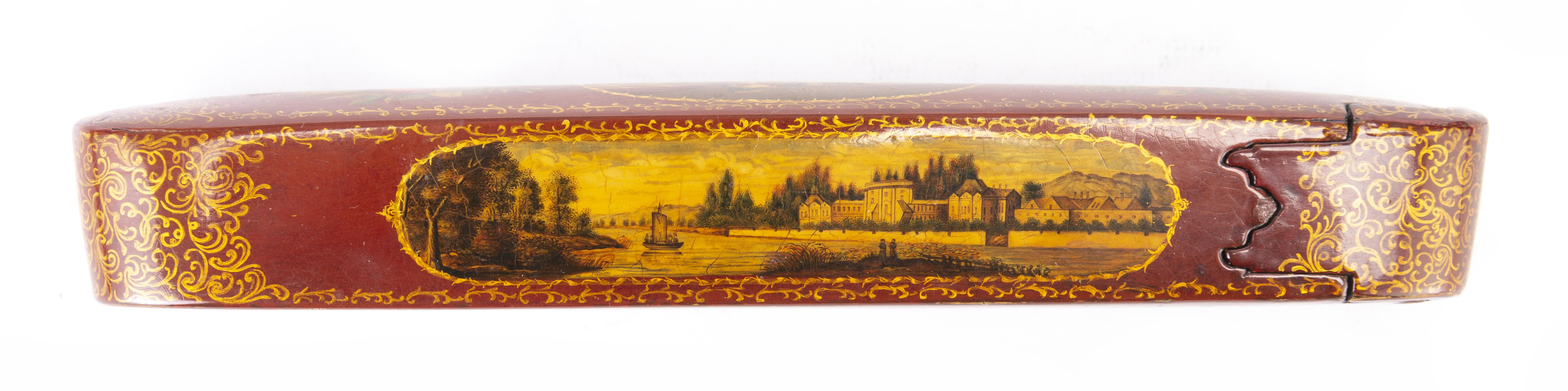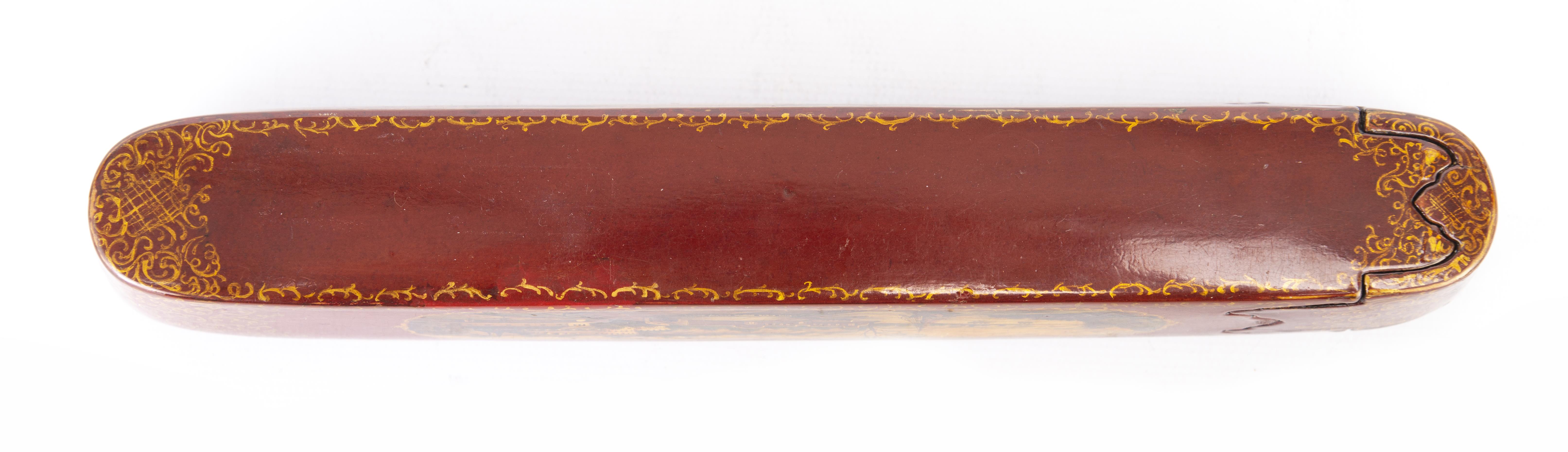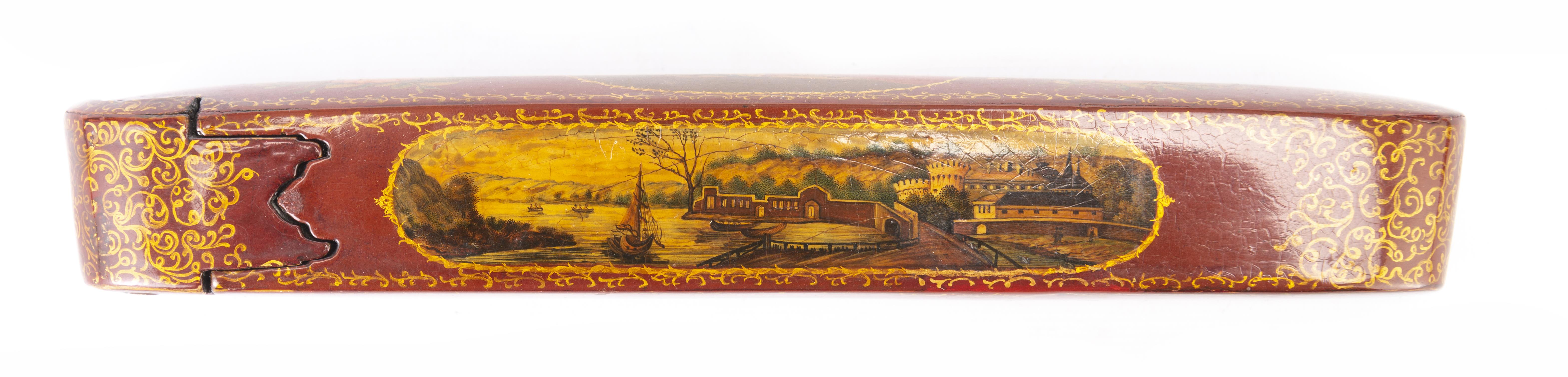 Plumier en bois laqué iranien d'époque Qadjar à décor dans un médaillon d'une jeune femme debout en pose aguicheuse, scènes fluviales sur les côtés, bouquets de fleurs sur le champ rouge é encorbellements d'or.
