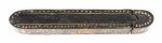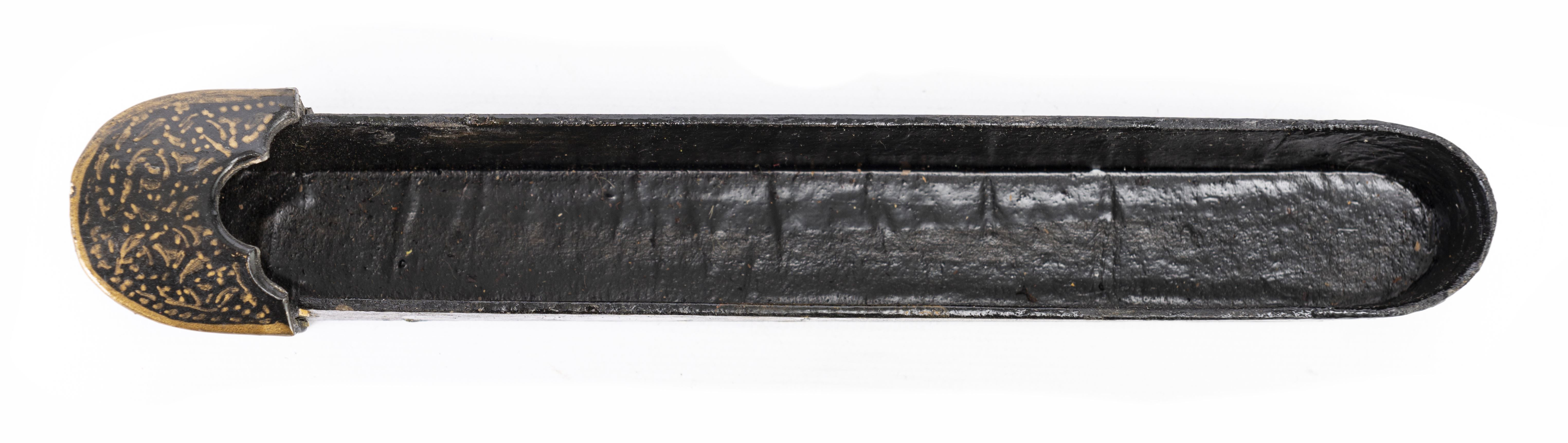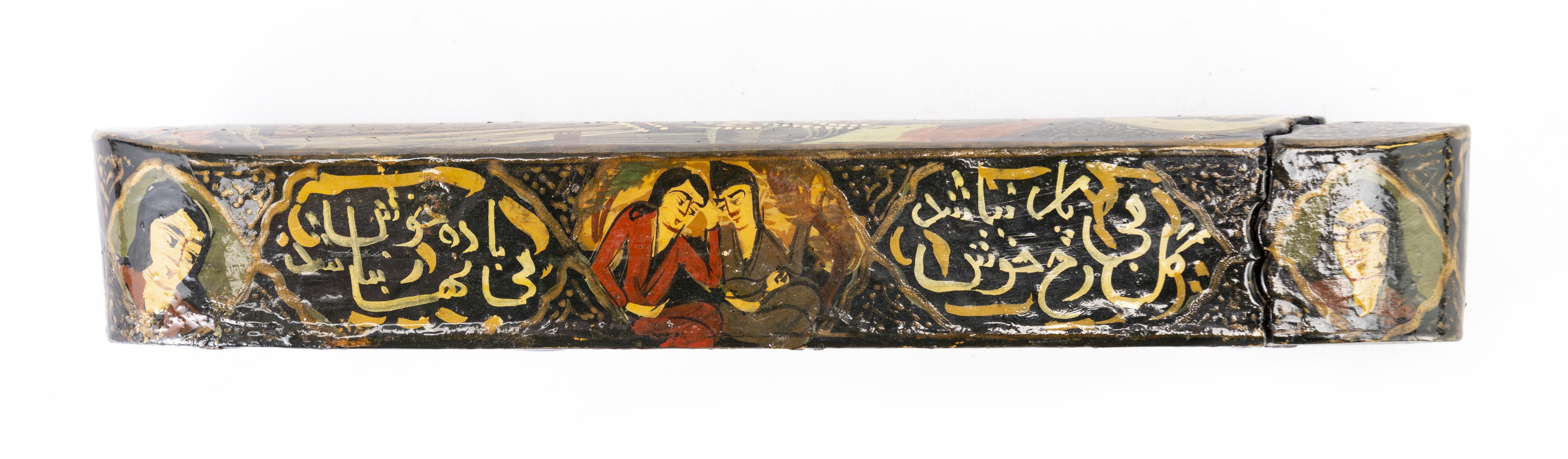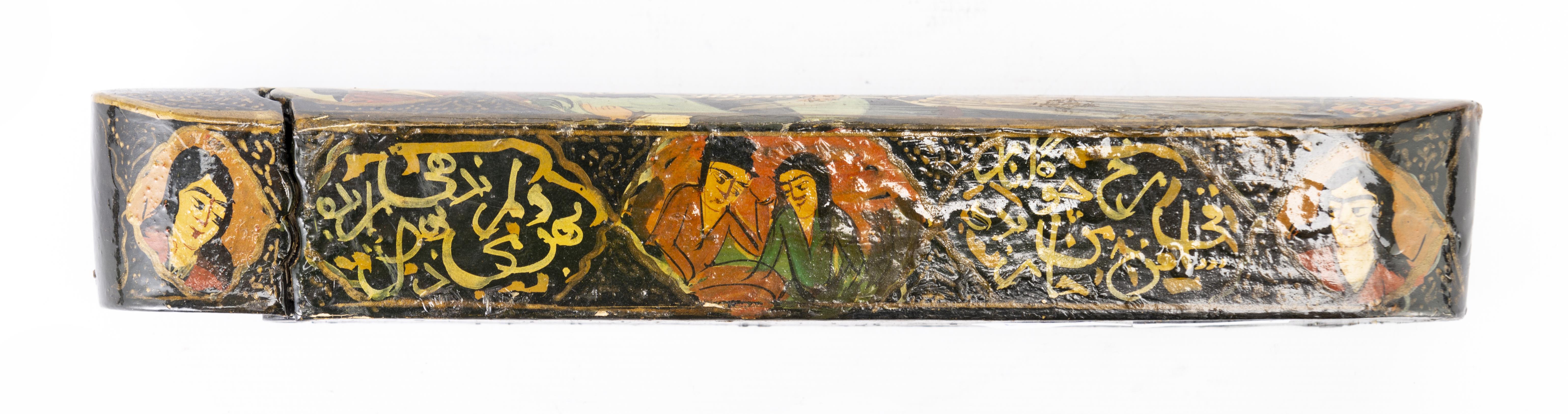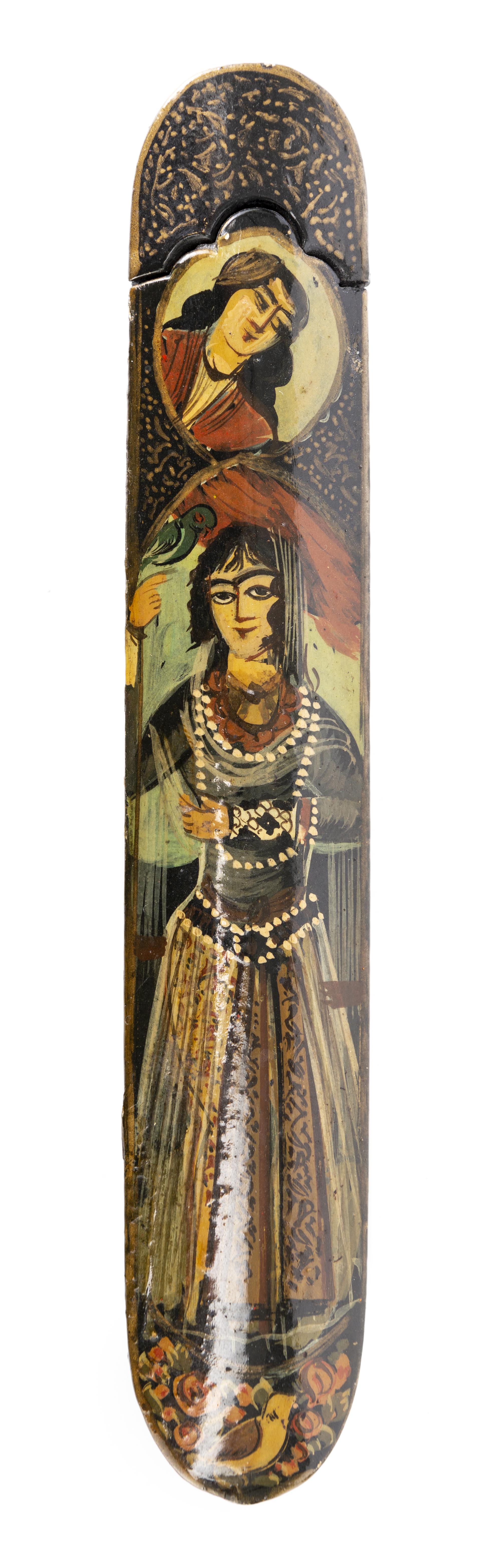 Plumier iranien en papier mâché à médaillon d'une femme debout et au dessus d'un homme la regardant à travers une ouverture, marli à décor alterné de têtes de personnages et de calligraphies, style Qadjar XIXe.