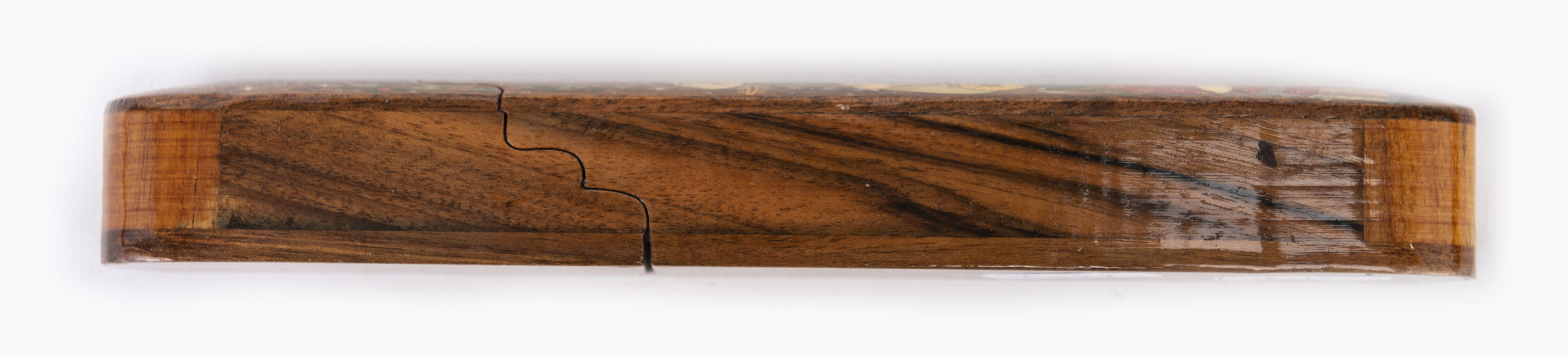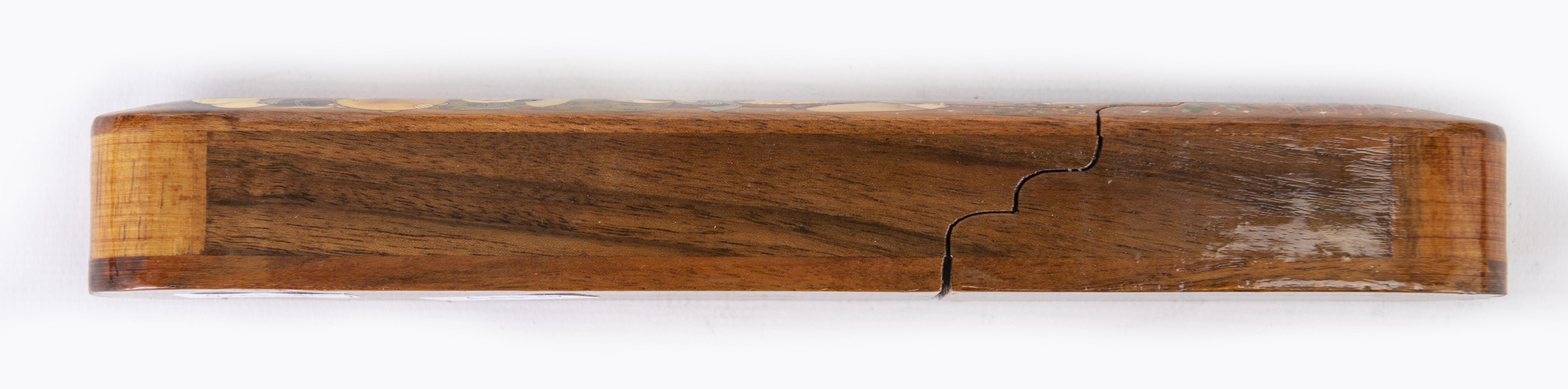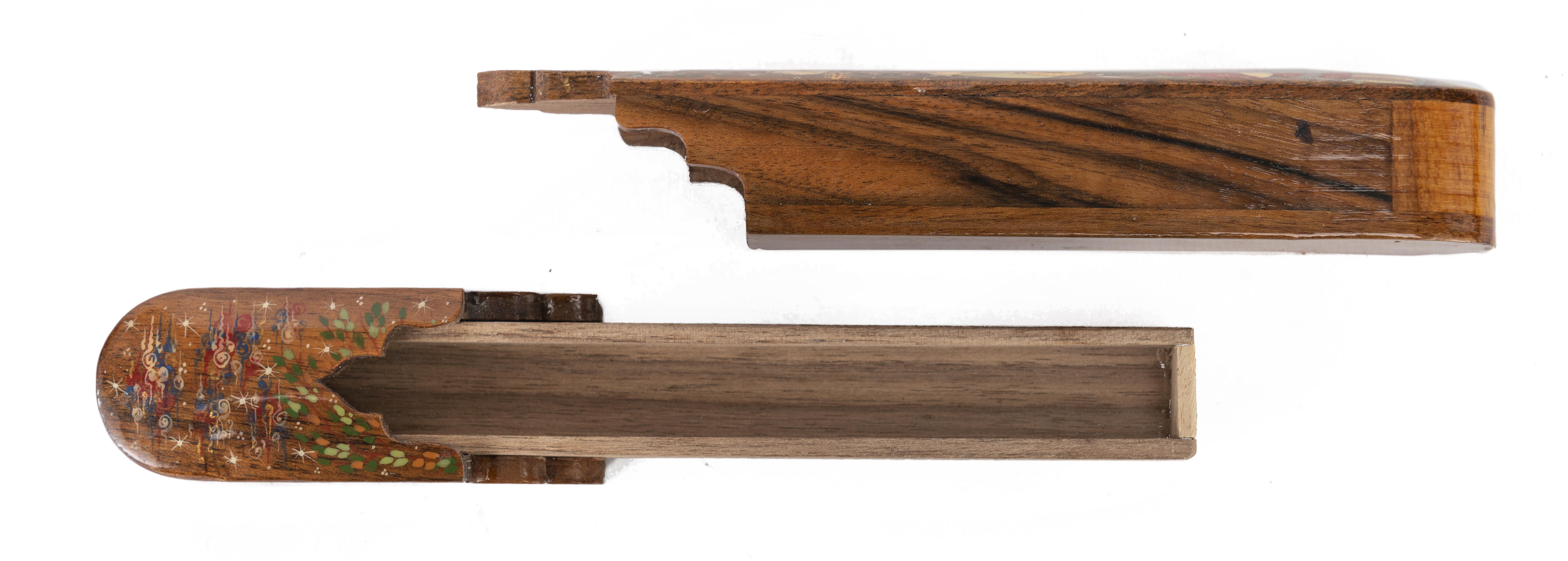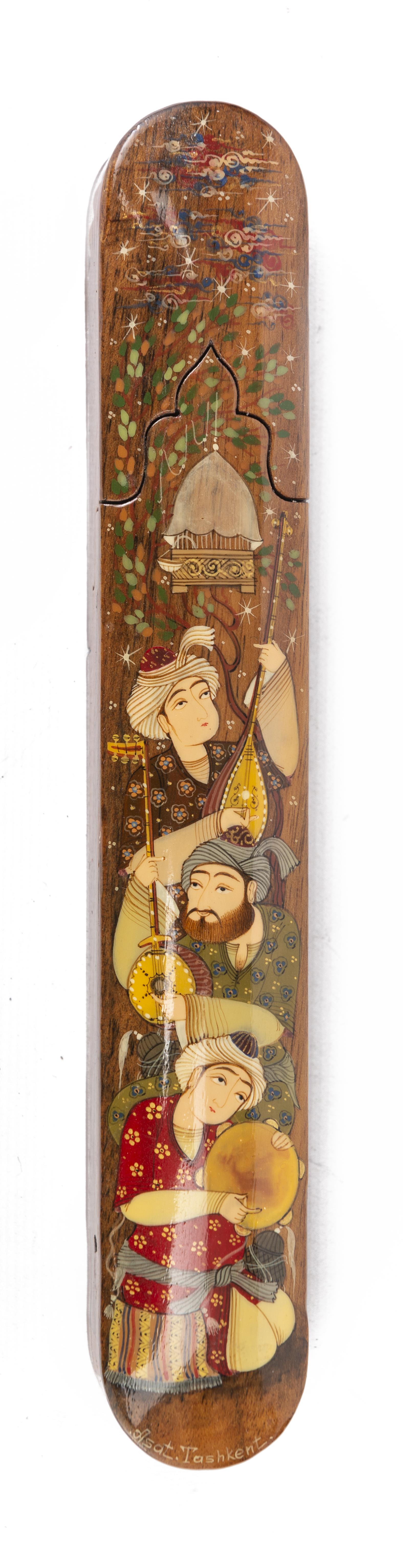 Plumier iranien en bois à décor de musiciens signé en bas Olsat Tashkent XXe.