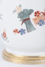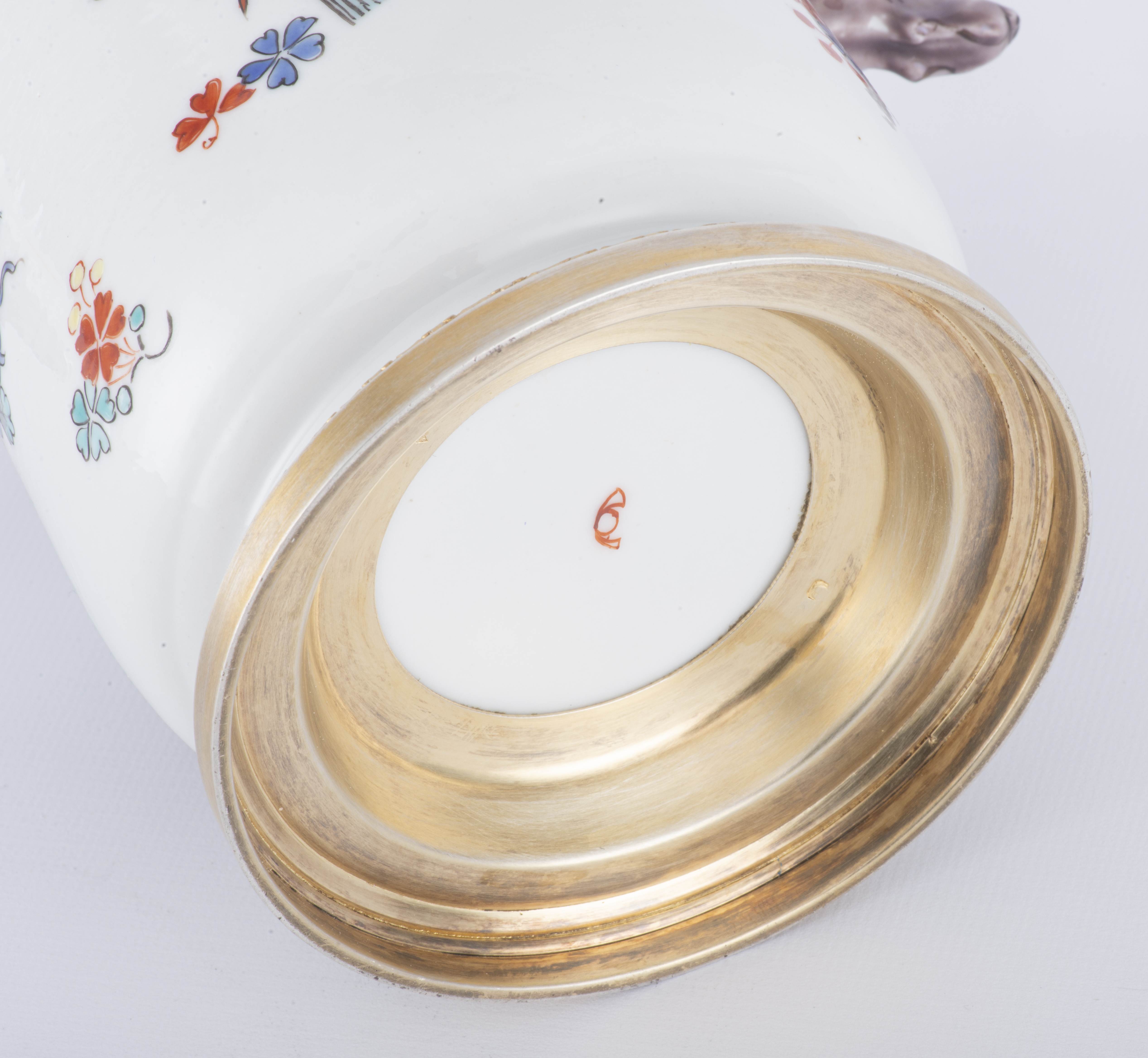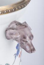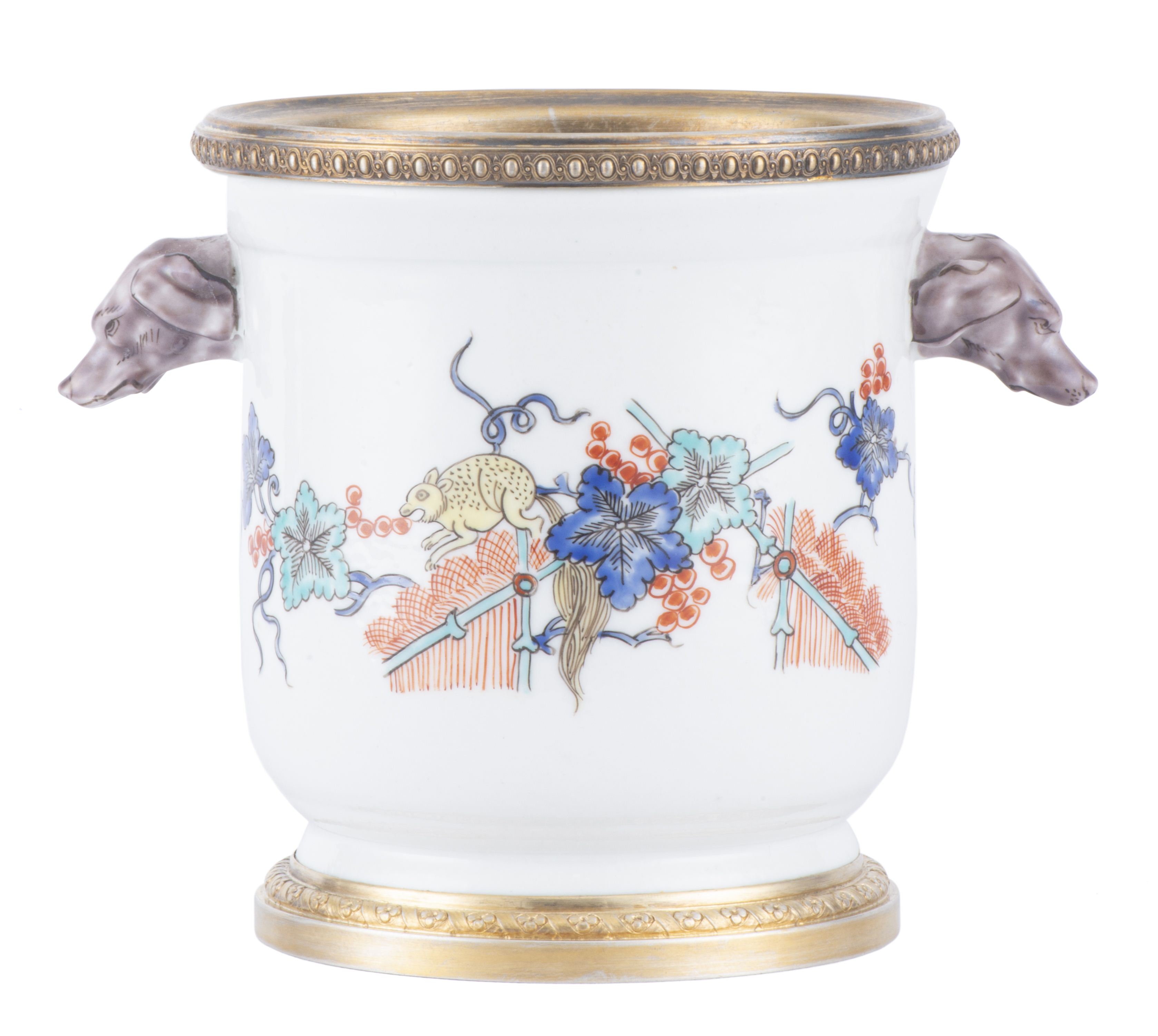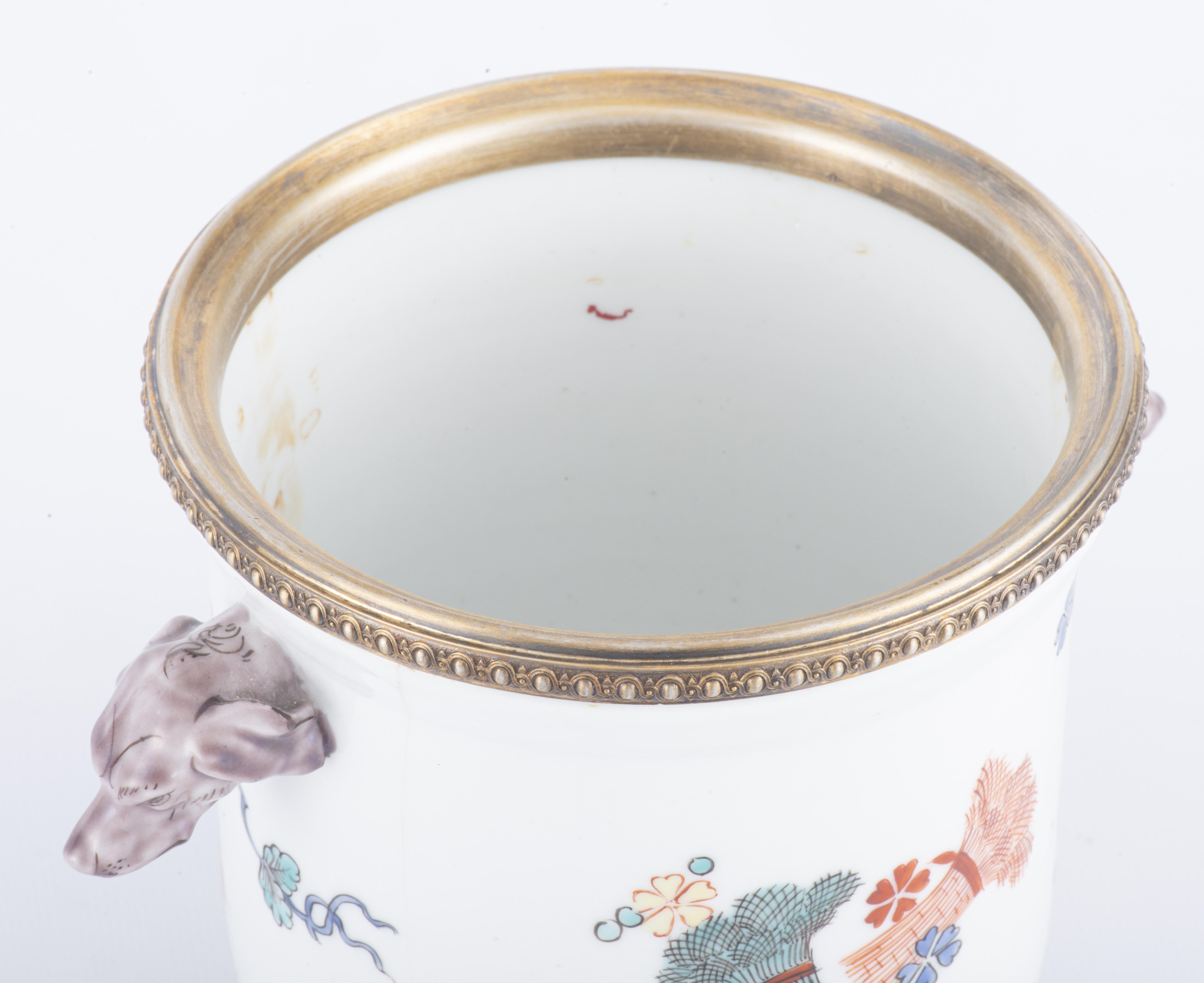 Rafraichissoir en porcelaine de Chantilly à décor Kakiémon, deux anses têtes de chien, marque à la trompette en rouge sous la base, XVIIIe, cerclage n bronze plus tardif.