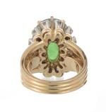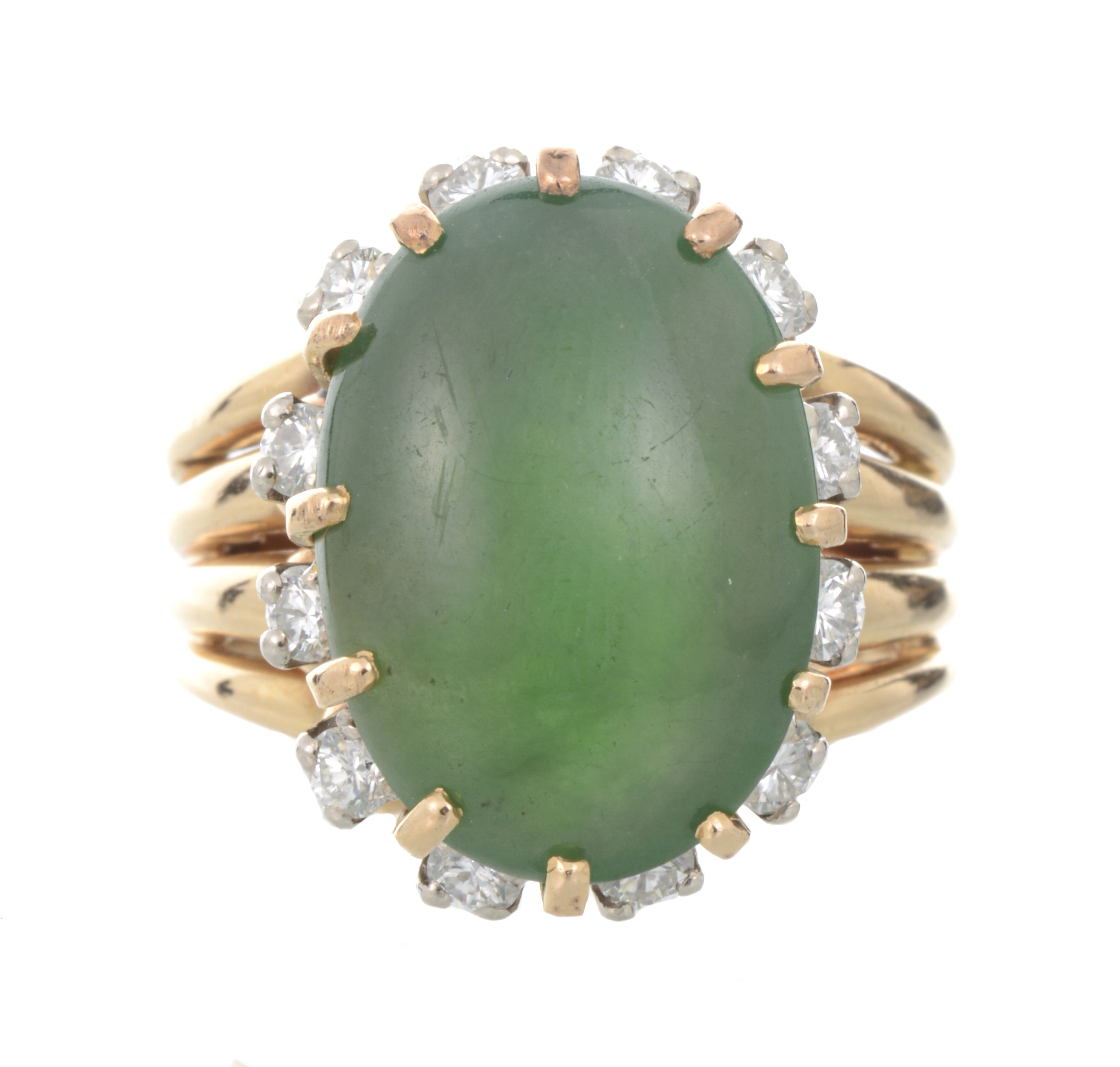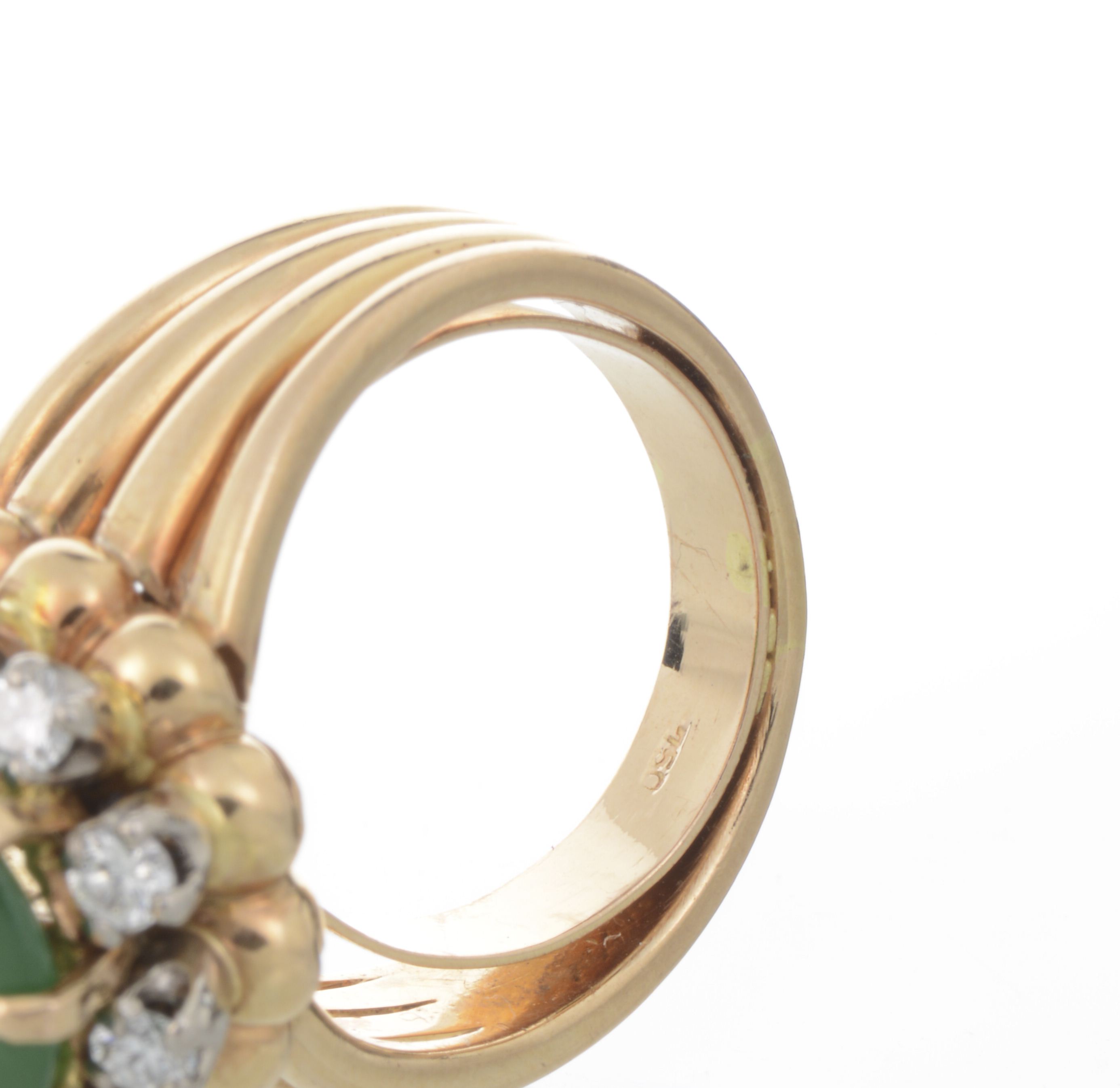 Bague en or jaune .750 et serpentine cabochon vert et 12 diamants de taille brillant pour un total de .36 ct.