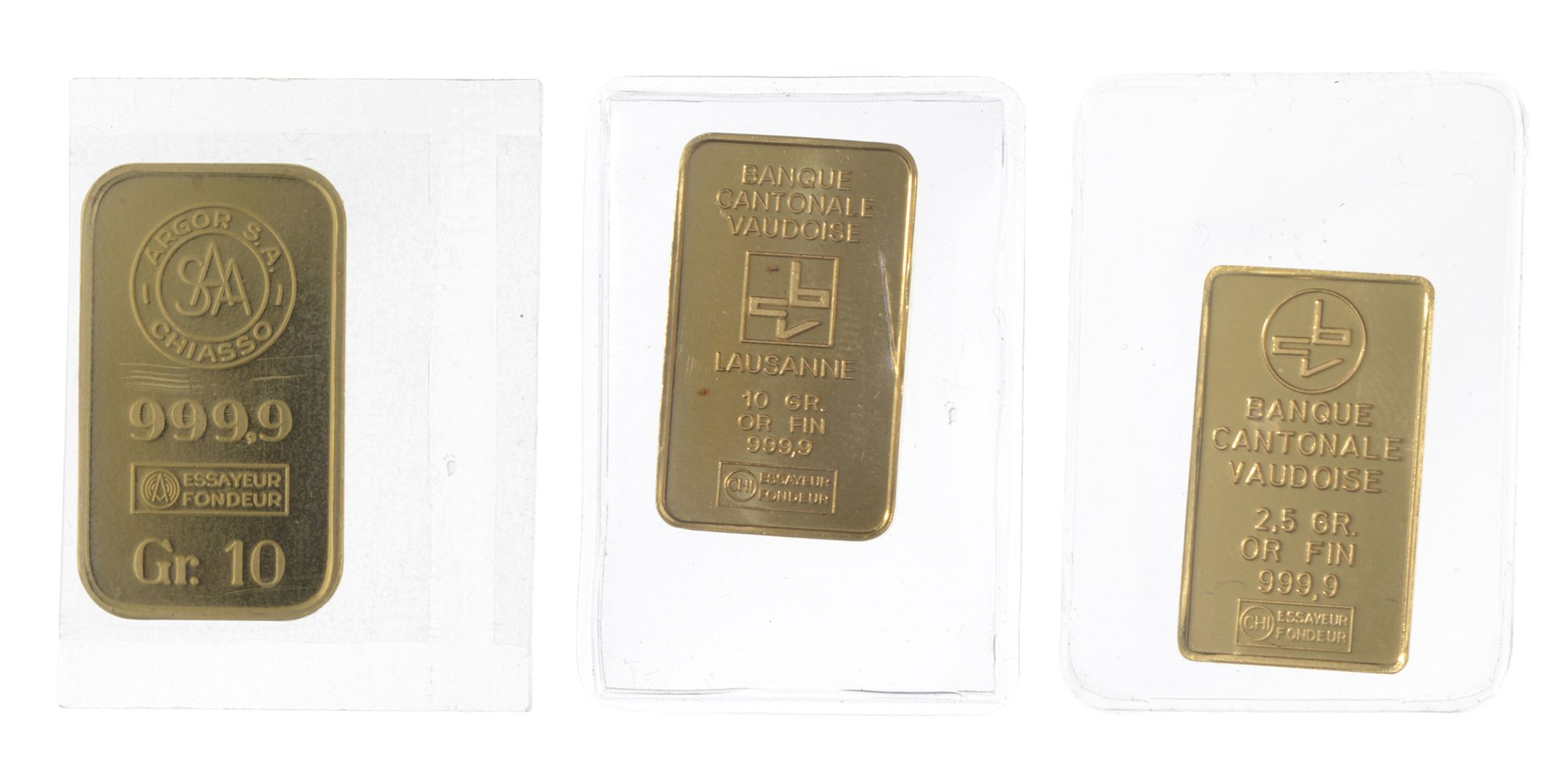 Trois lingots d'or fin .999.9 g