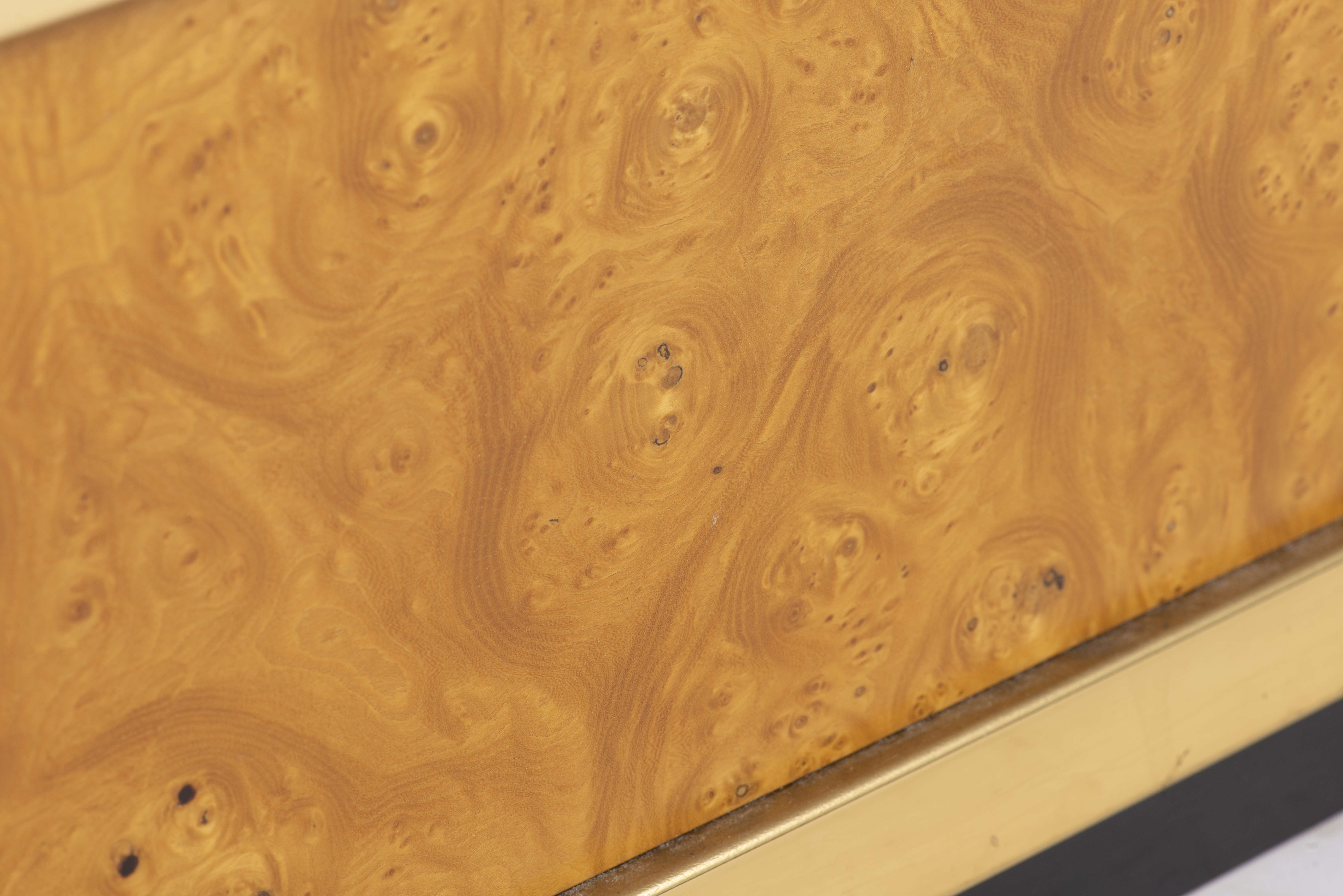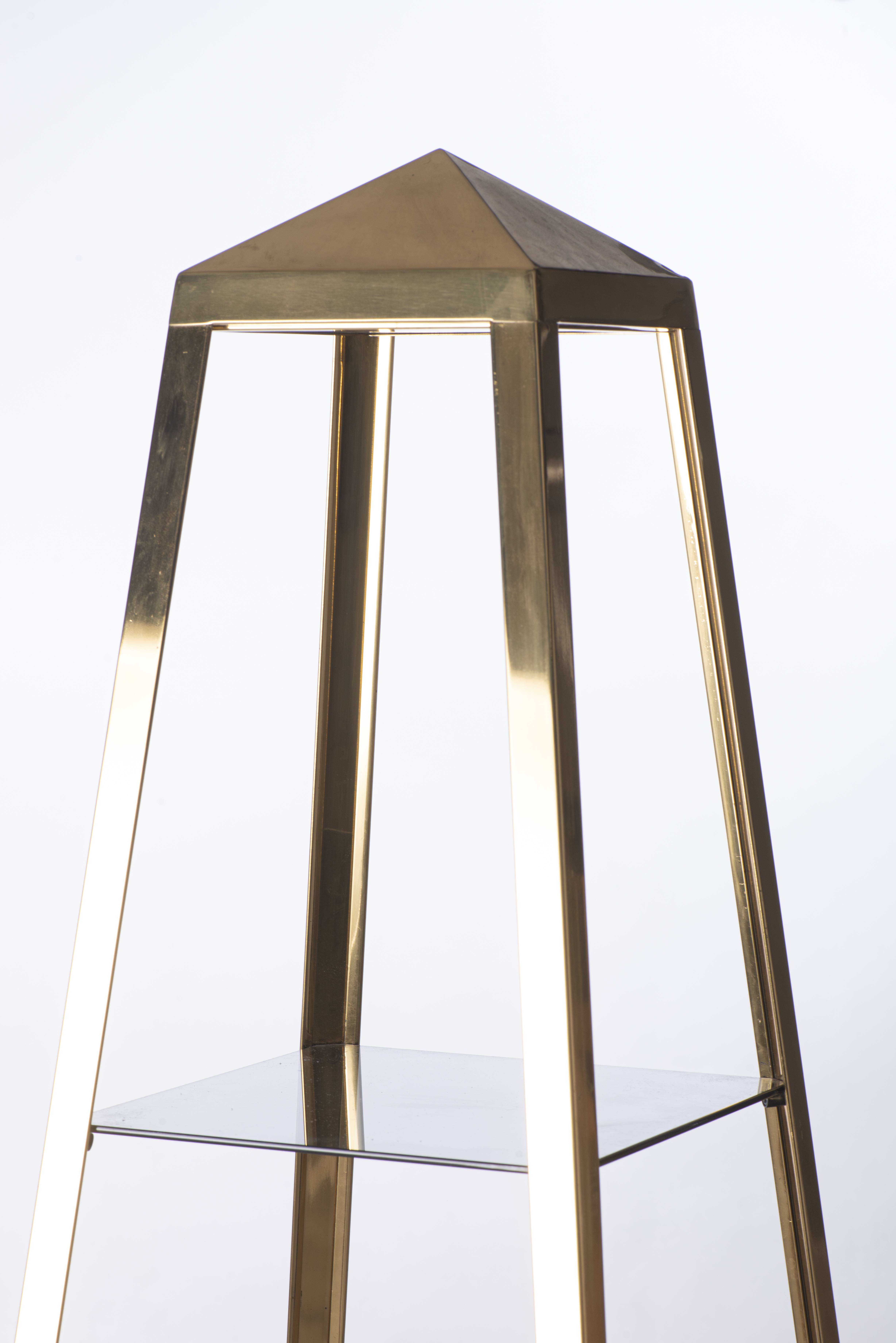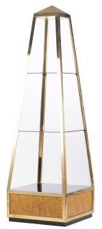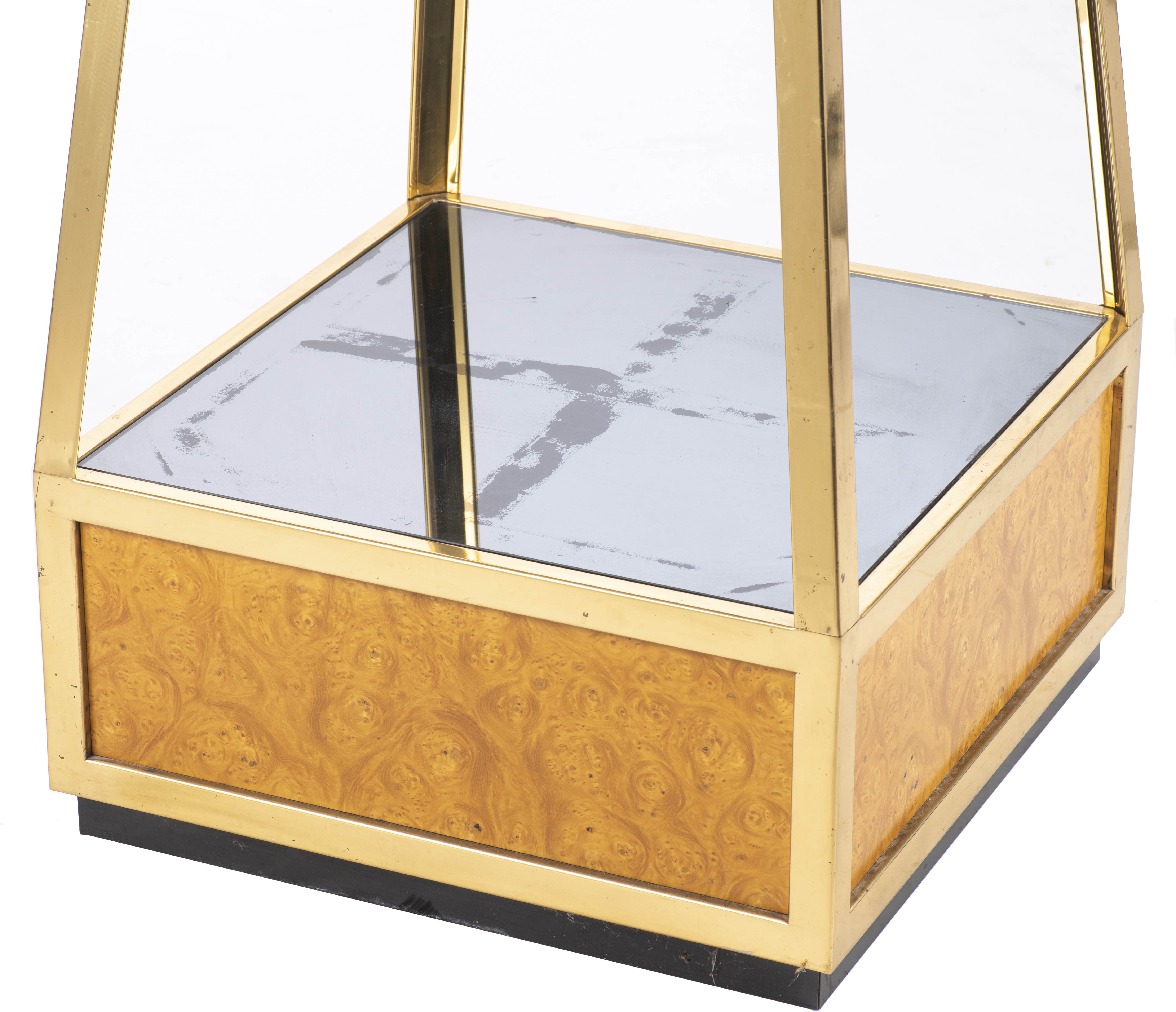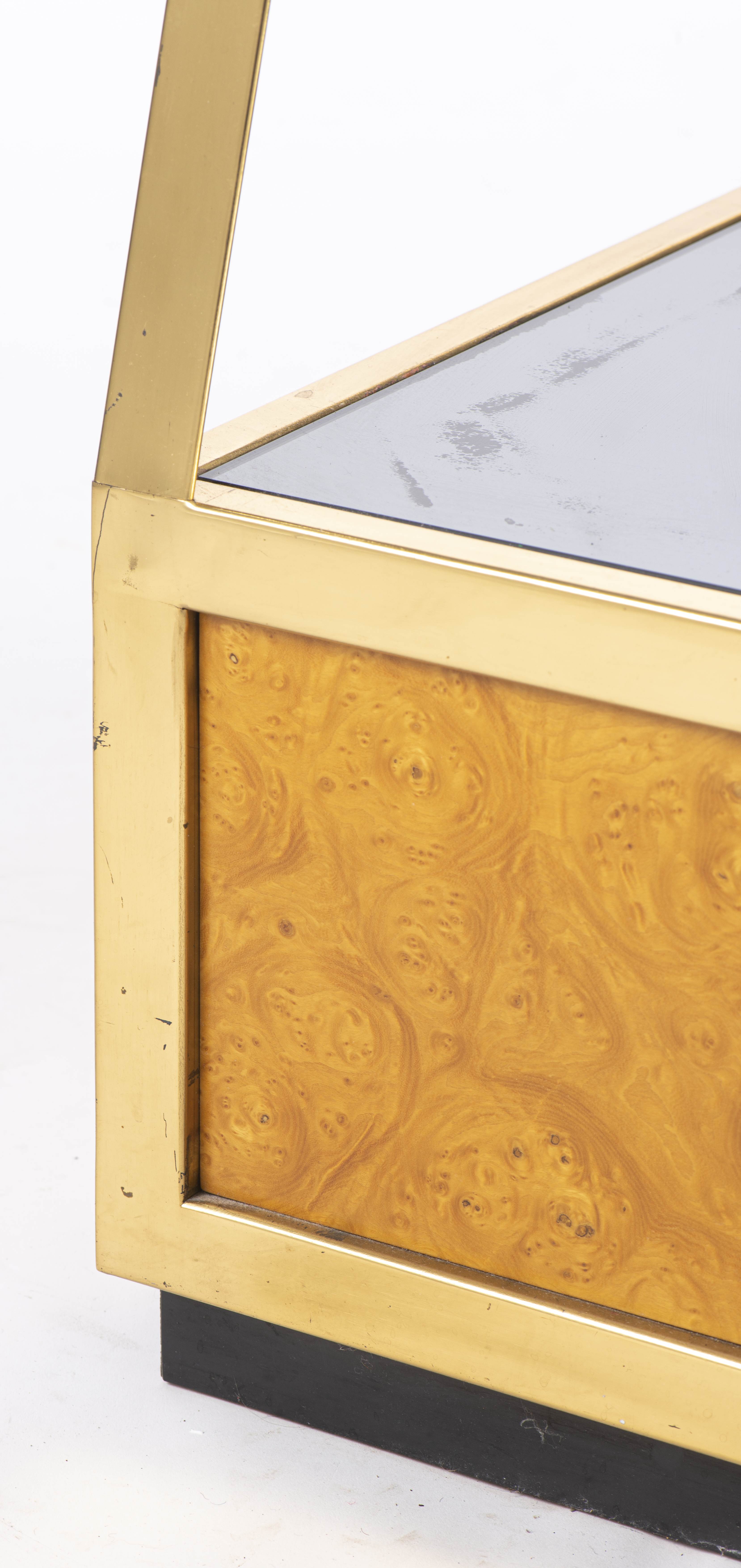 Willy RIZZO (1928-2013) étagère de présentation en forme de cristal de roche conique en laiton doré et placage de loupe de bois, verre fumé. Edition pour Mario Sabot. Année 70.