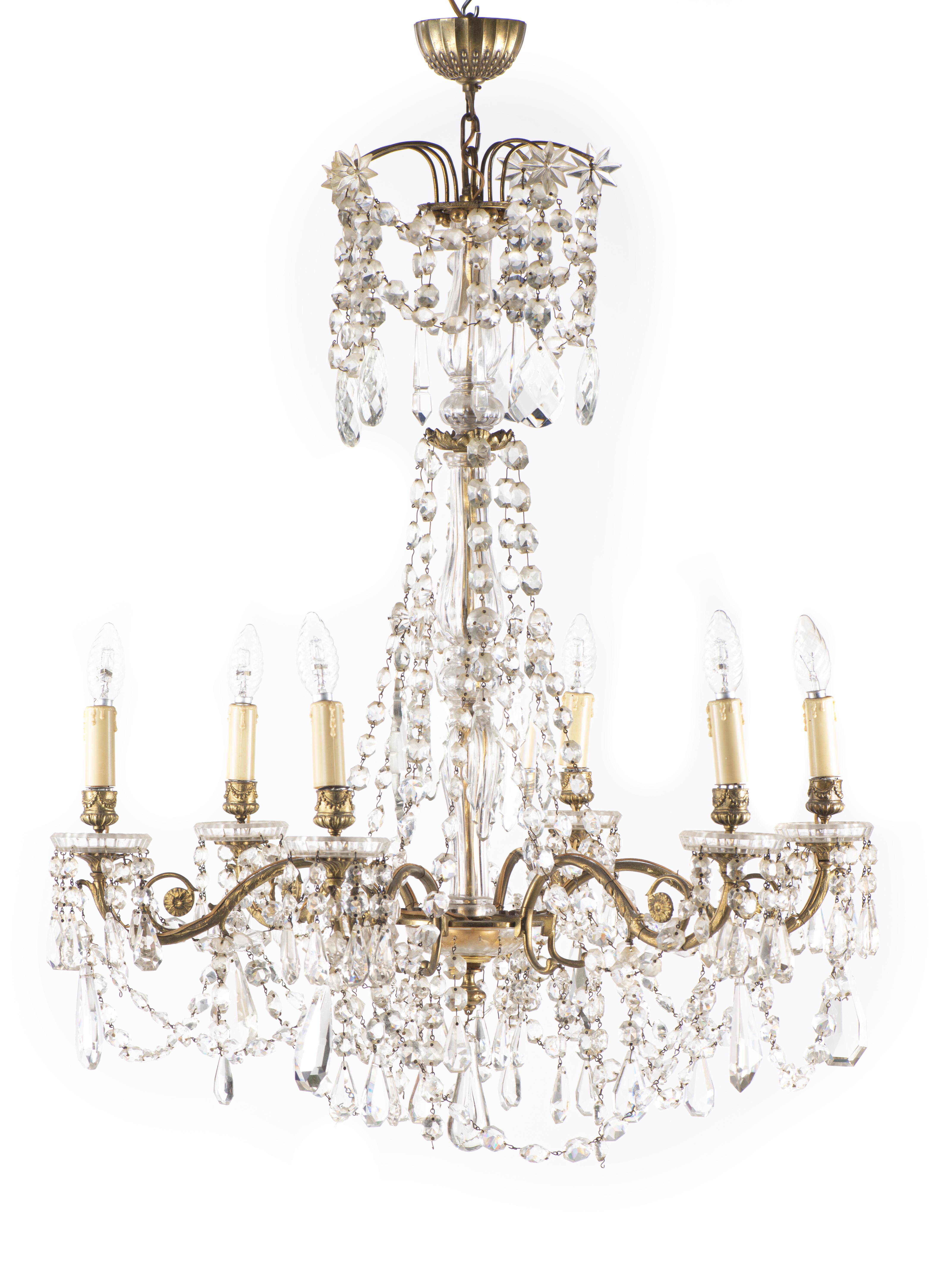 Lustre à six feux et ses deux appliques en métal doré et pendeloques, fût central en cristal taillé. Appliques à pendeloques à quatre bras de lumières.