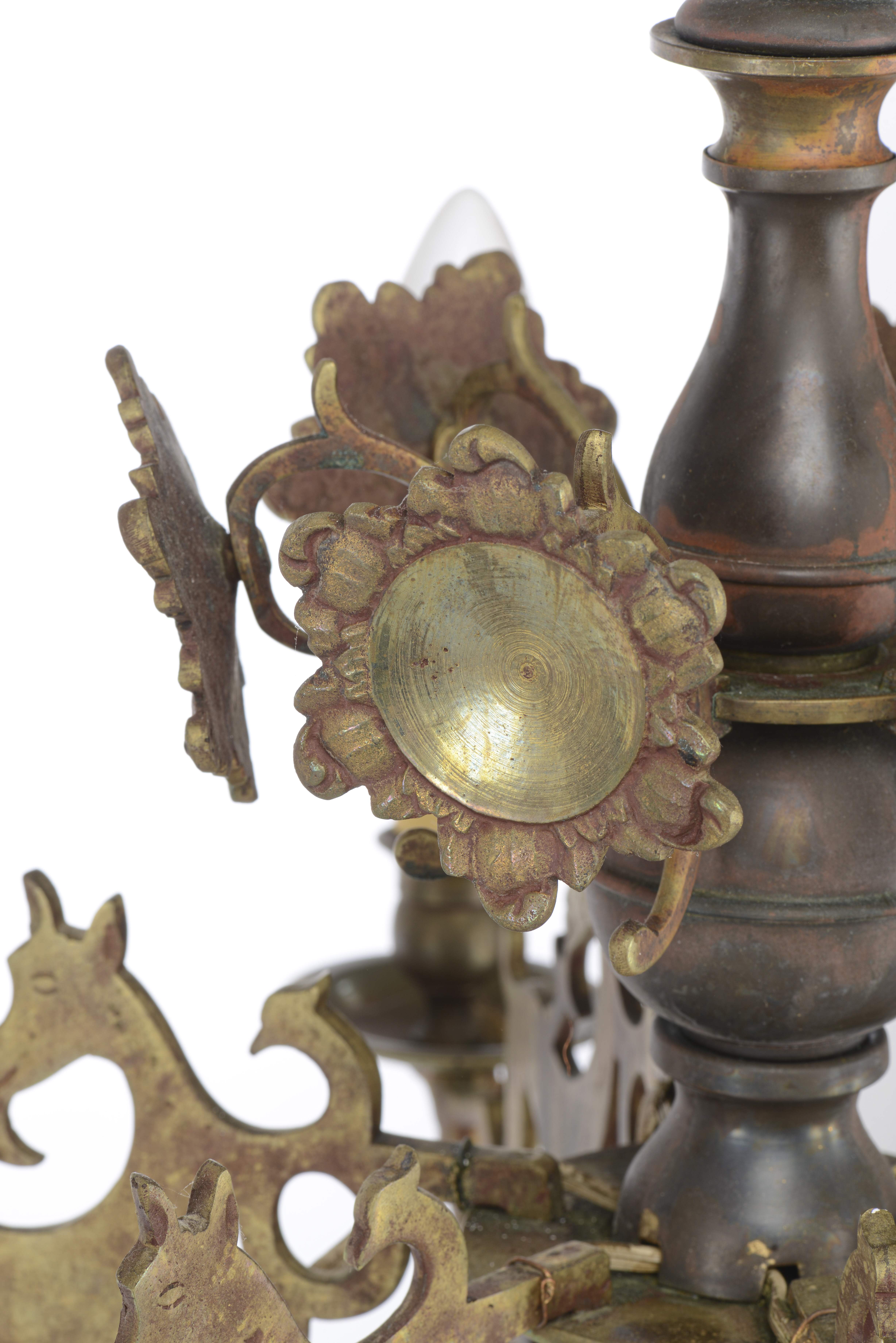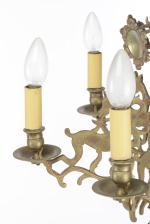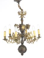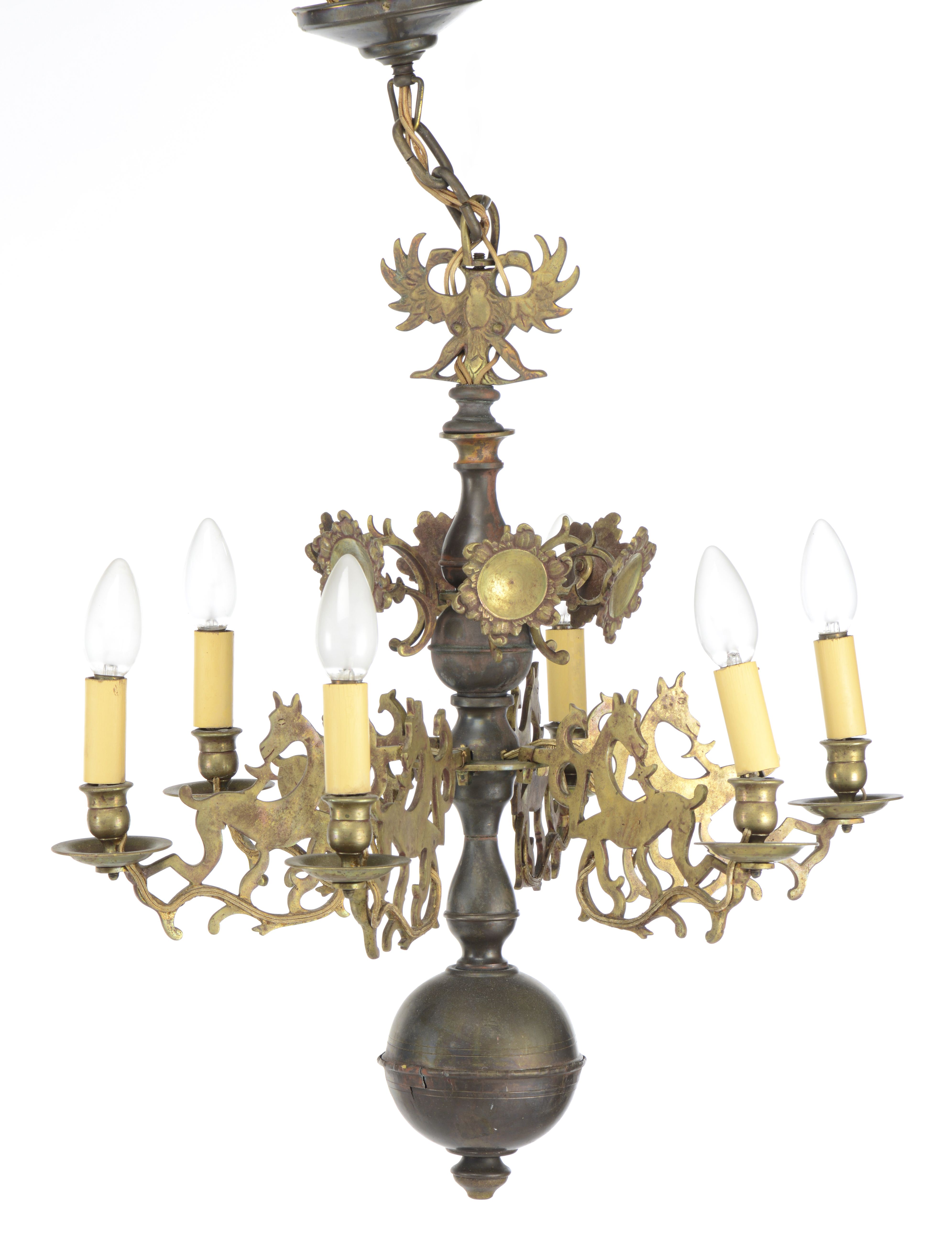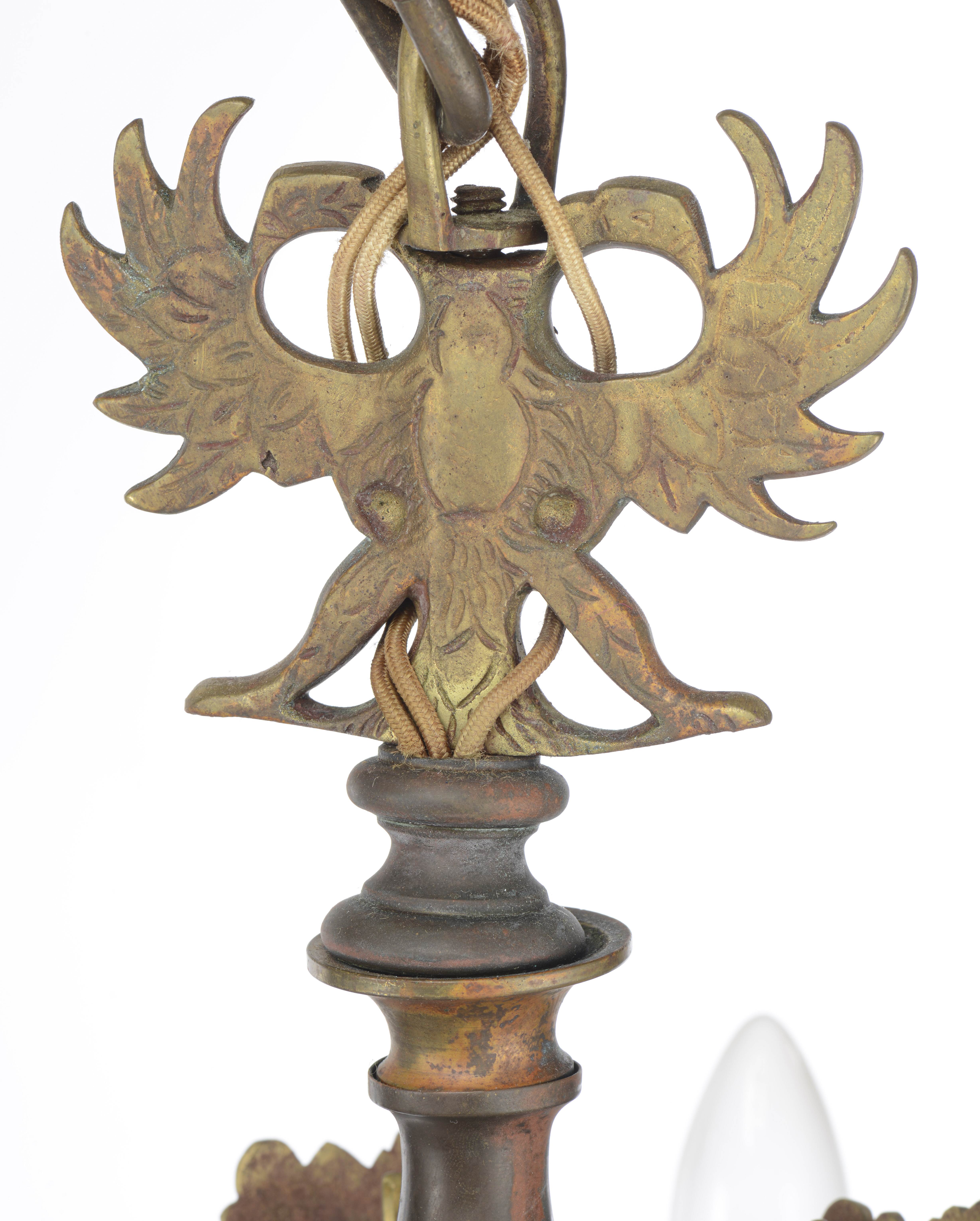 Lustre hollandais en bronze à six feux bras de lumière en forme de découpe de chèvre, registre supérieur à six fleurs de tournesol. Le fût central est surmonté d'un aigle à tête bicéphale sous l'accroche.