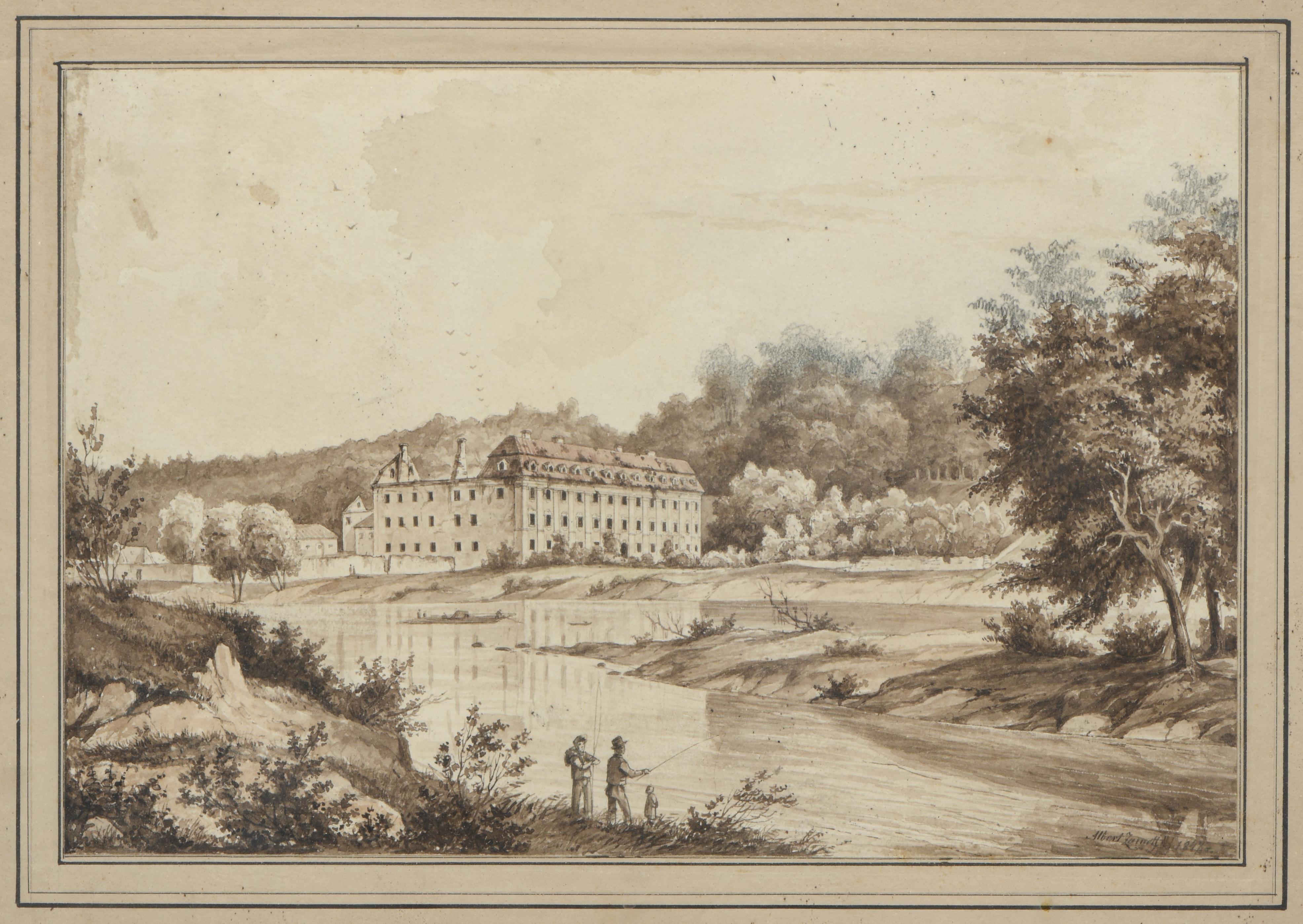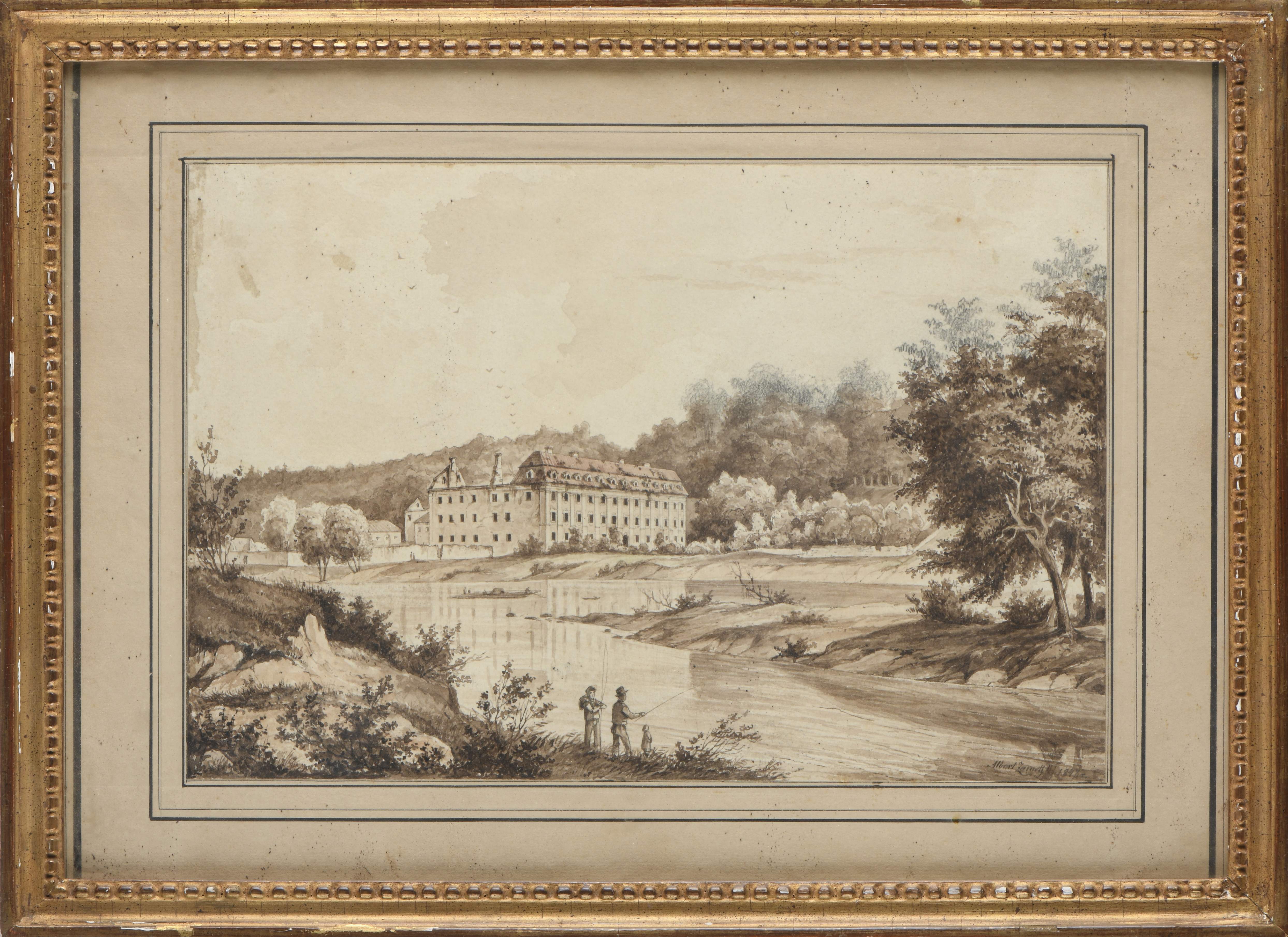 Albert ZAMETT(1821-1877) "Paysage romantique au bord d'une rivière avec pêcheurs", lavis et encre en sépia sur papier rehaussé au crayon, signé et daté 1847 en bas à droite.