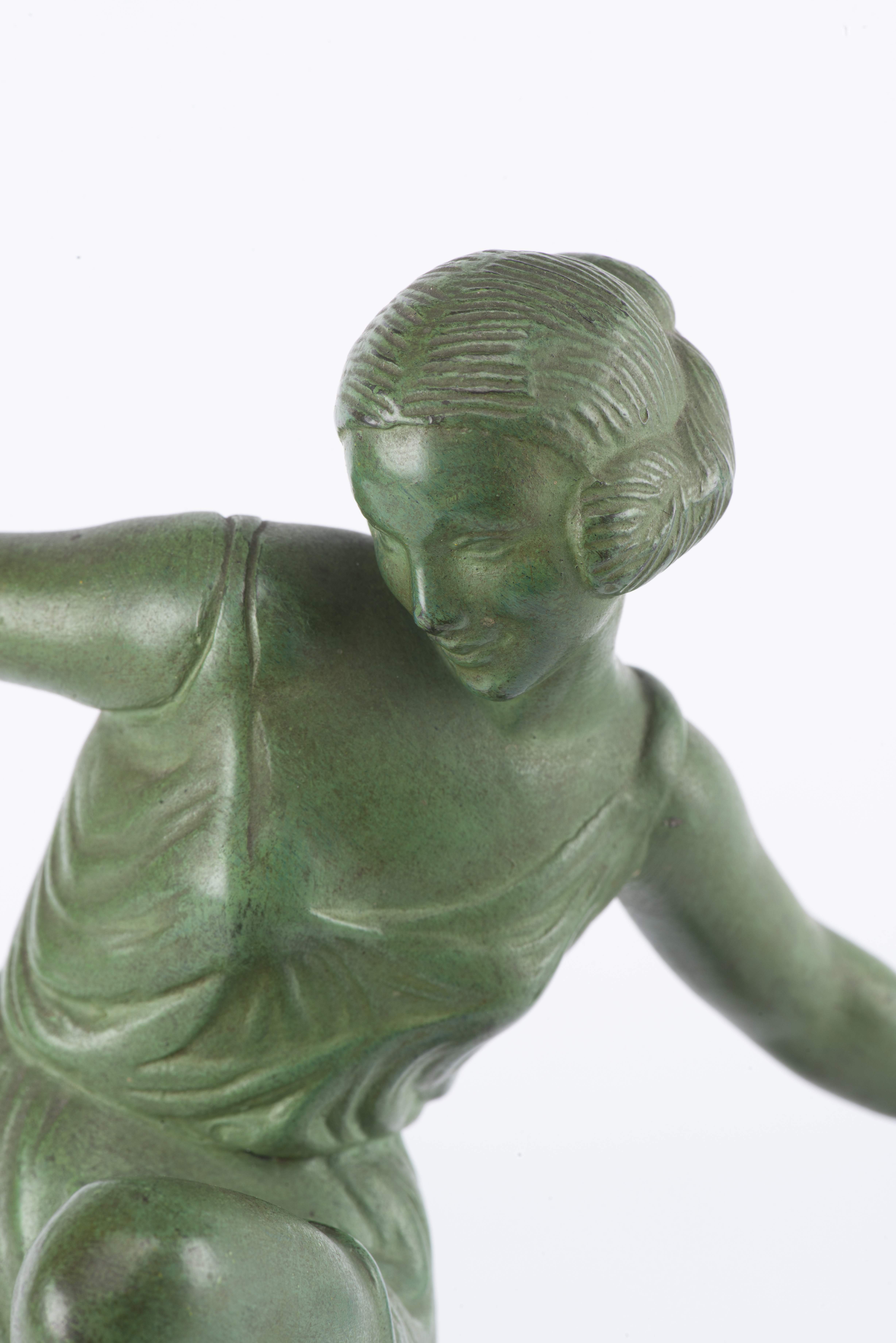 Pierre LE FAGUAYS (1892-1962) "La danseuse aux cymbales" en régule sur un socle de la Vallée d'Aoste en jaspe vert du Montblanc, signé de son pseudonyme FAYRAL