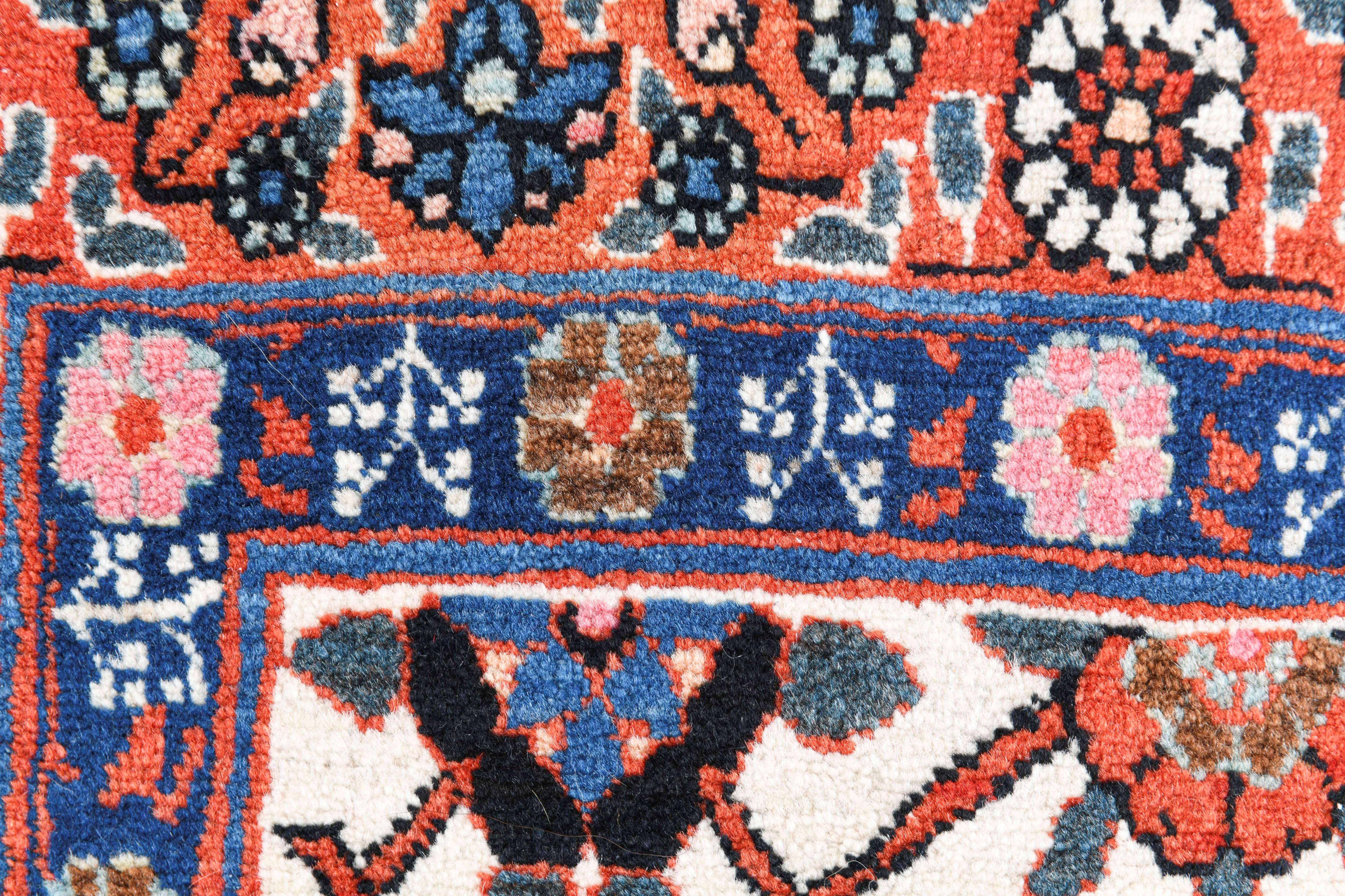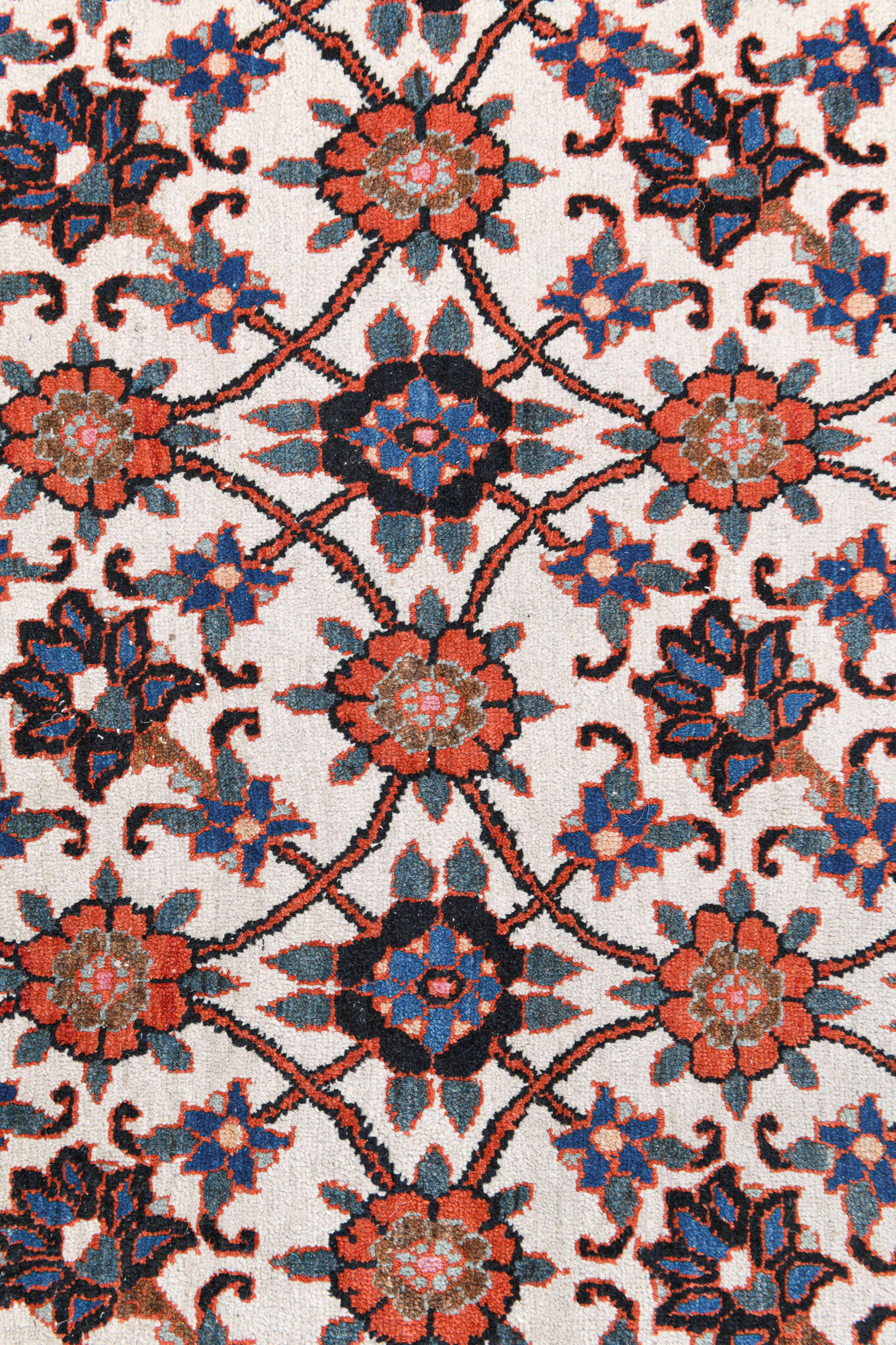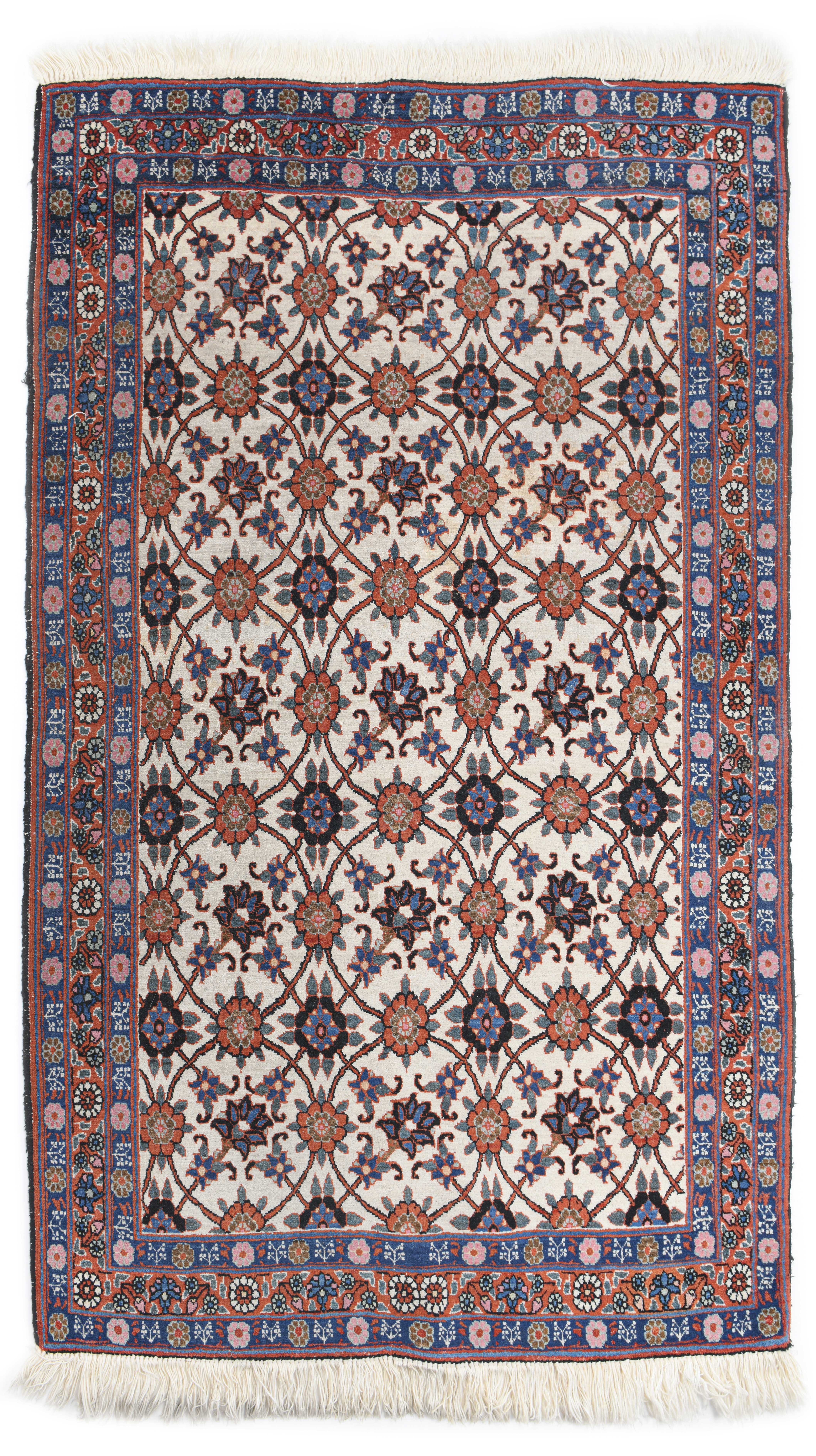 Tapis Veramine à décor en treillis de fleurs sur champ principal beige, bordure principale médiane à décor floral sur champ rouge entre deux bordures de fleurs sur champ bleu. Ancien.