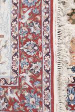 Tapis Sérafian à décor central de personnages dégustant des fruits dans un jardin fleuri, sur un champ principal beige, bordure principale à frise de lotus et oiseaux sur champ rouge, signé sur le Kilim en bas au milieu. XXe