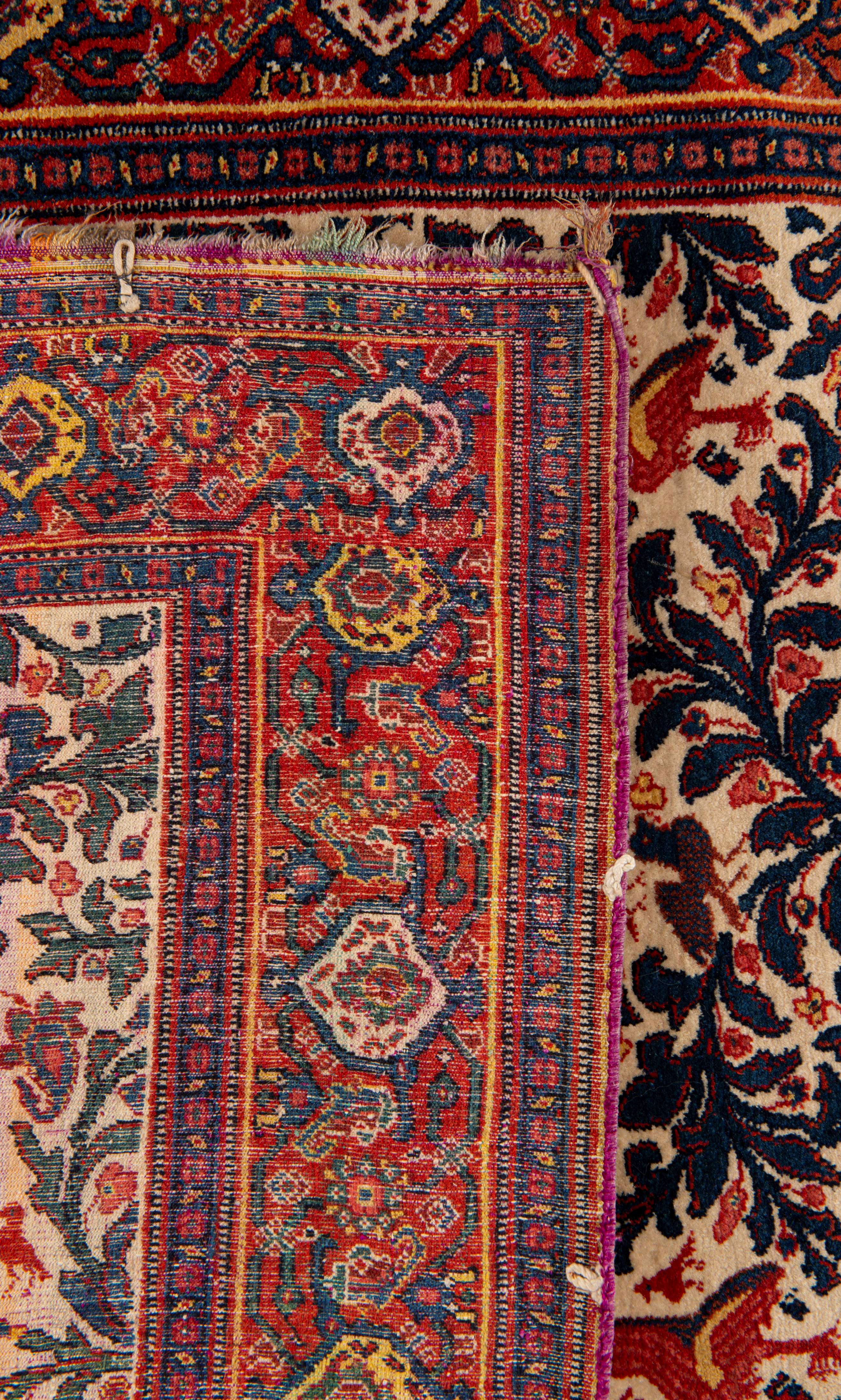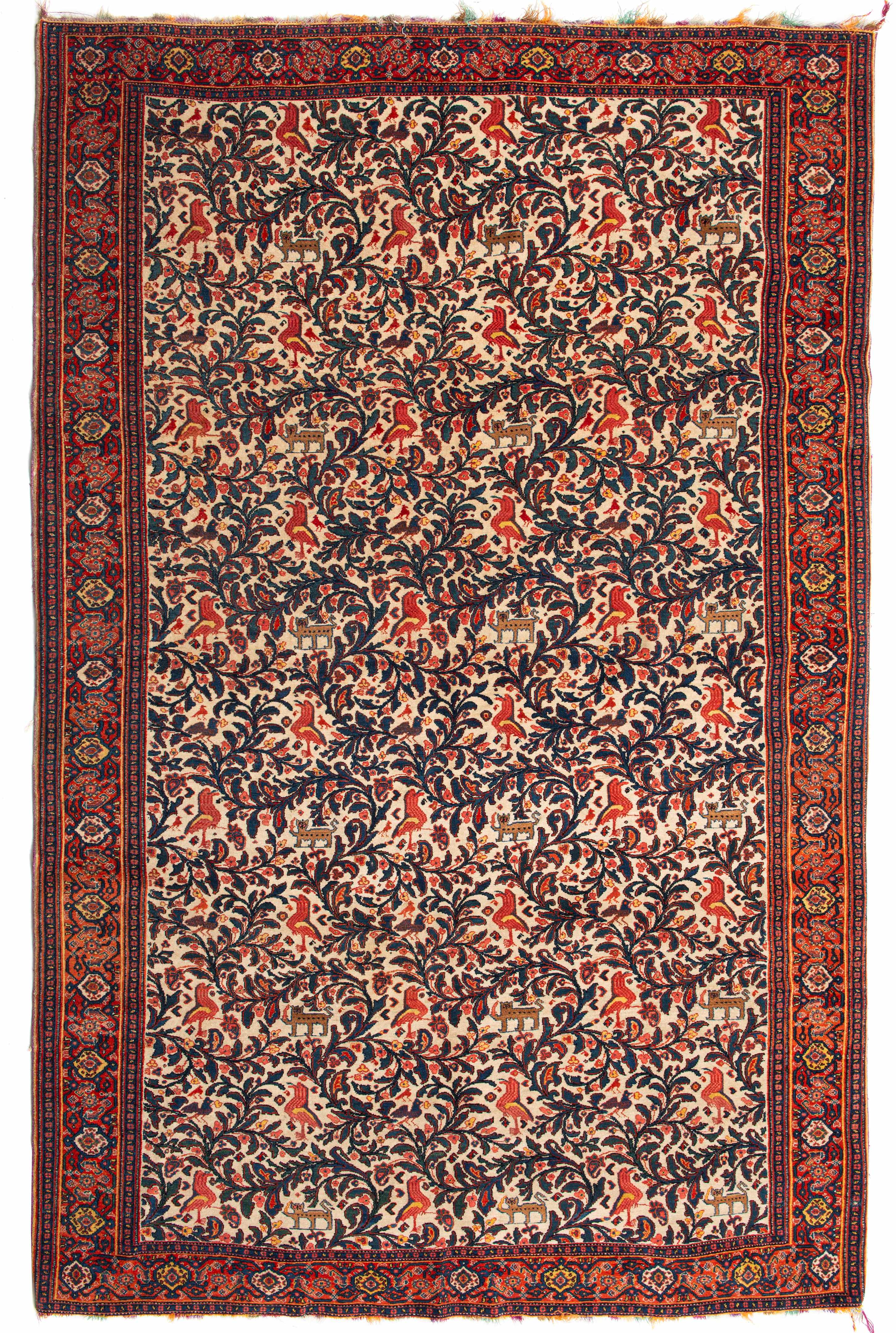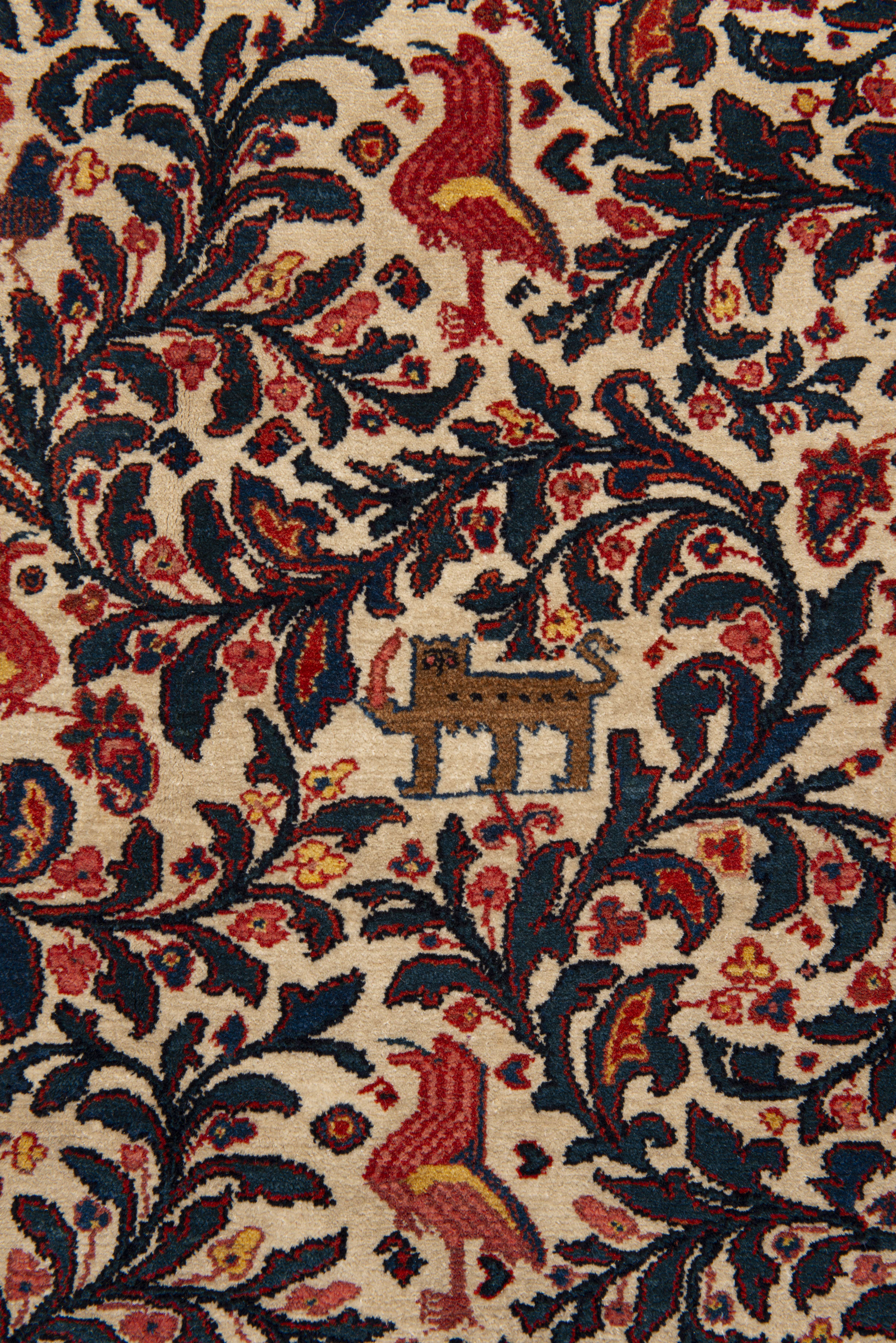 Tapis Hereke ancien en laine à champ principal beige et décor de rinceaux de feuilles et fleurs parsemés d'oiseaux et de chats. Bordure principale d'une frise florale sur champ rouge.