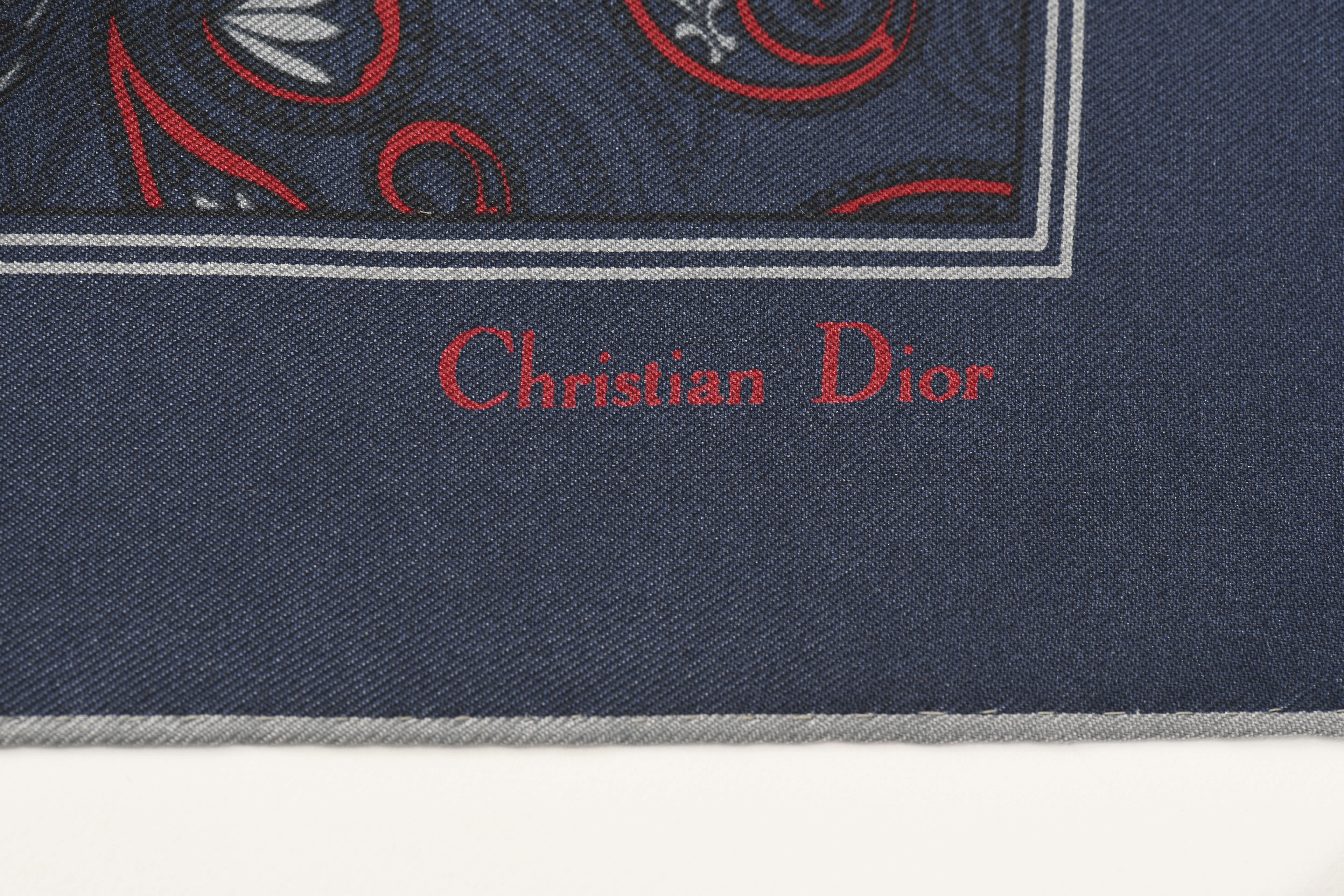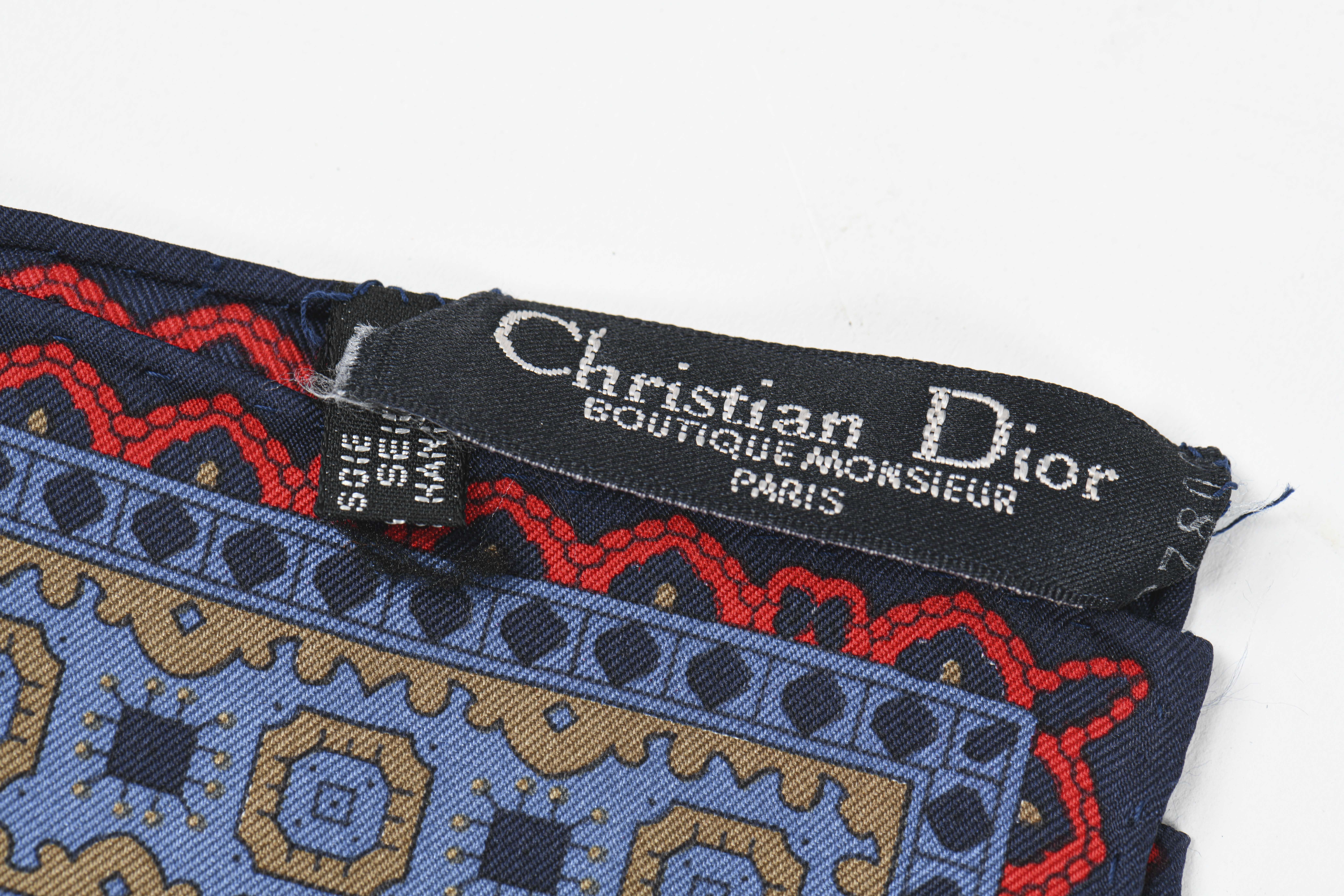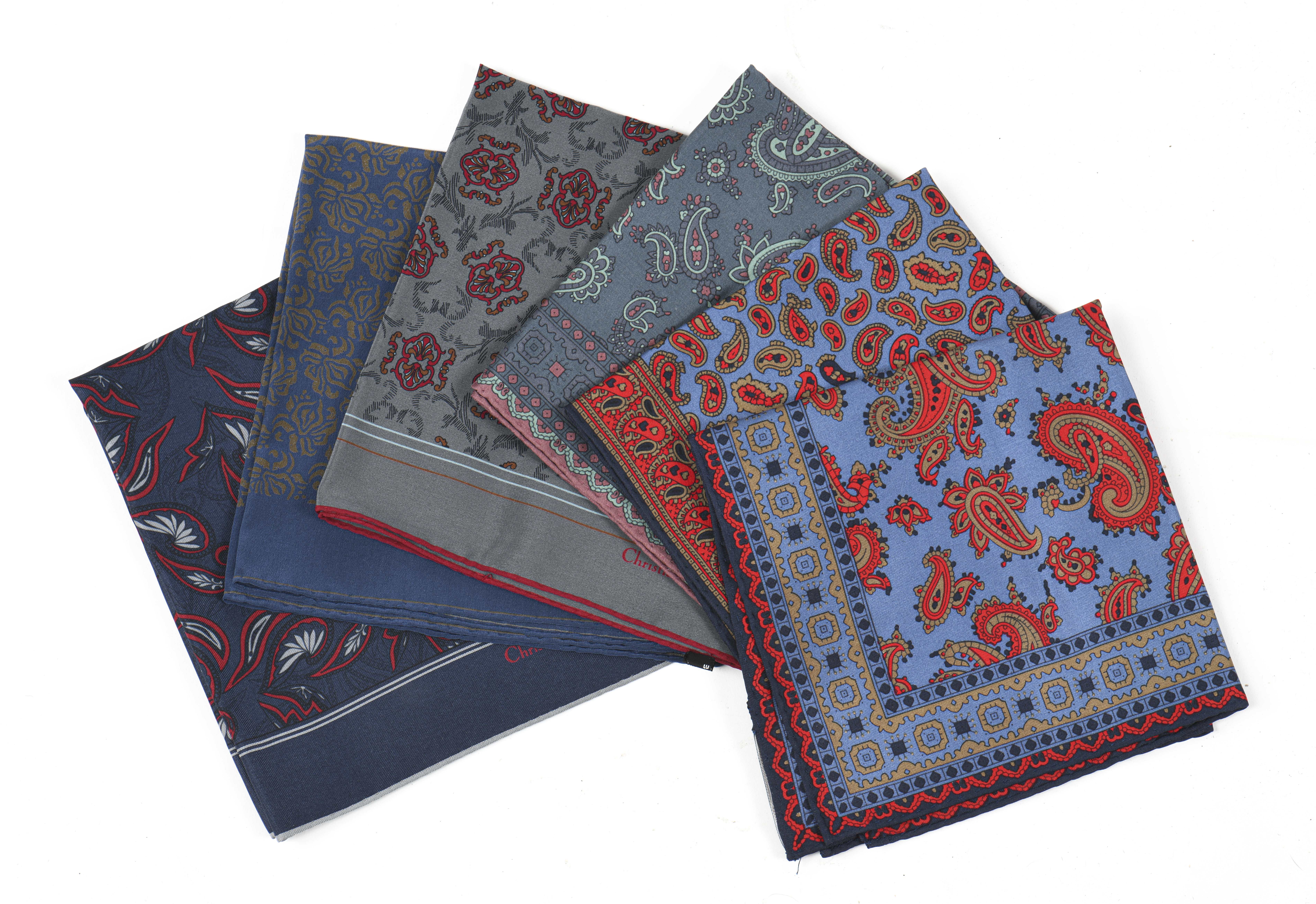 Christian DIor, lot de six pochettes en soie à motifs paisley, dans les teintes de bleu, gris et rouge, trois petites et trois grandes.