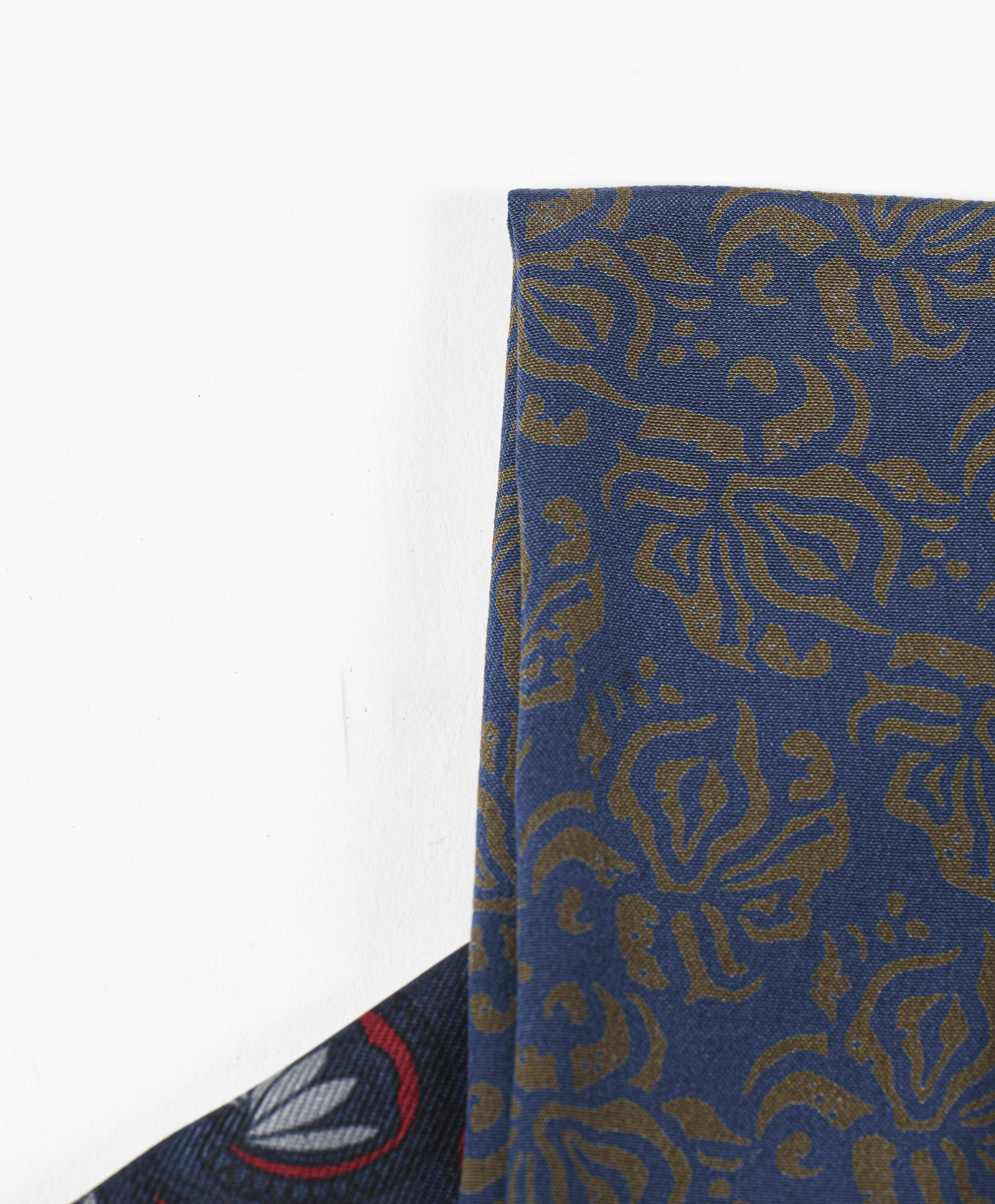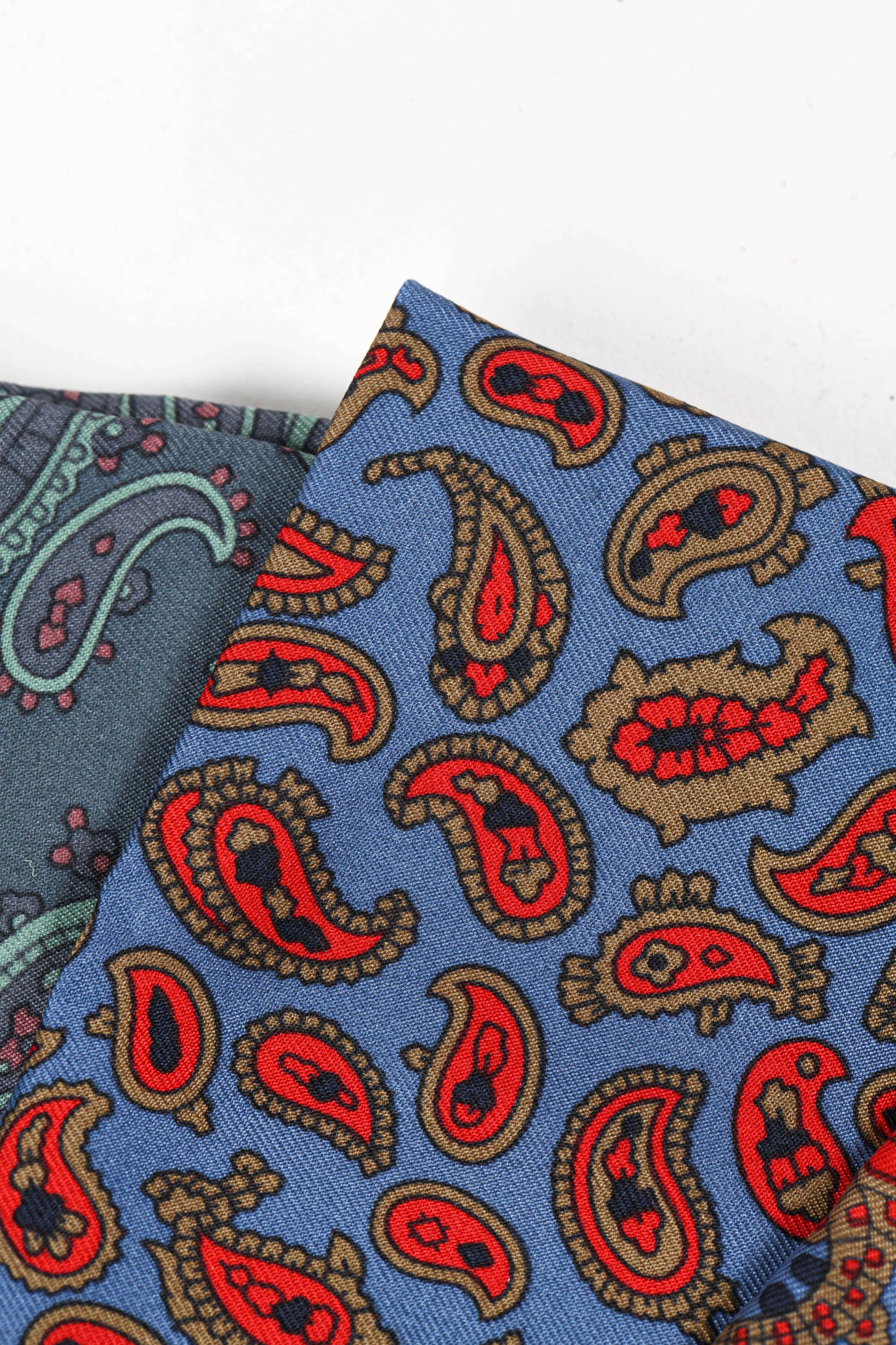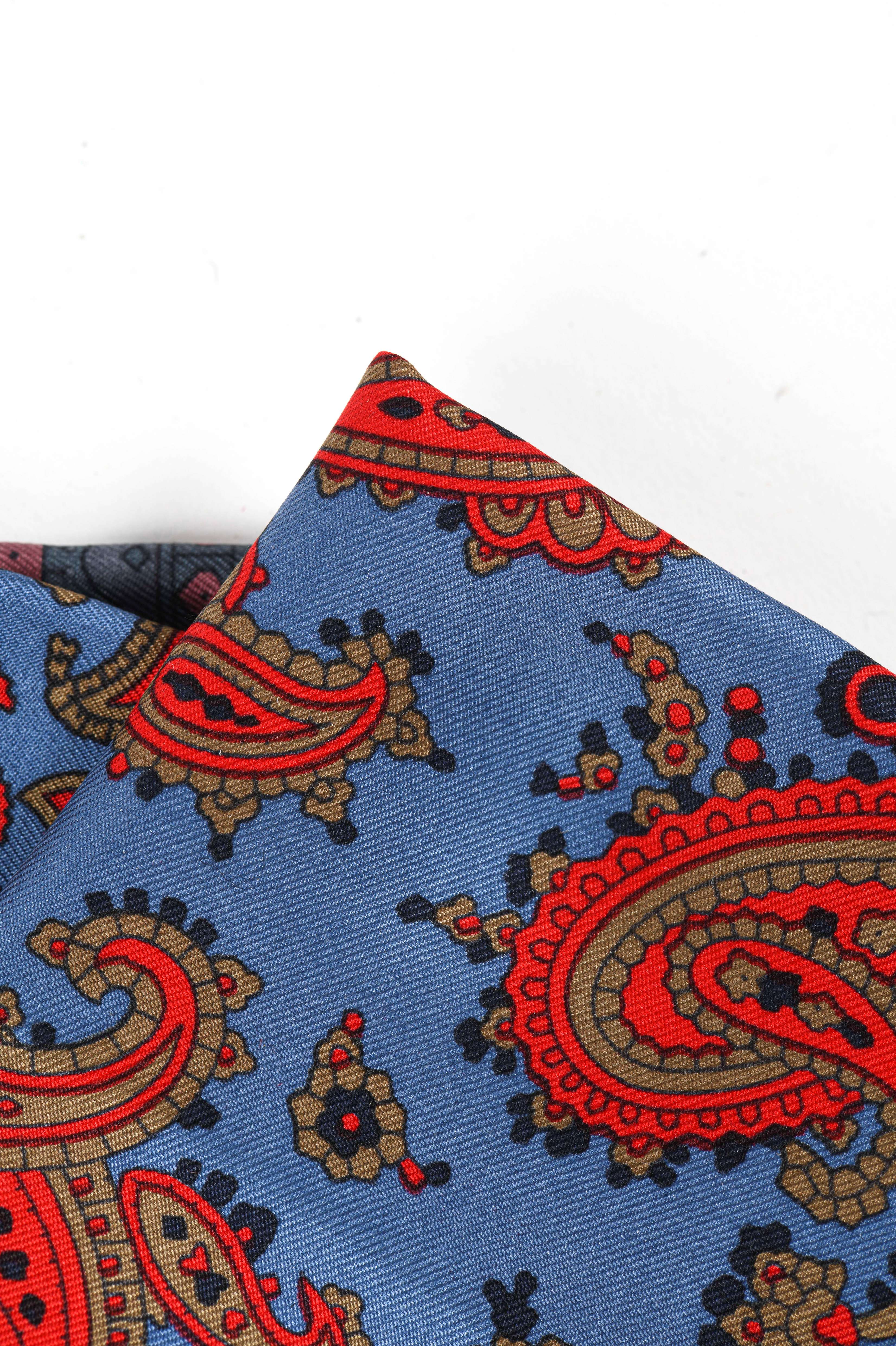 Christian DIor, lot de six pochettes en soie à motifs paisley, dans les teintes de bleu, gris et rouge, trois petites et trois grandes.