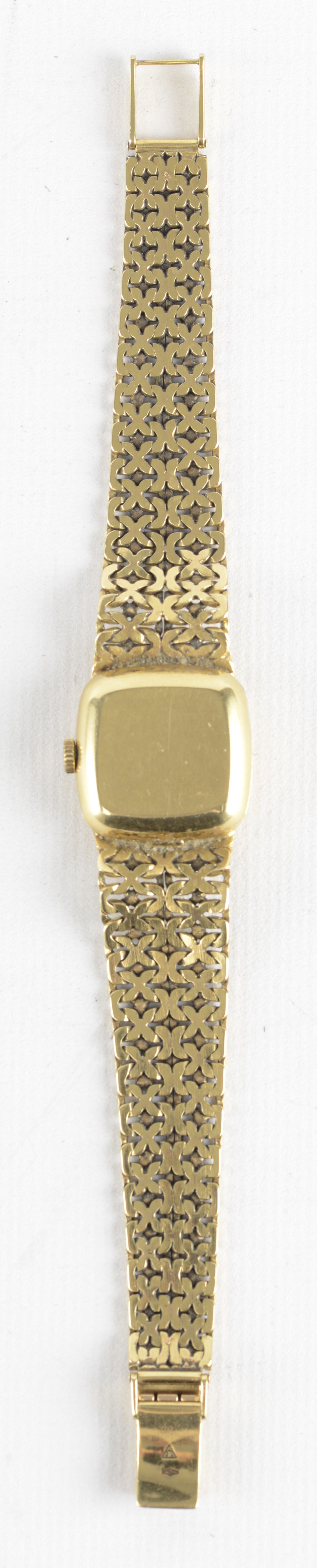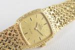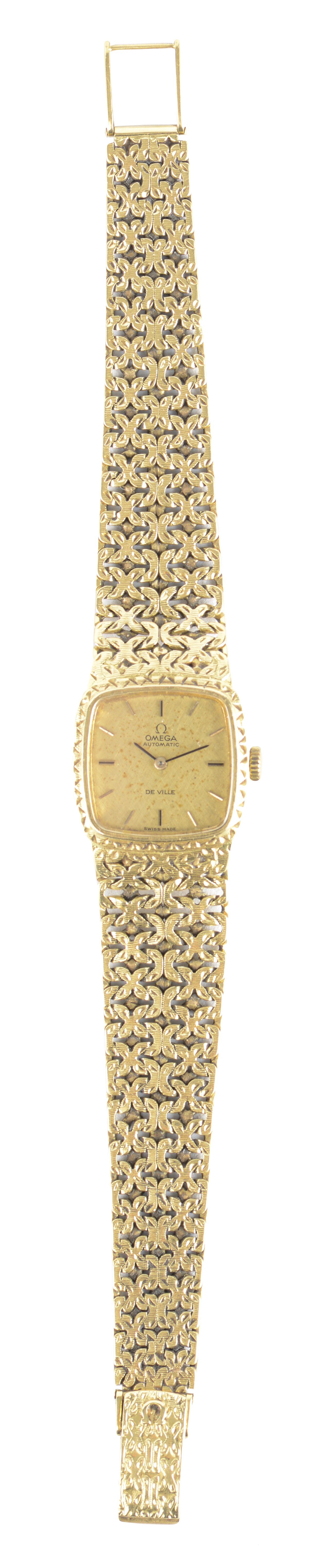 Omega De Ville, montre-bracelet de femme automatique, en or jaune 750, 18k, cadran doré à bâtons également dorés, aiguilles bâtons, bracelet milanais à maillons texturés avec le numero 1111.