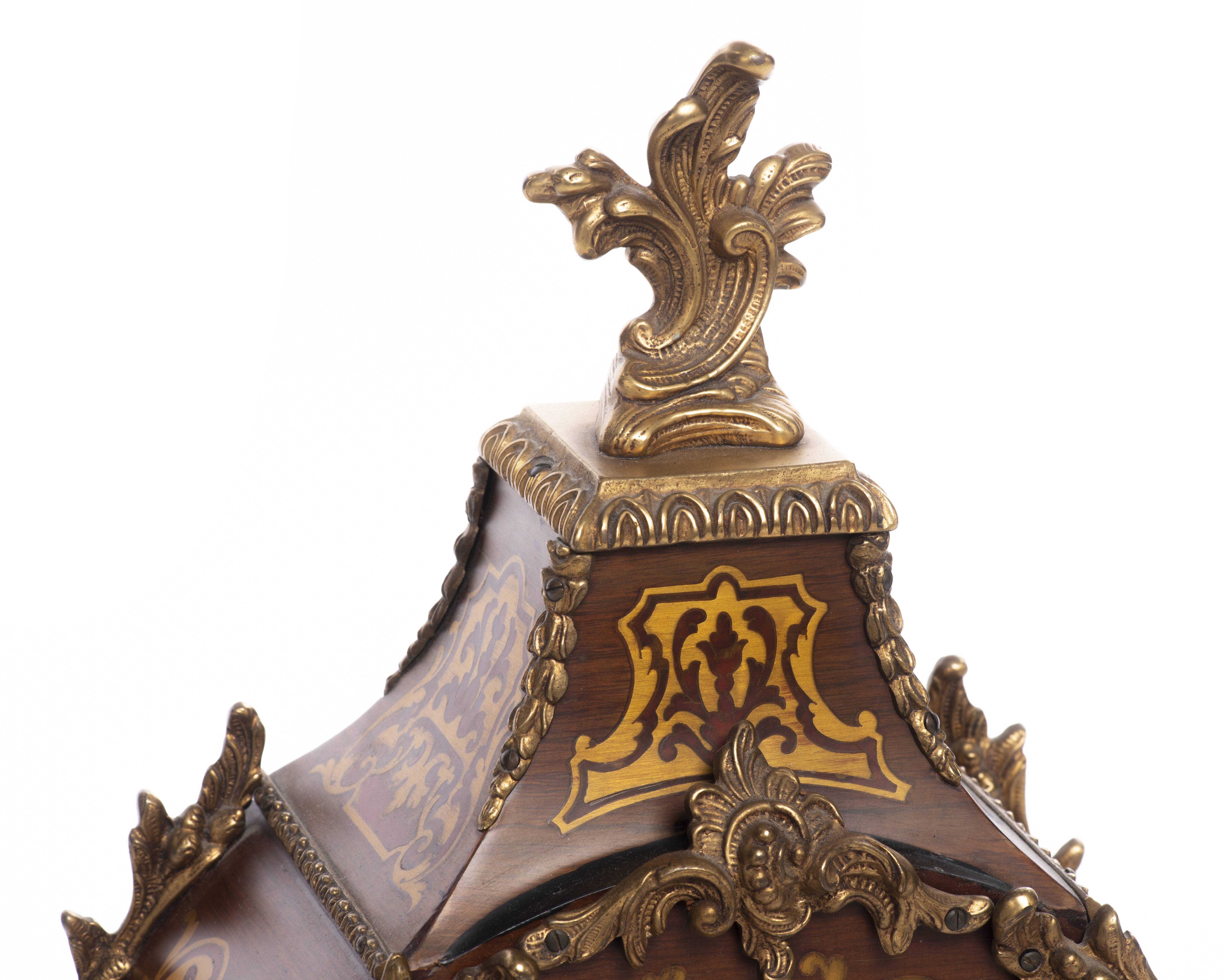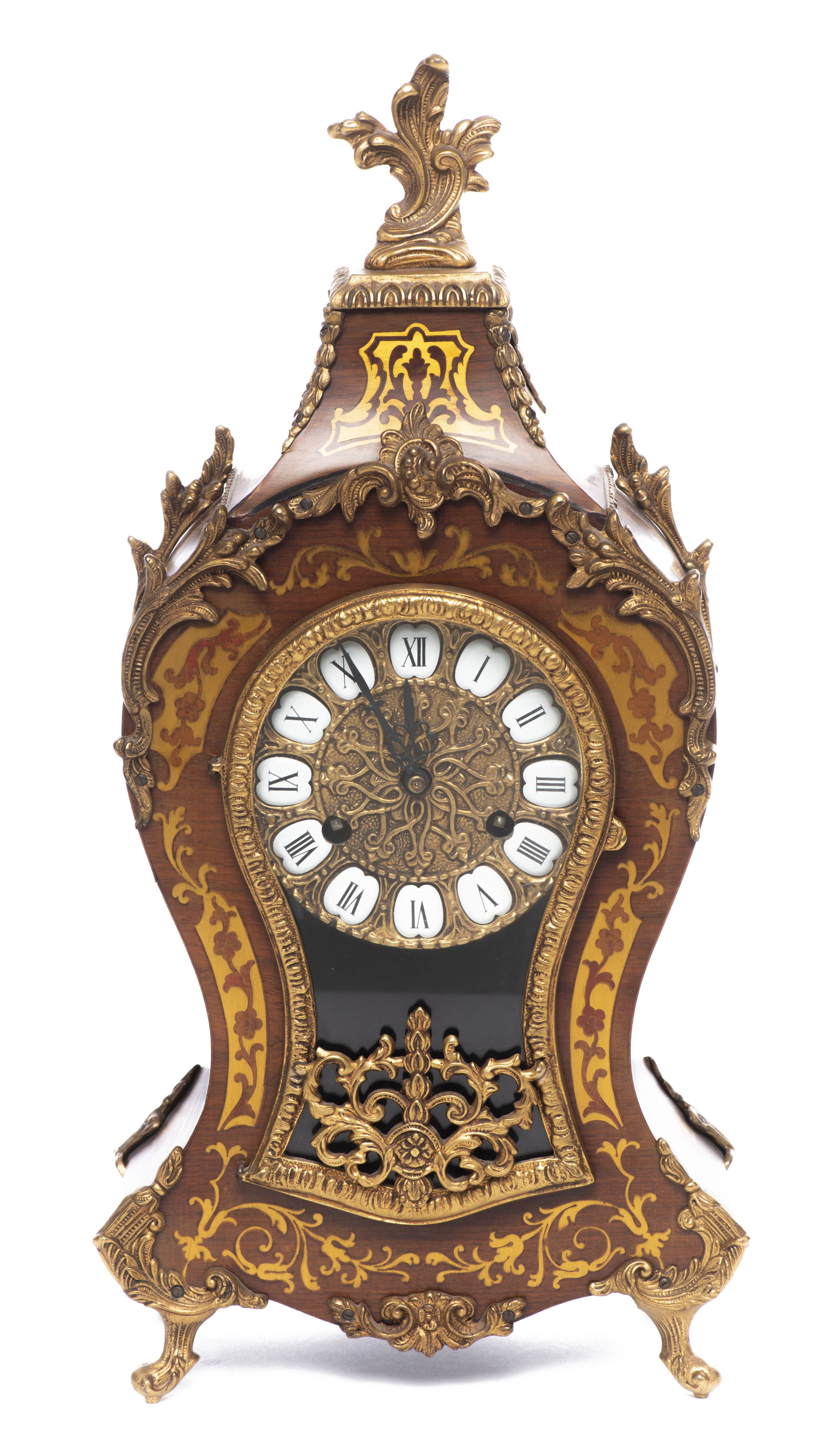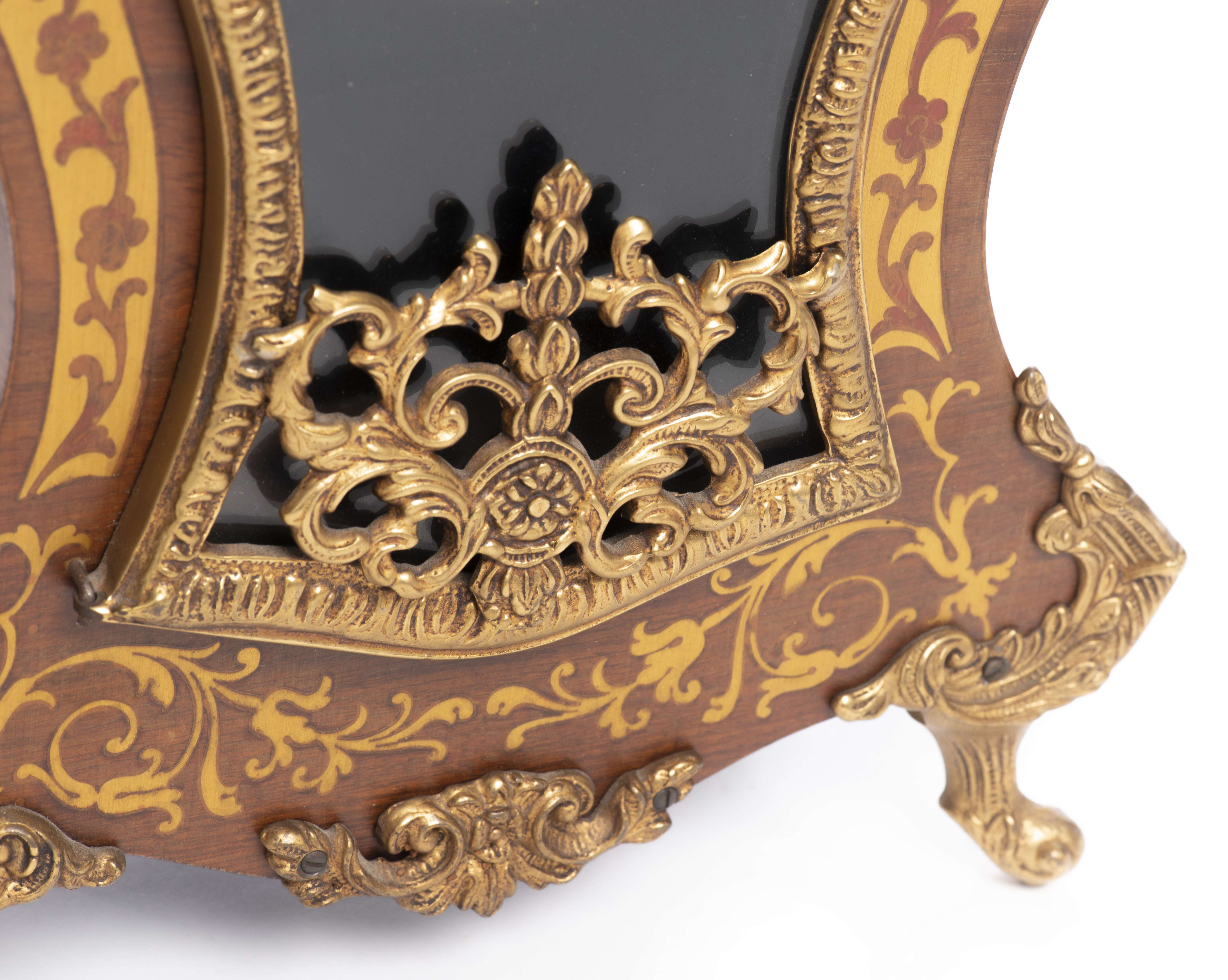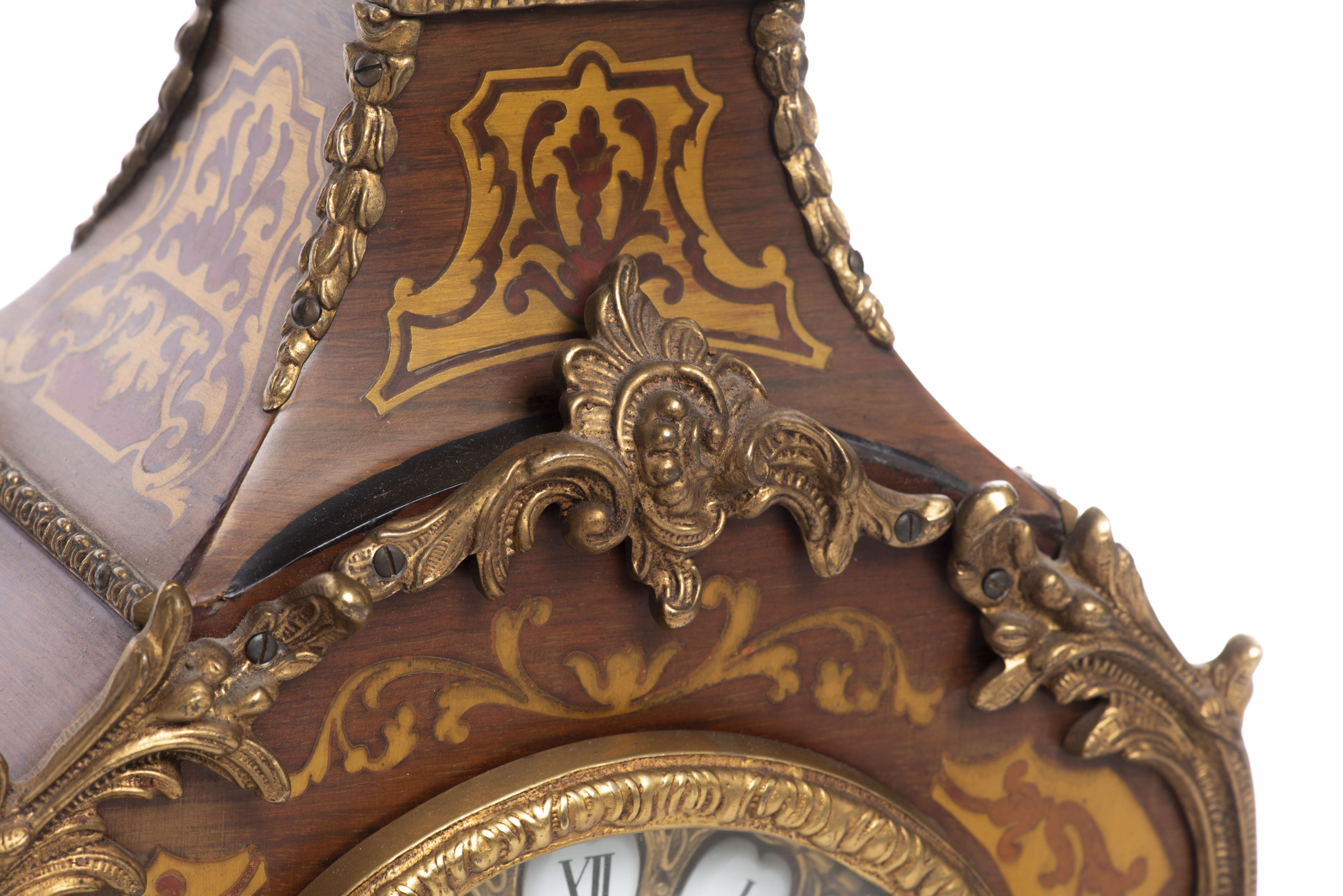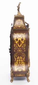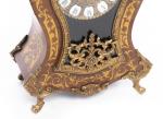 Pendule de type neuchâteloise à décor en marqueterie de laiton de feuillages et ornementations en bronze doré, chiffres romains sur fond émaillé et cadran en bronze doré.
