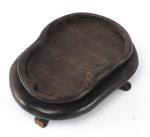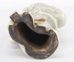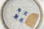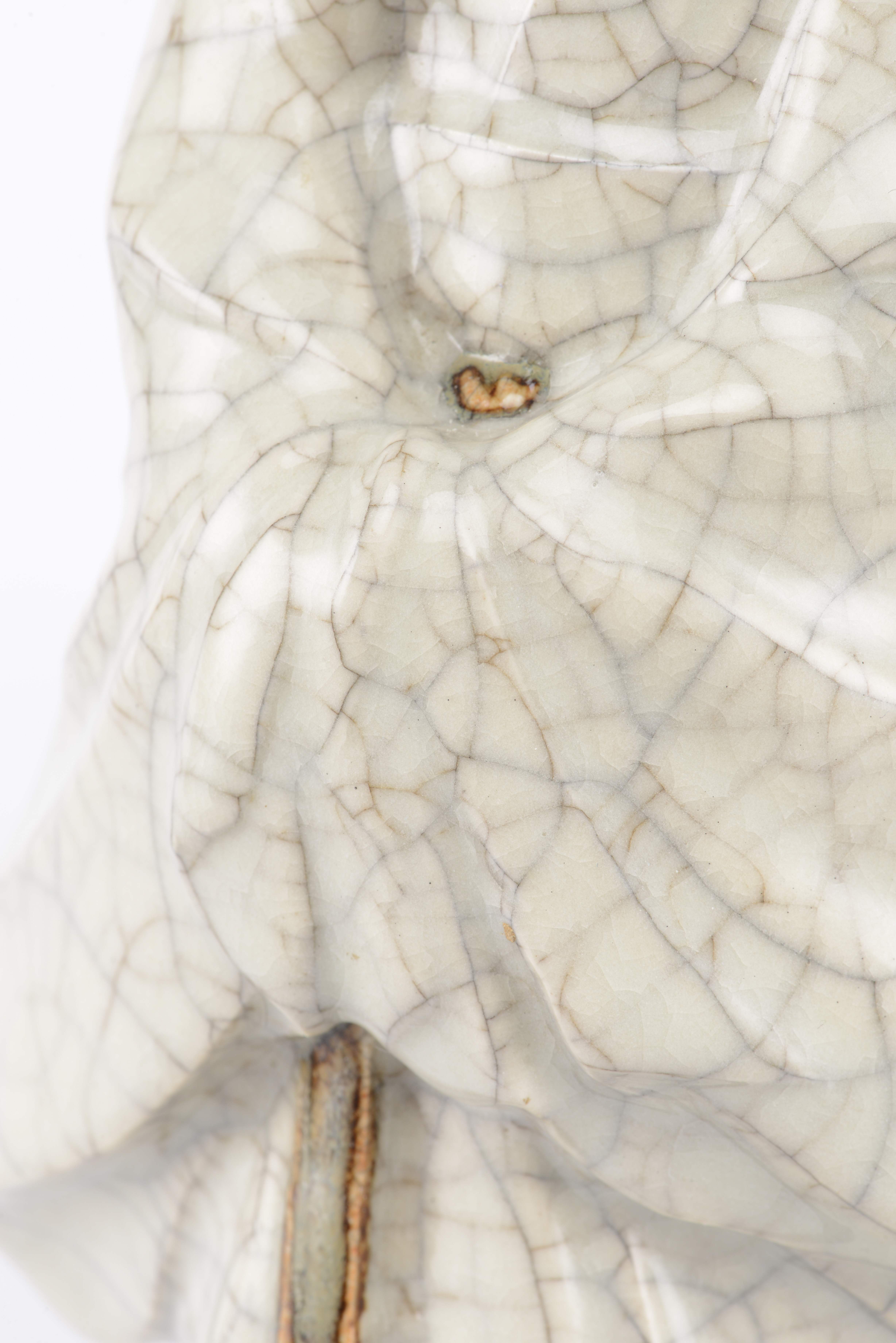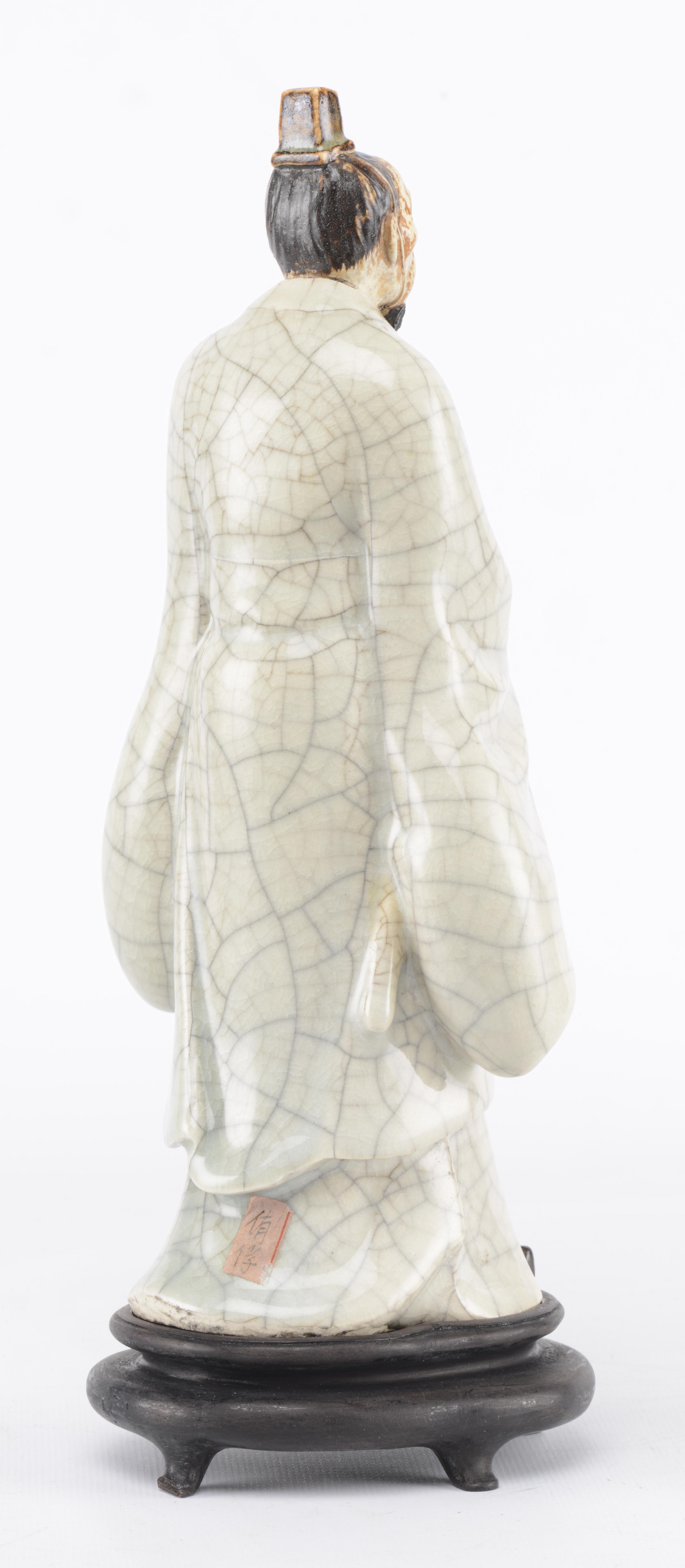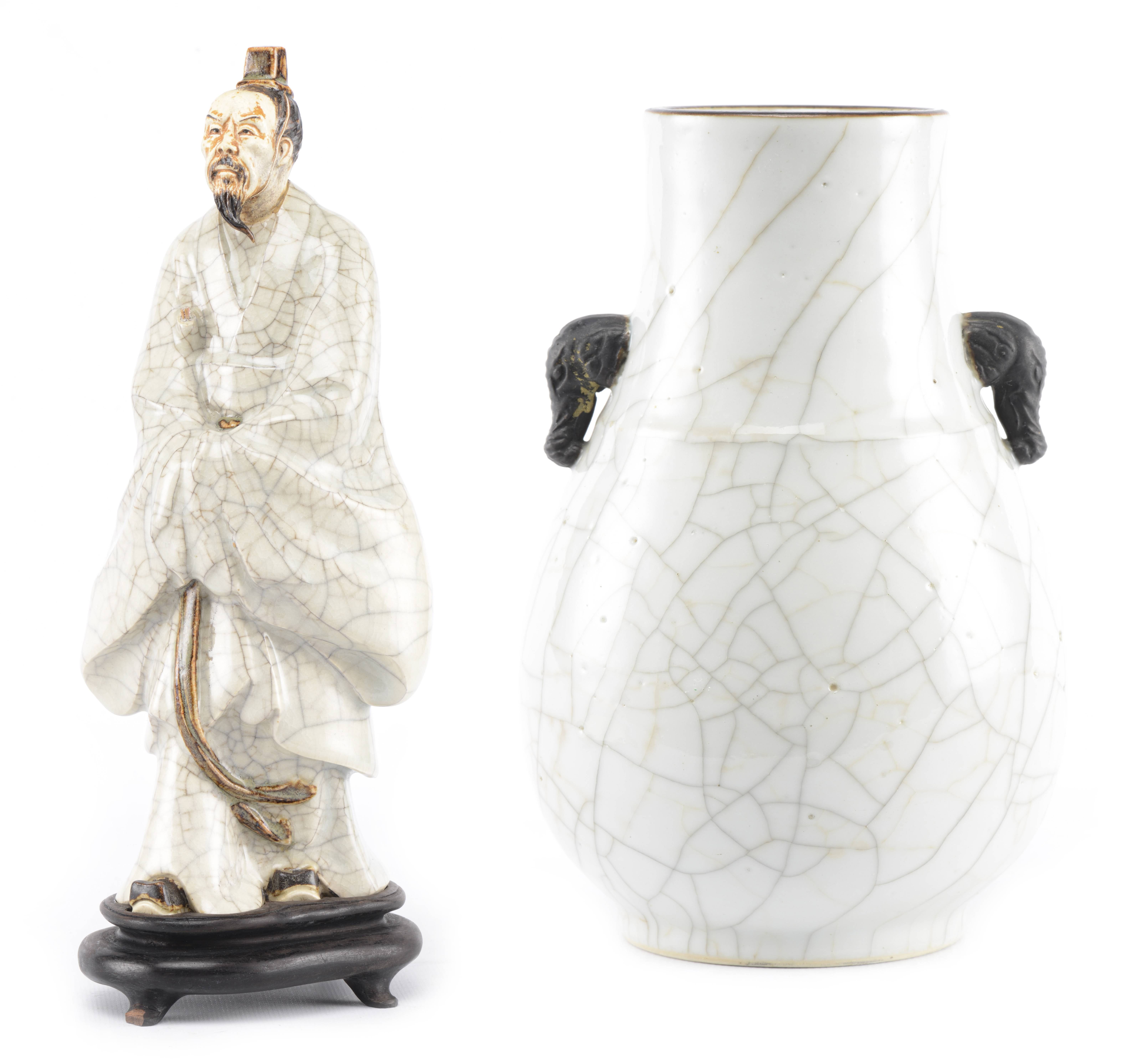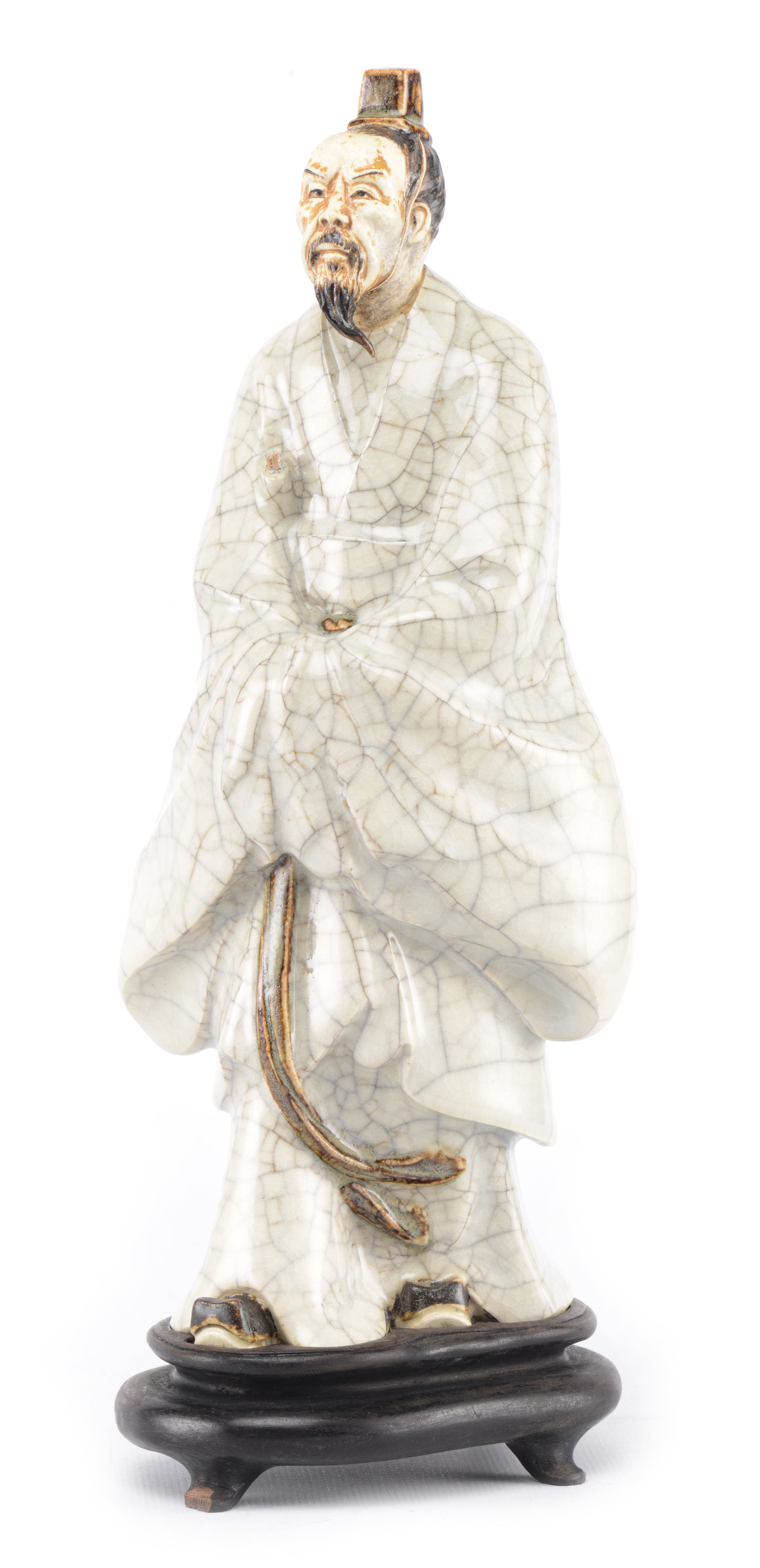 On y joint une statuette en porcelaine du Japon à couverte craquelée et engobe et glaçure à l'oxyde de fer représentant un homme barbu marchant coiffé d'un petit chapeau carré, inscrit au chiffre XVI à l'intérieur. Socle en bois.