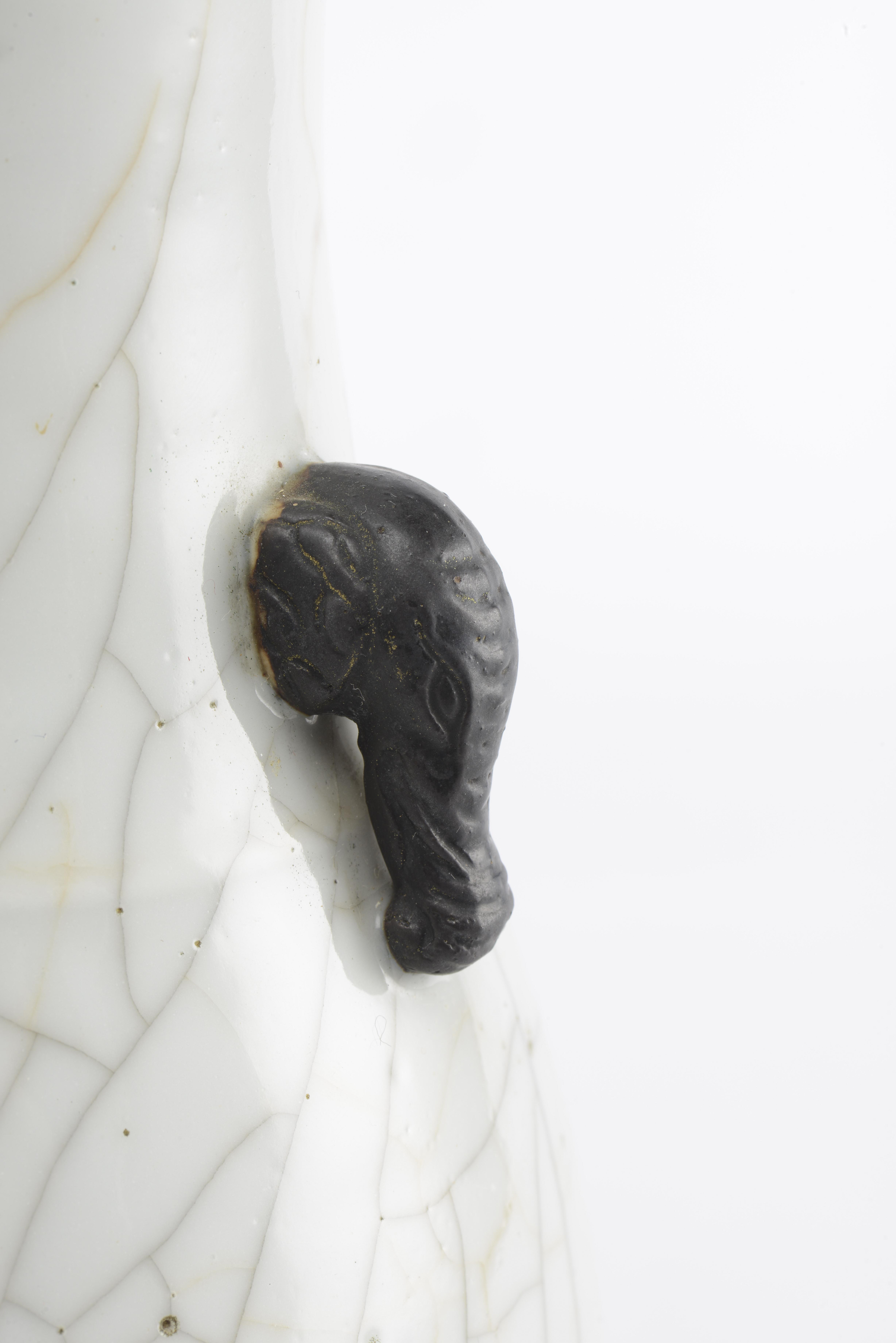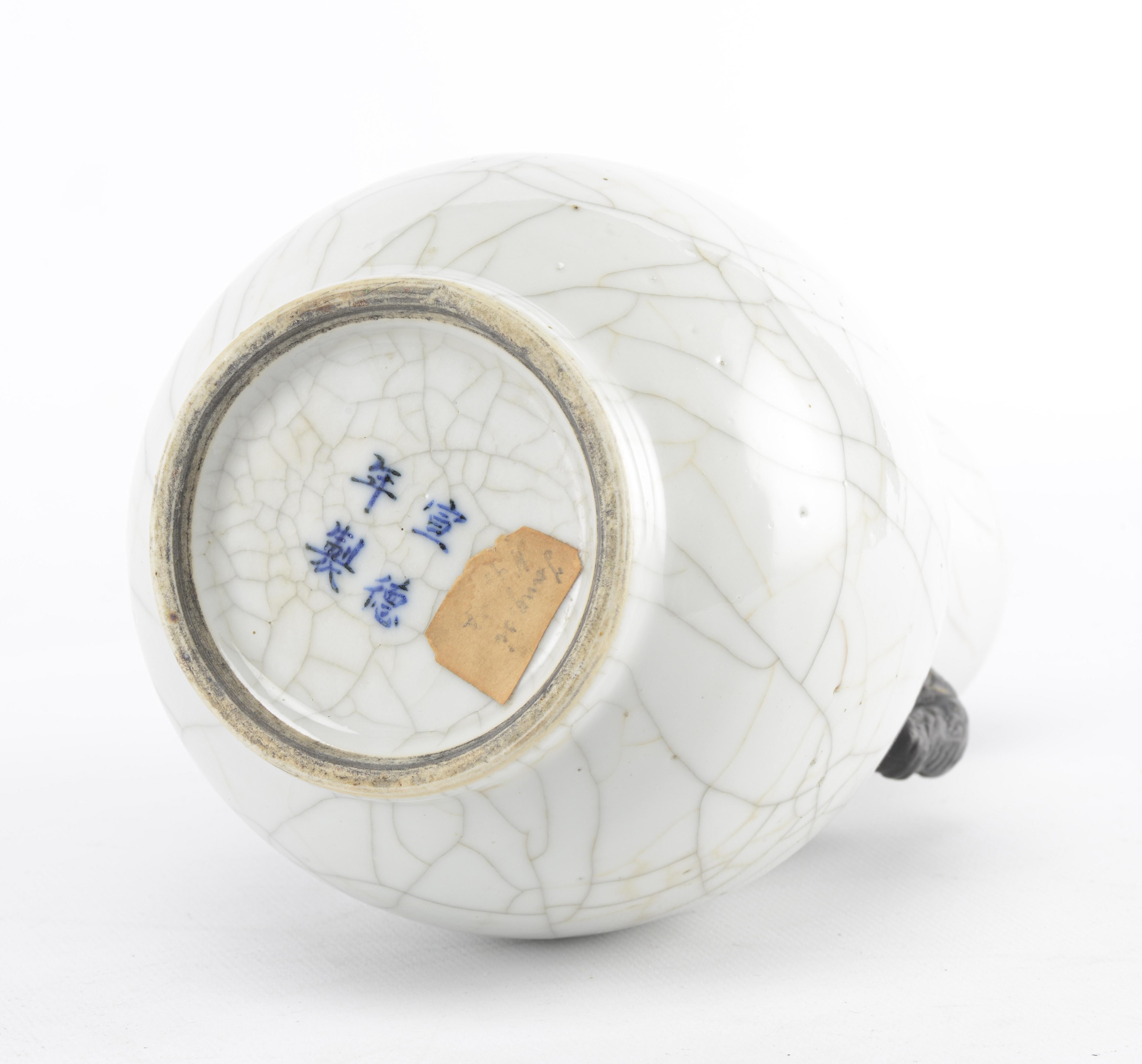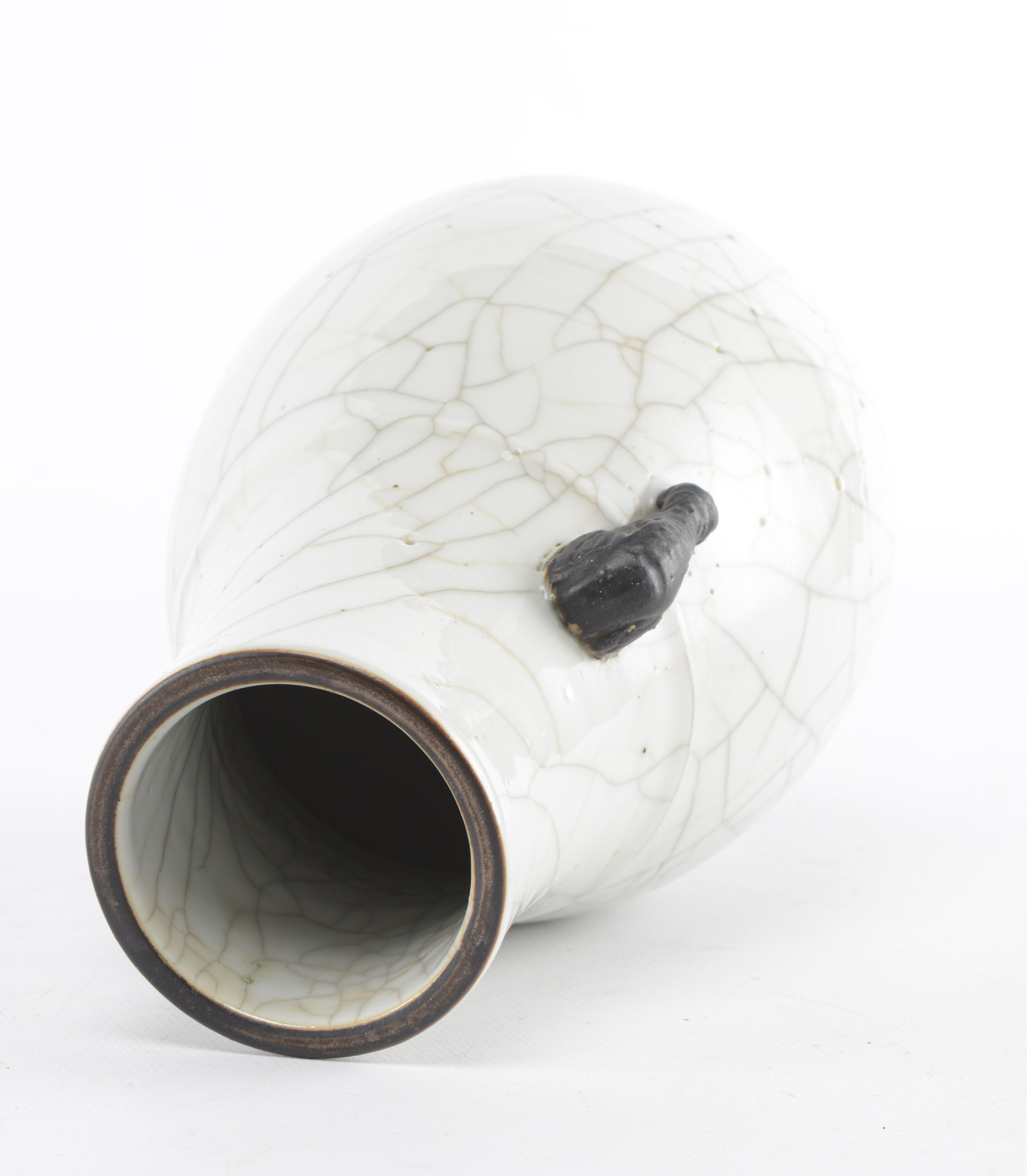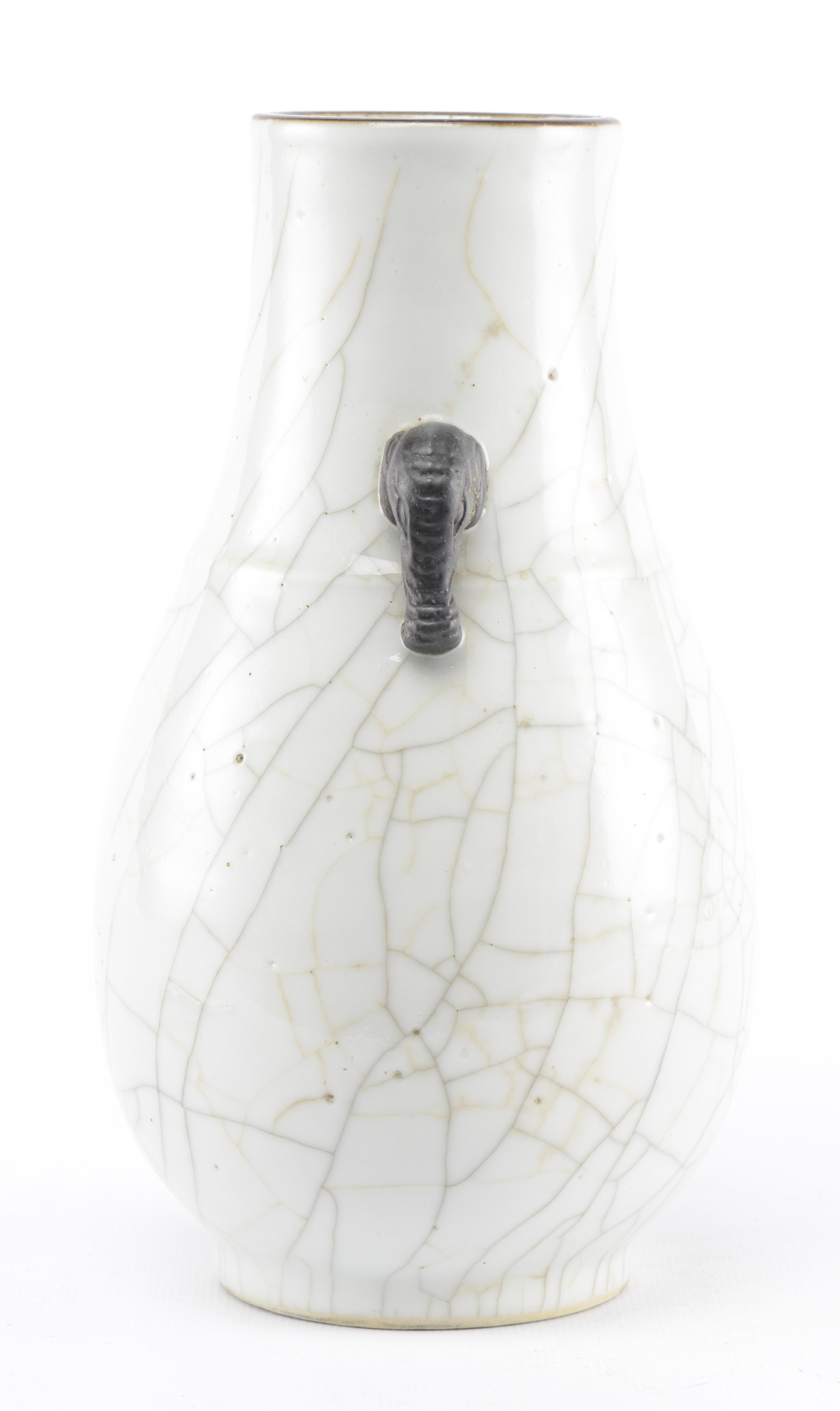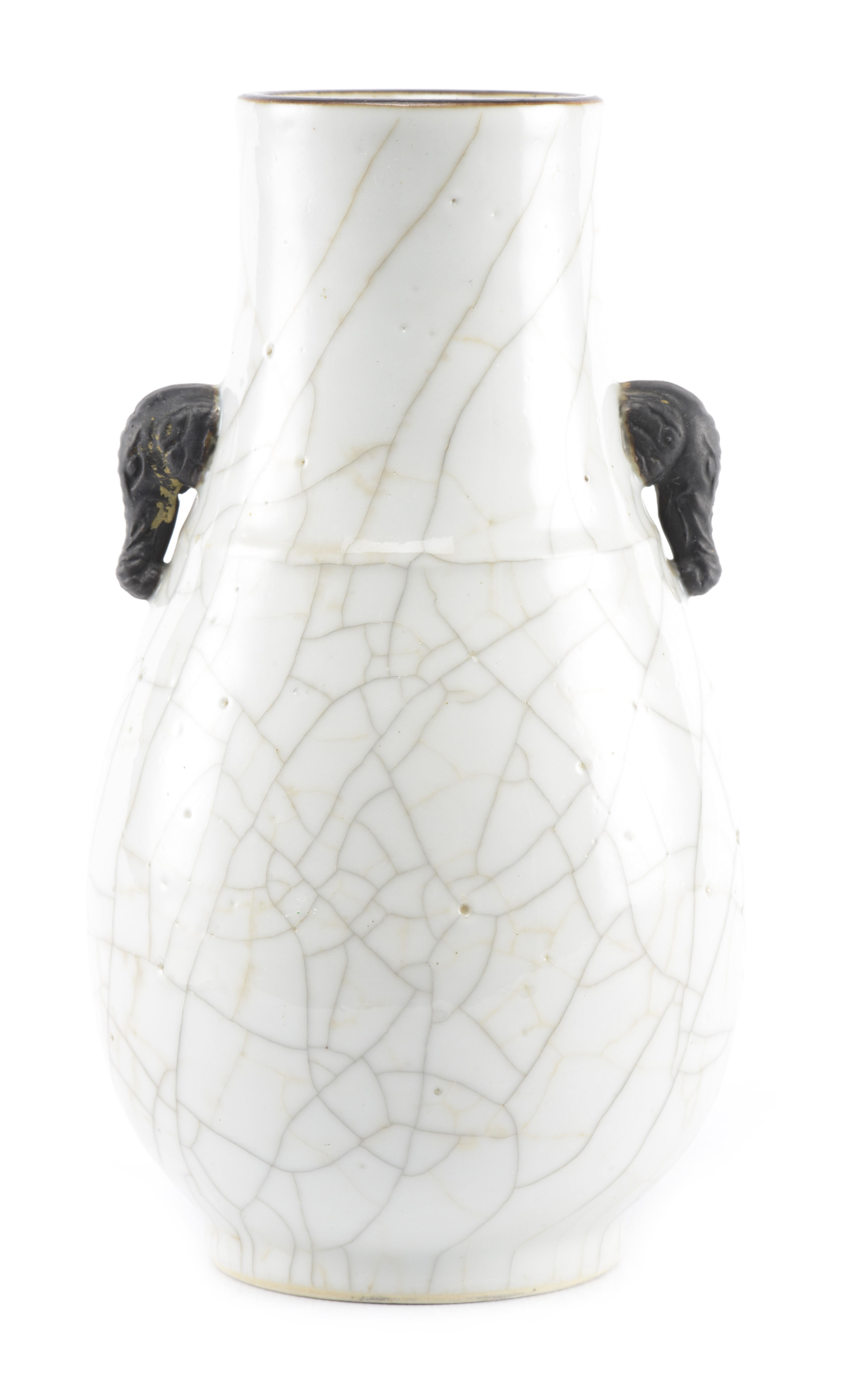 Vase Hu en porcelaine de Chine à couverte craquelée et deux anses en forme de têtes d'éléphant recouverte d'oxyde de fer, lèvre brune à engobe brune à l'oxyde de fer. Marque apocryphe sous la base en bleu sous couverte Xuande Nianzhi. Nankin fin des Qing .