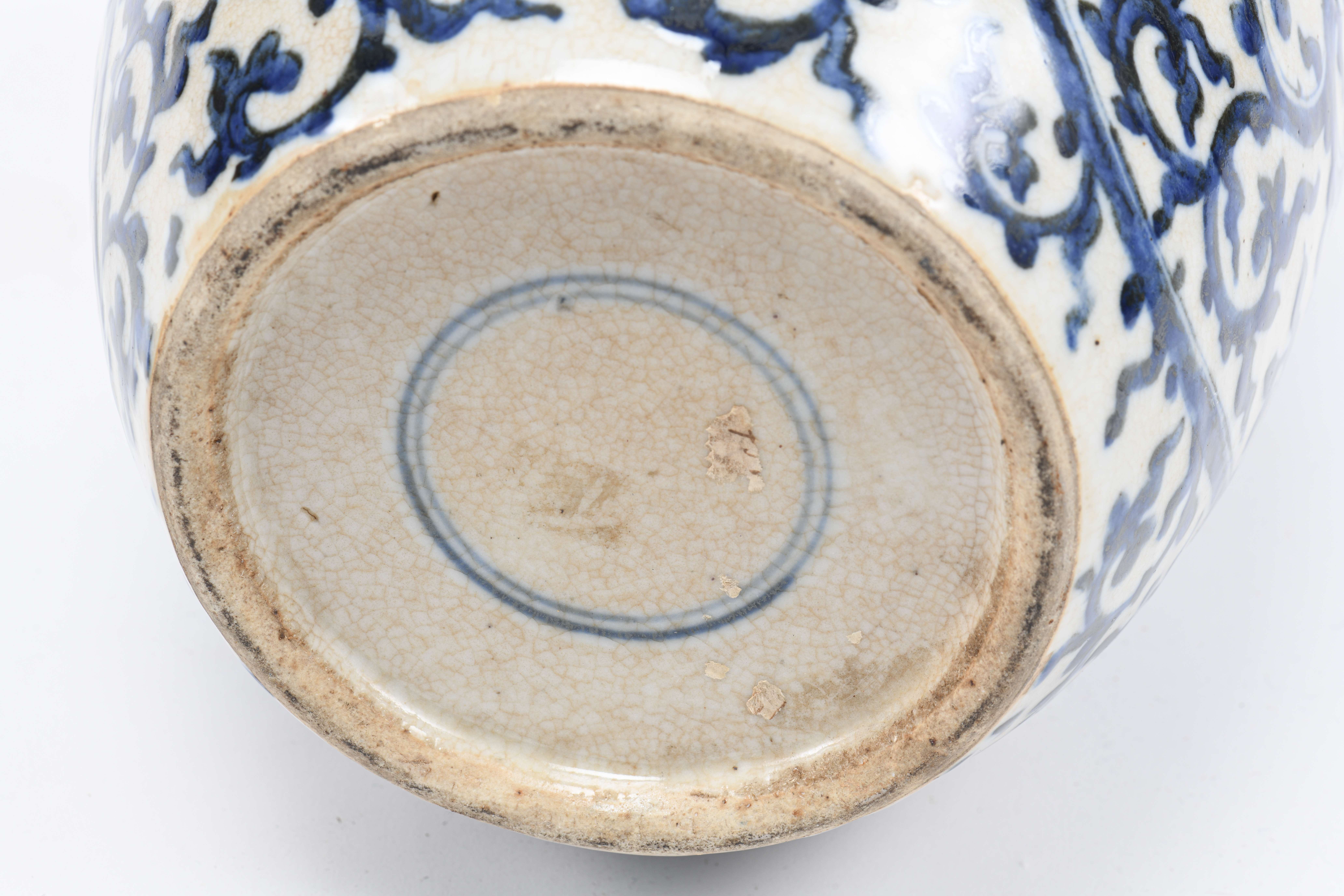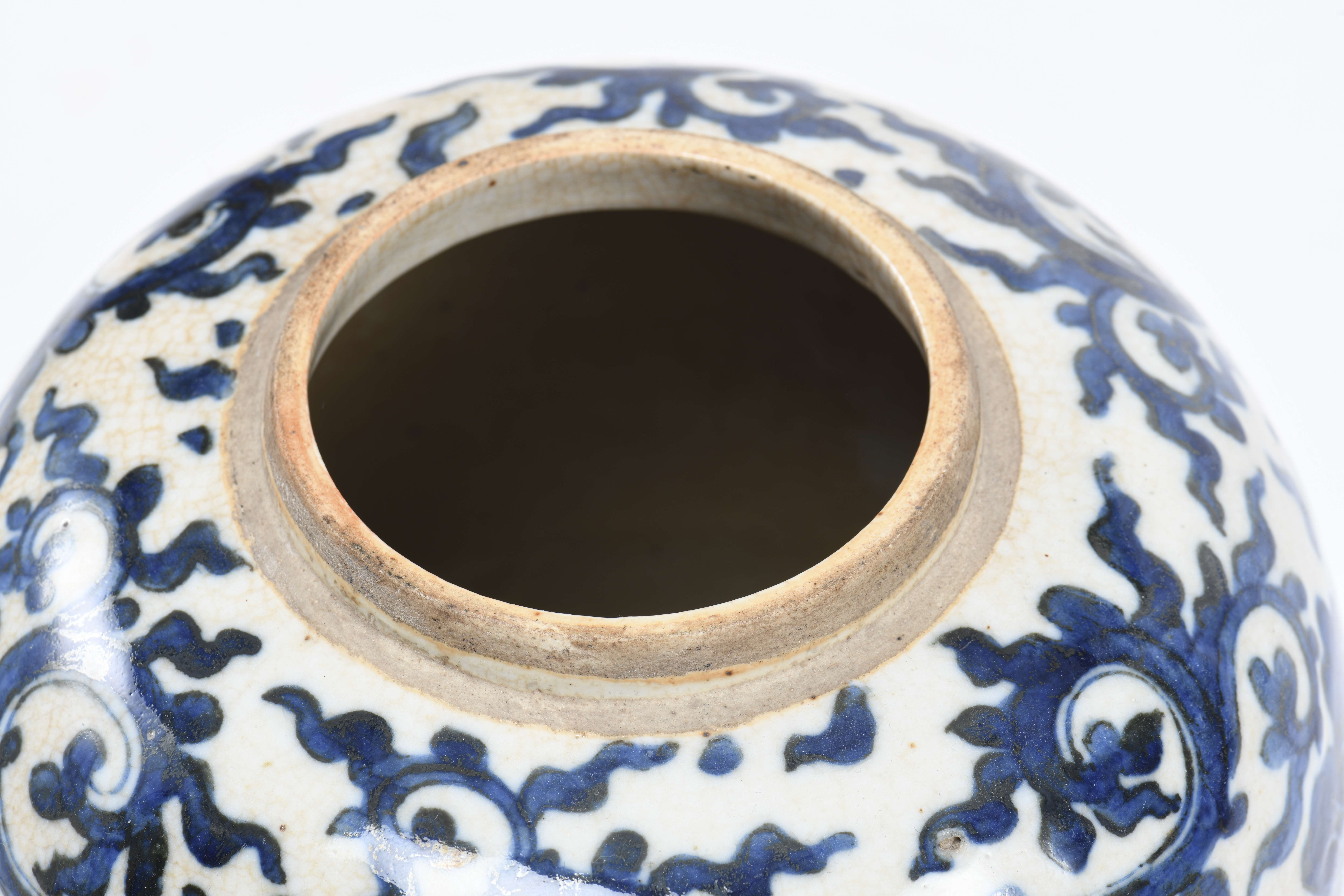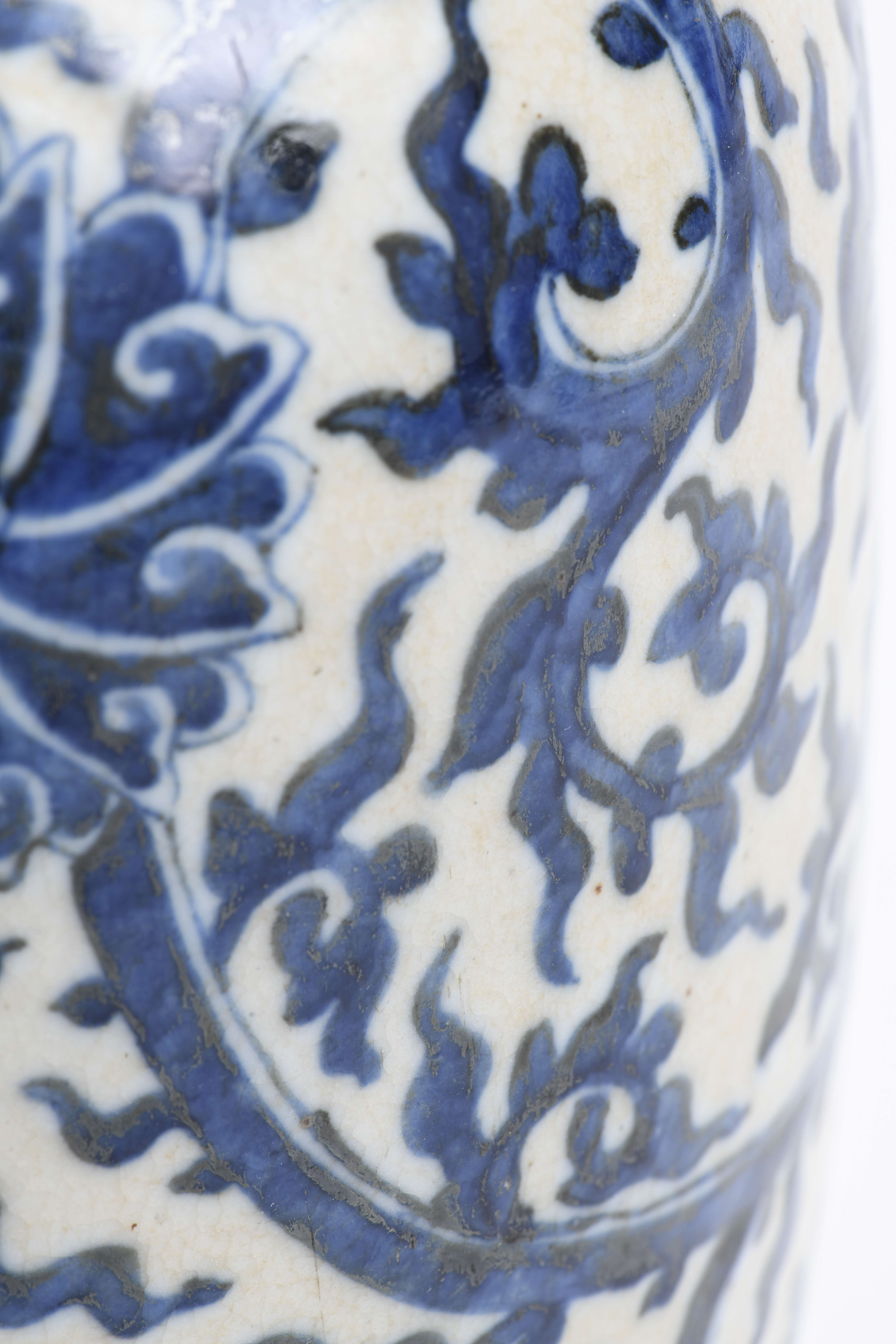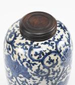 Potiche en porcelaine de Chine à décor en bleu et blanc de fleurs de lotus sur champ à couverte soupe de riz. Couvercle et socle en bois.