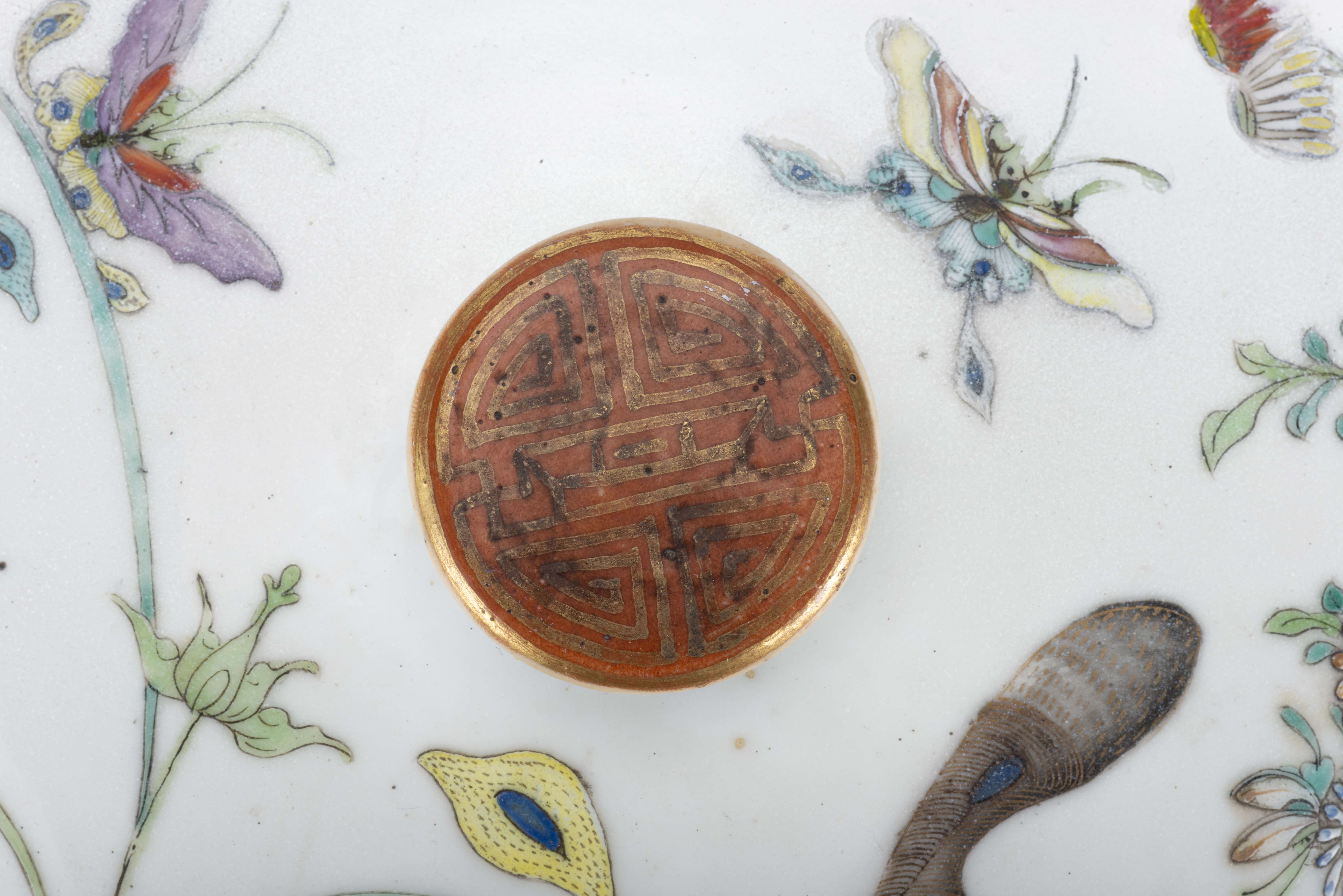 Boîte en porcelaine de Chine à décor en famille rose de papillons avec couvercle. Fin des Qing.