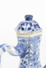 Verseuse en porcelaine de Chine à décor en bleu & blanc de fleurs, médaillon central polylobé à décor d'une fleur en blanc sur champ bleu, époque Qing, Kangxi. Avec son couvercle.
