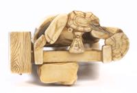 Okimono en ivoire du Japon représentant un vieillard souriant derrière un grillage où grimpent des petits rats