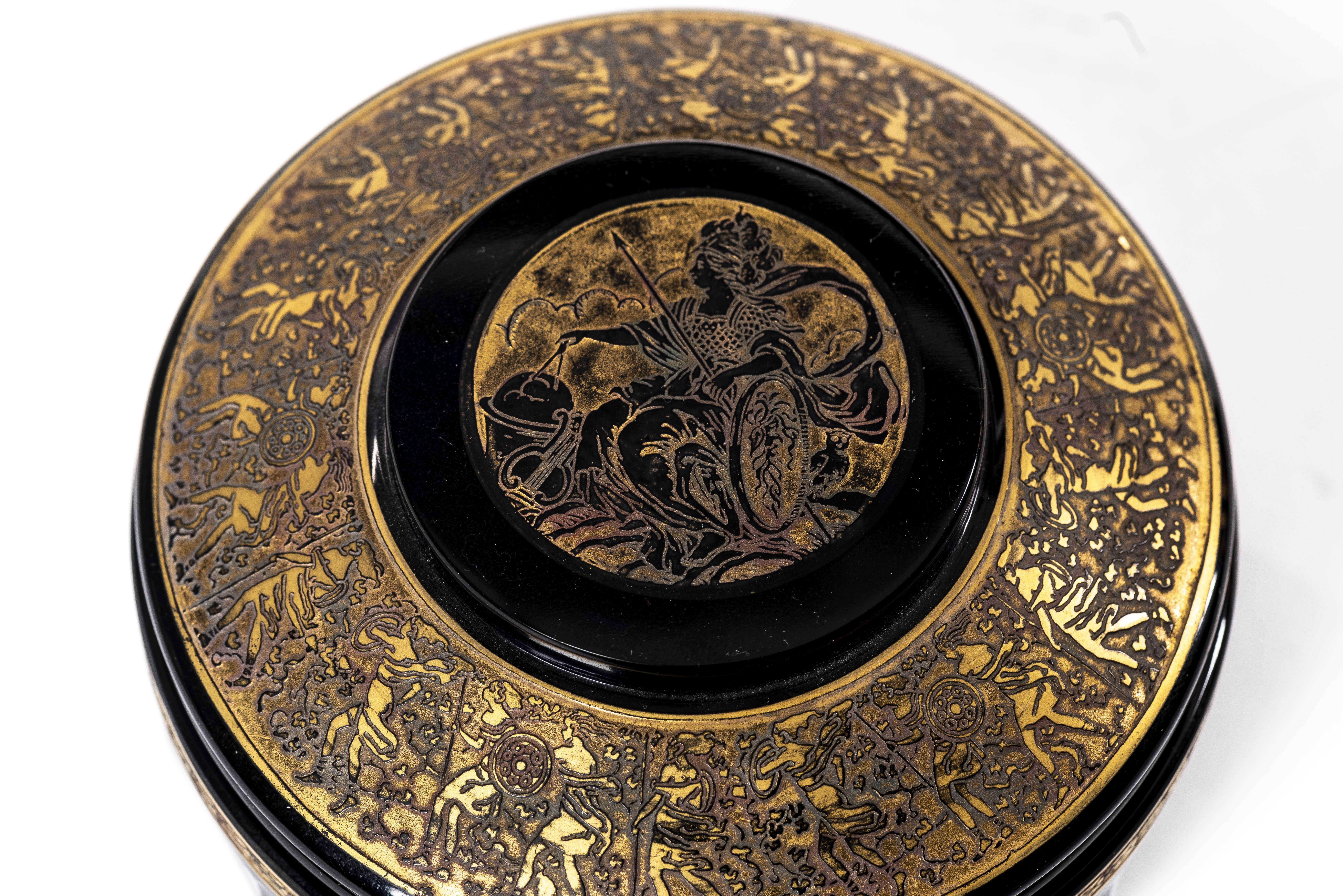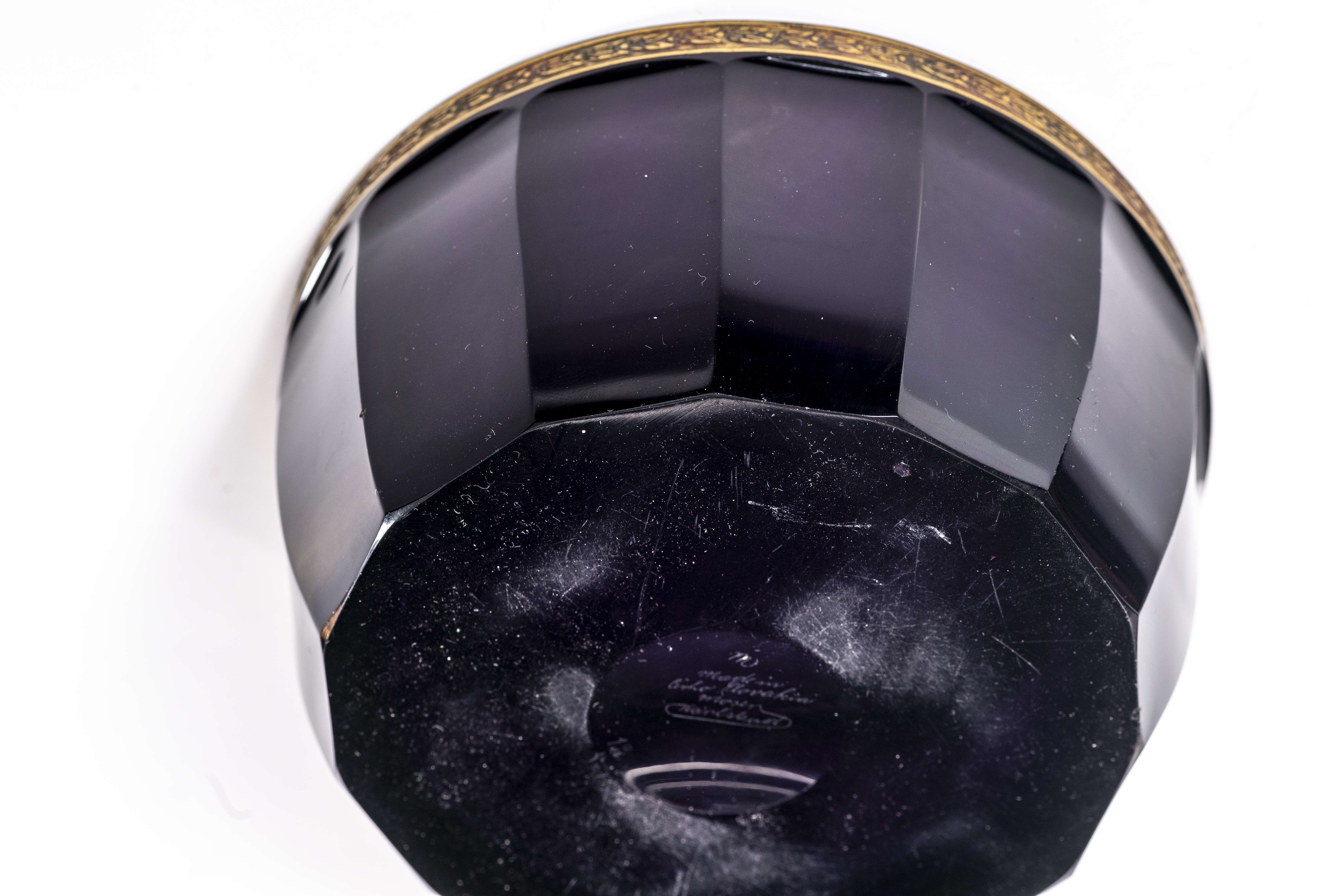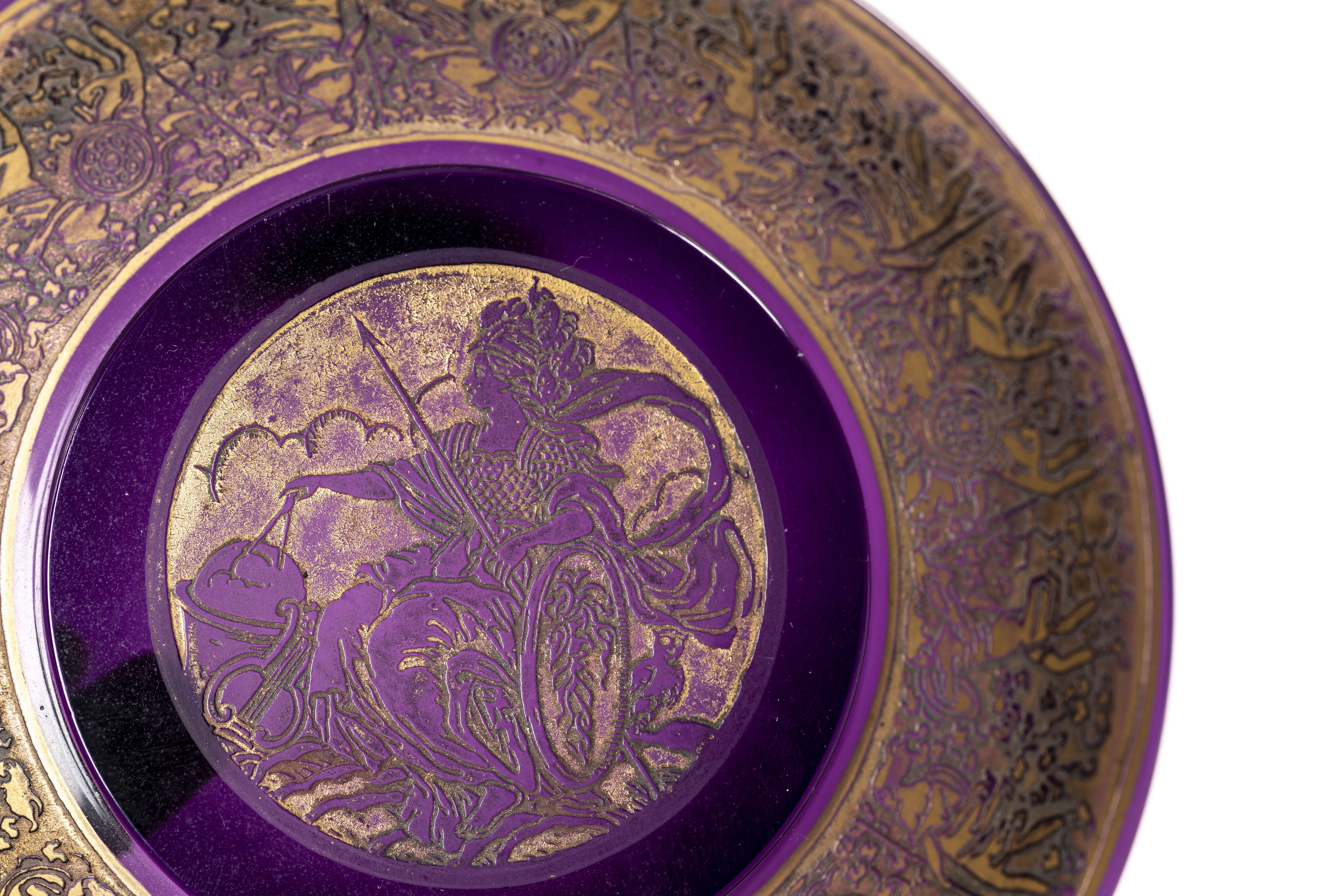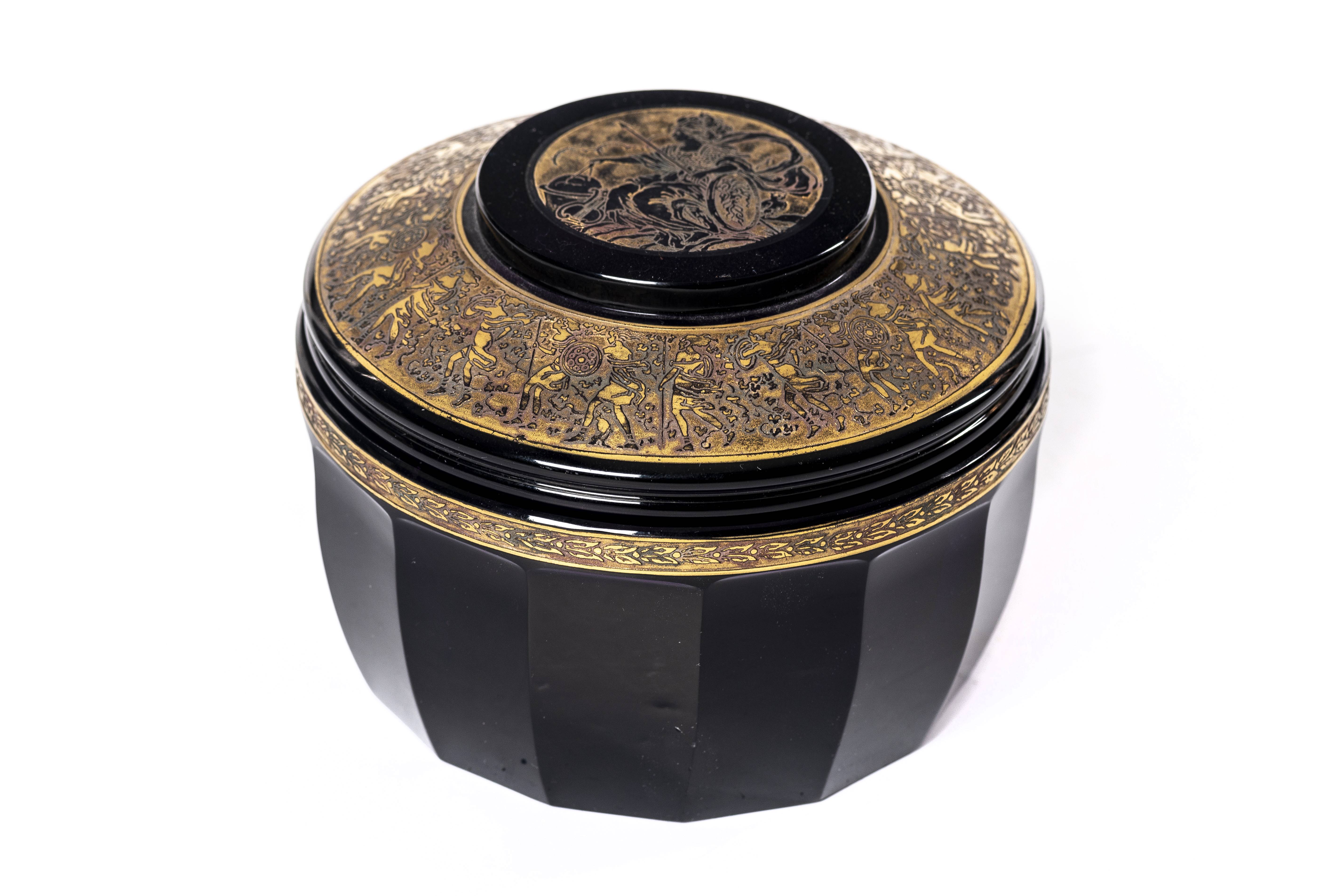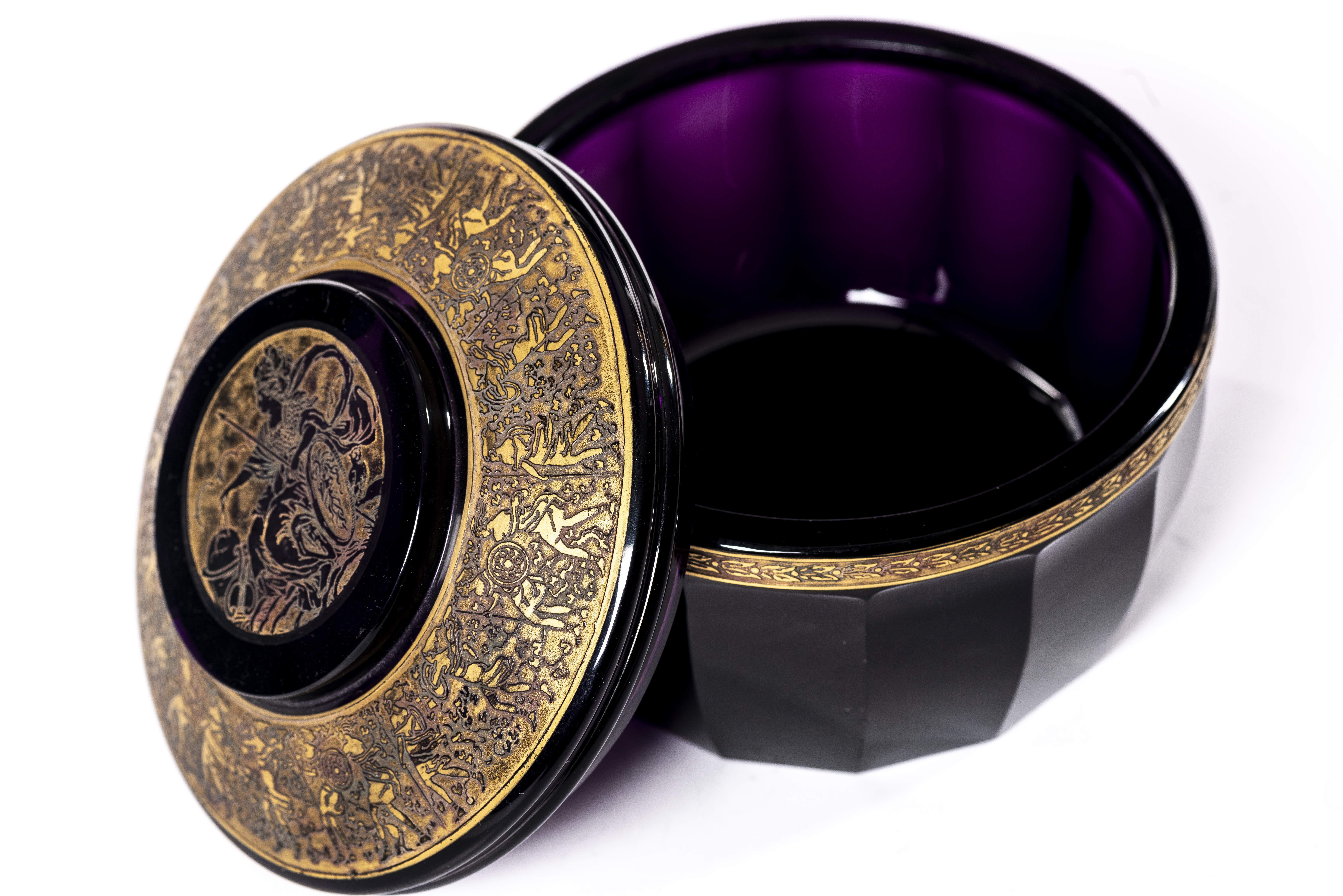 Bonbonnière violine en cristal de Tchékoslovakia par Ludwig MOSER Söhne à Karlsbad, à frise sous la lèvre et couvercle à décor d'amazones et Athena à l'acide et or.