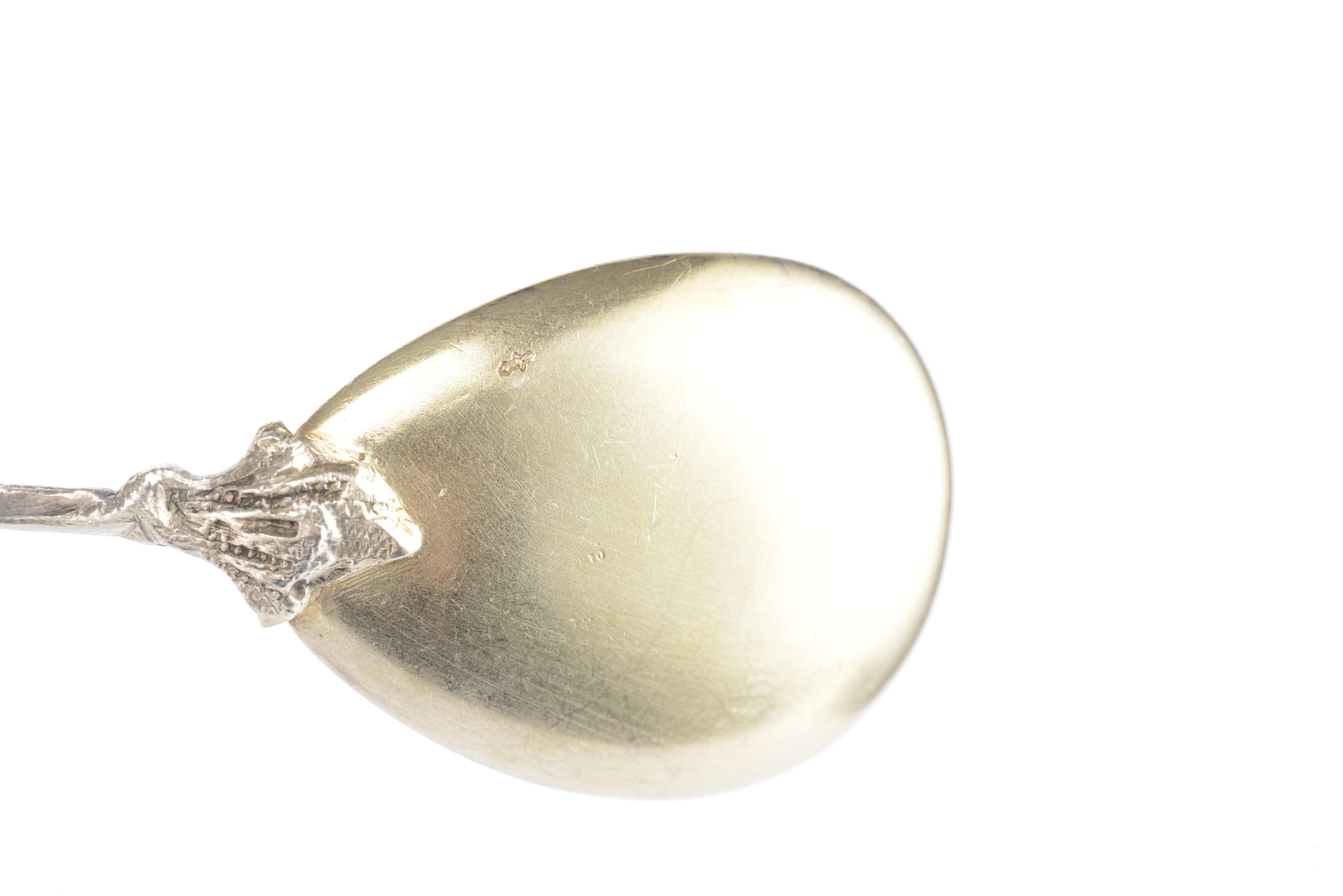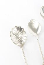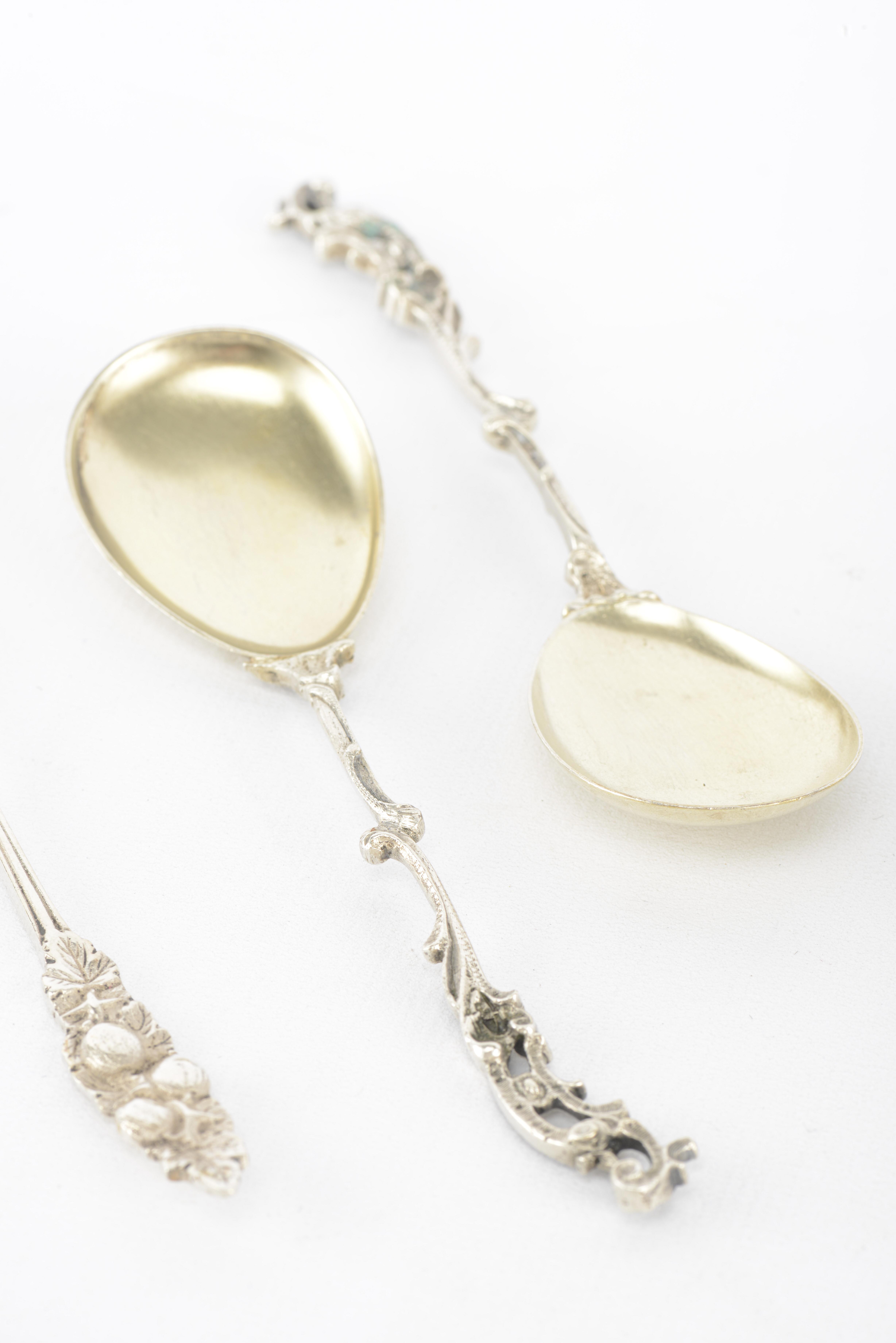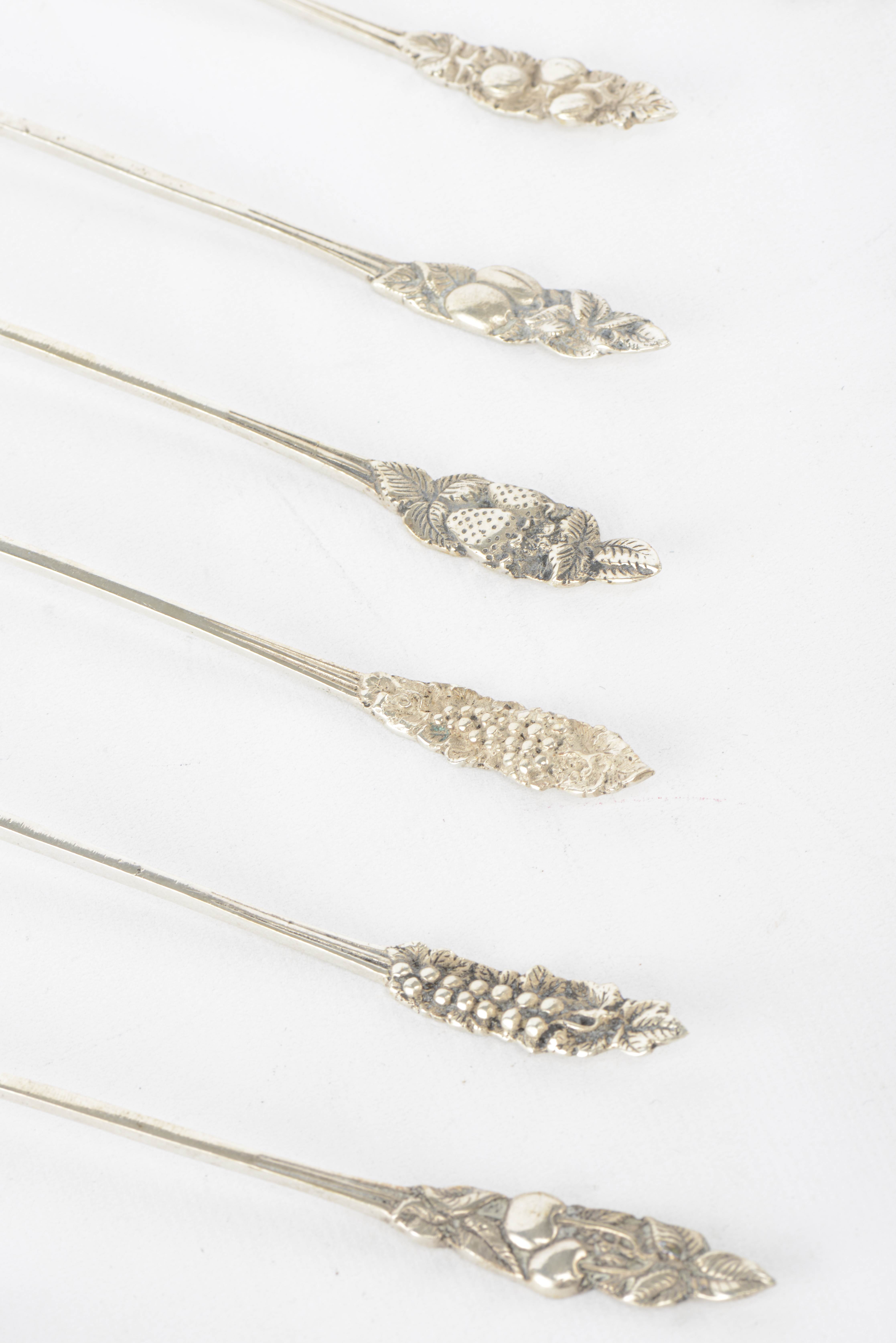 - 6 longues cuillères, terminées par un décor scupté en forme de fruits. L. 18.4 cm