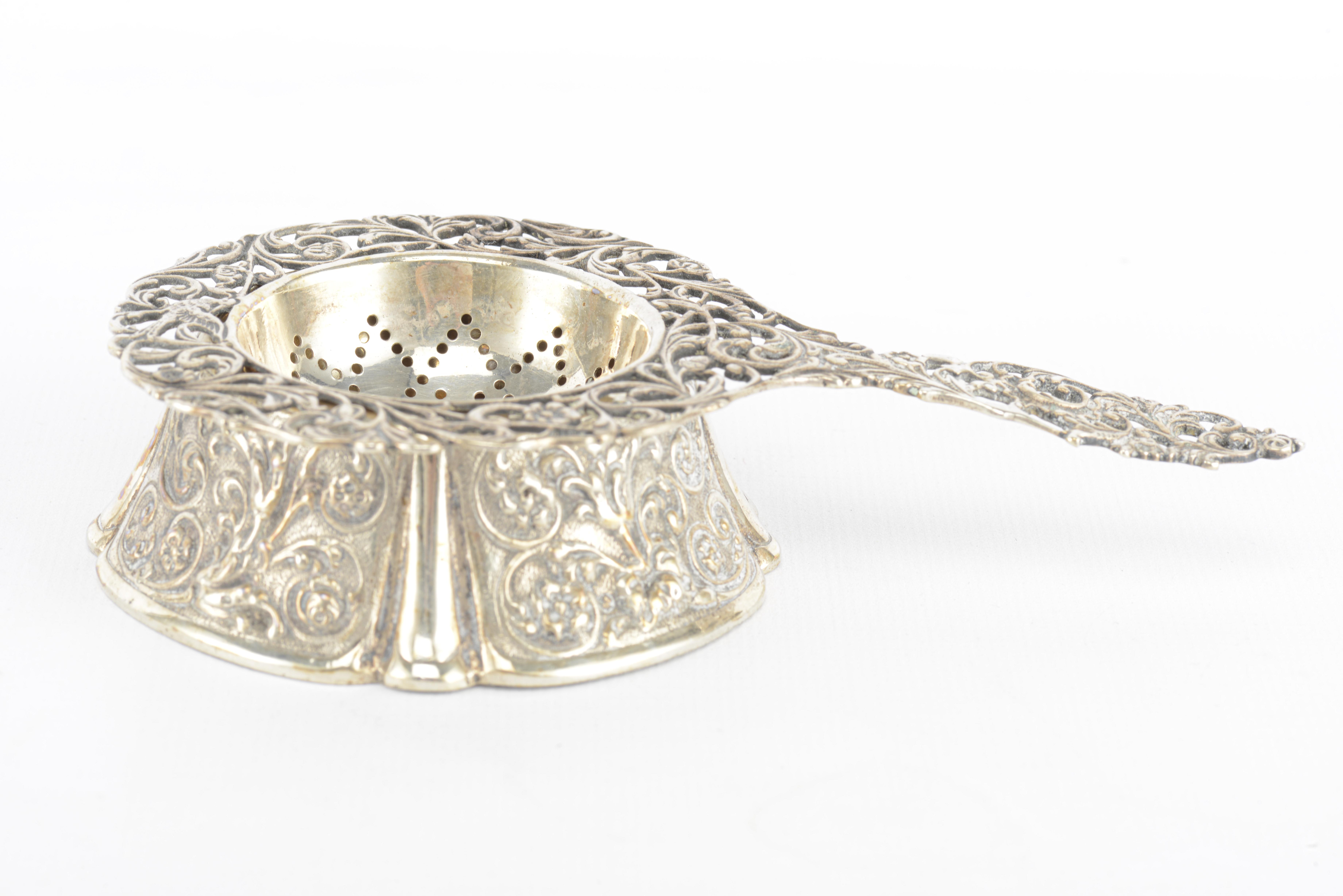 - Passoire à thé et son réceptacle aux motifs floraux et feuillagé. H. 1.3x14x8 cm & H. 3 & D. 8.4 cm