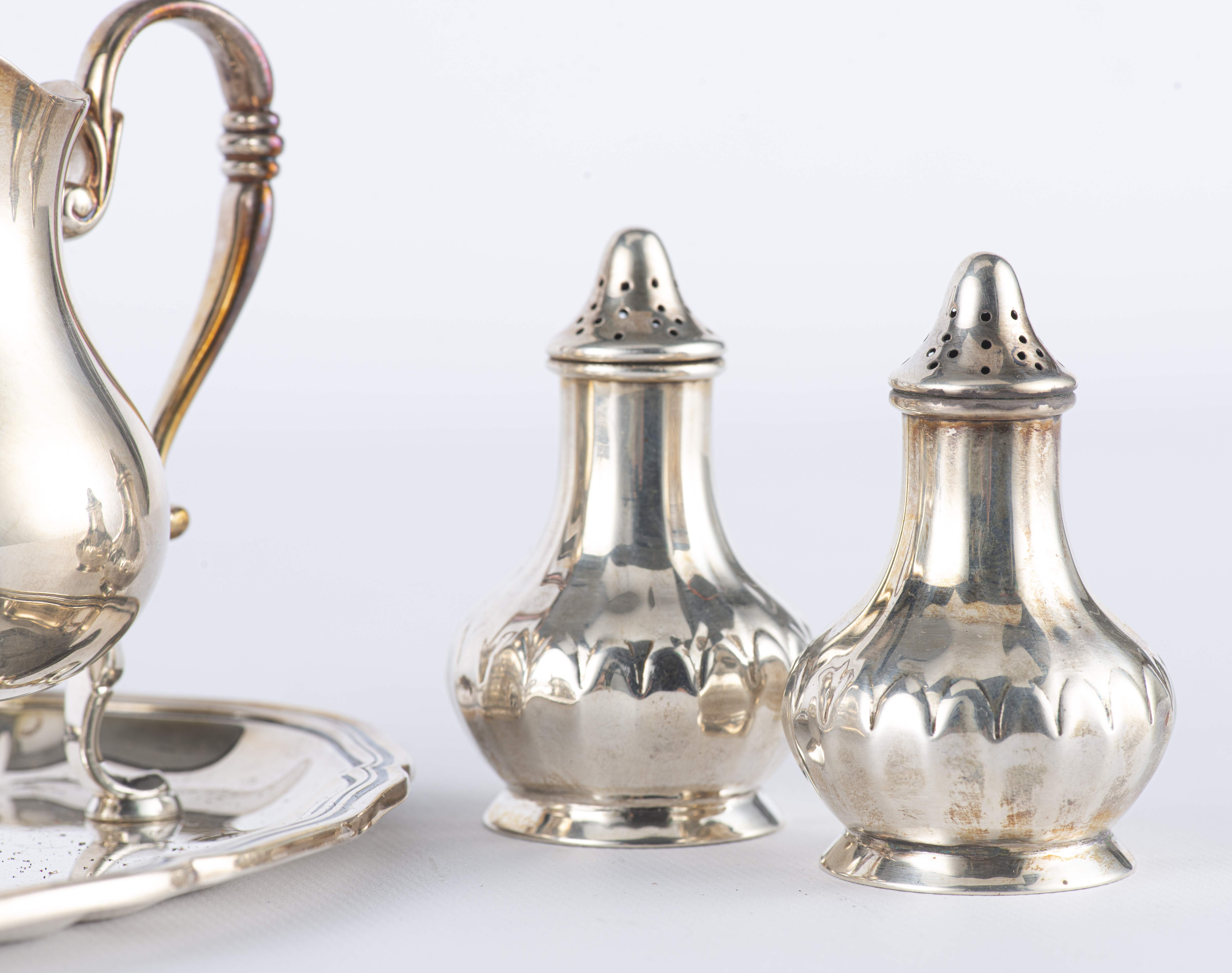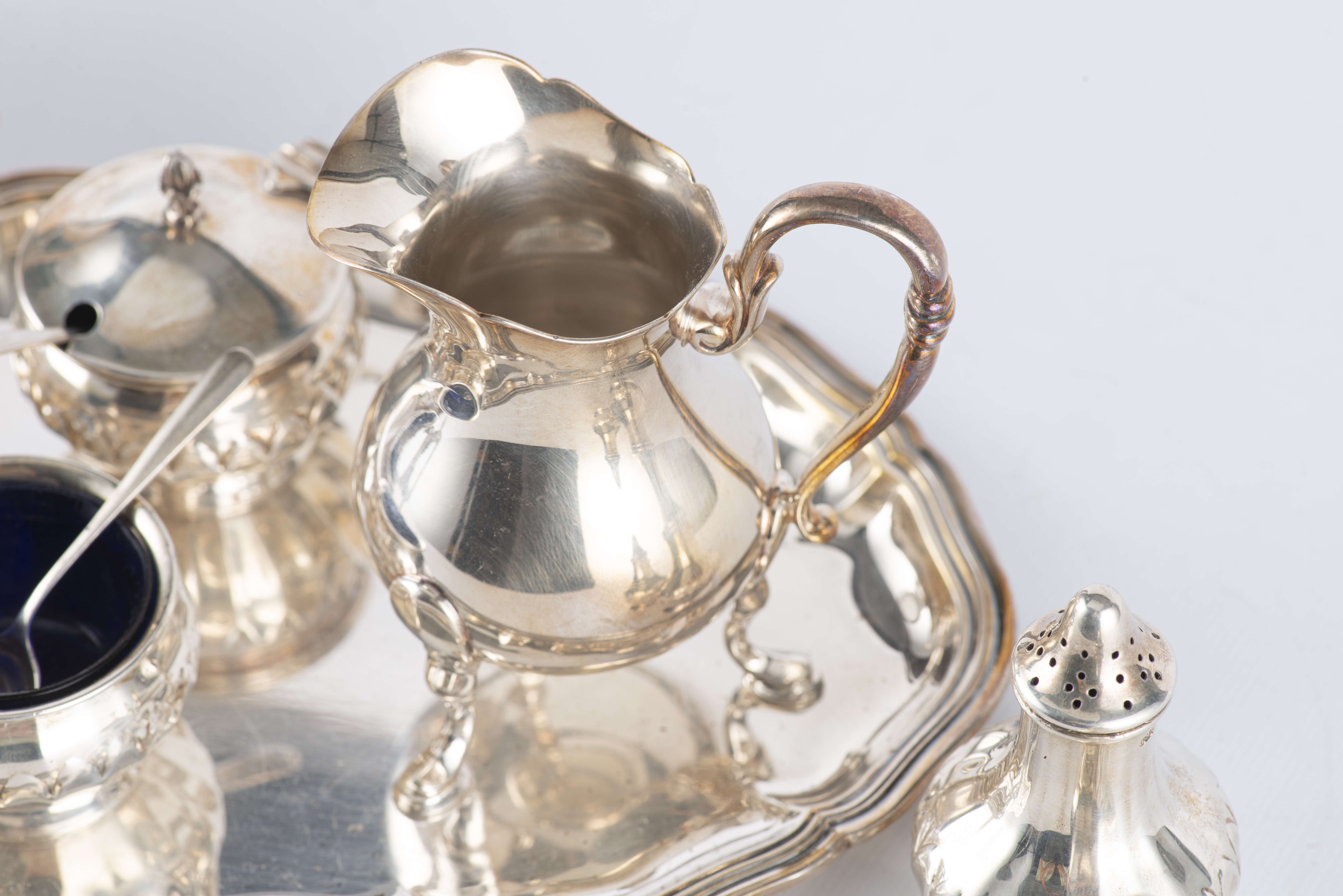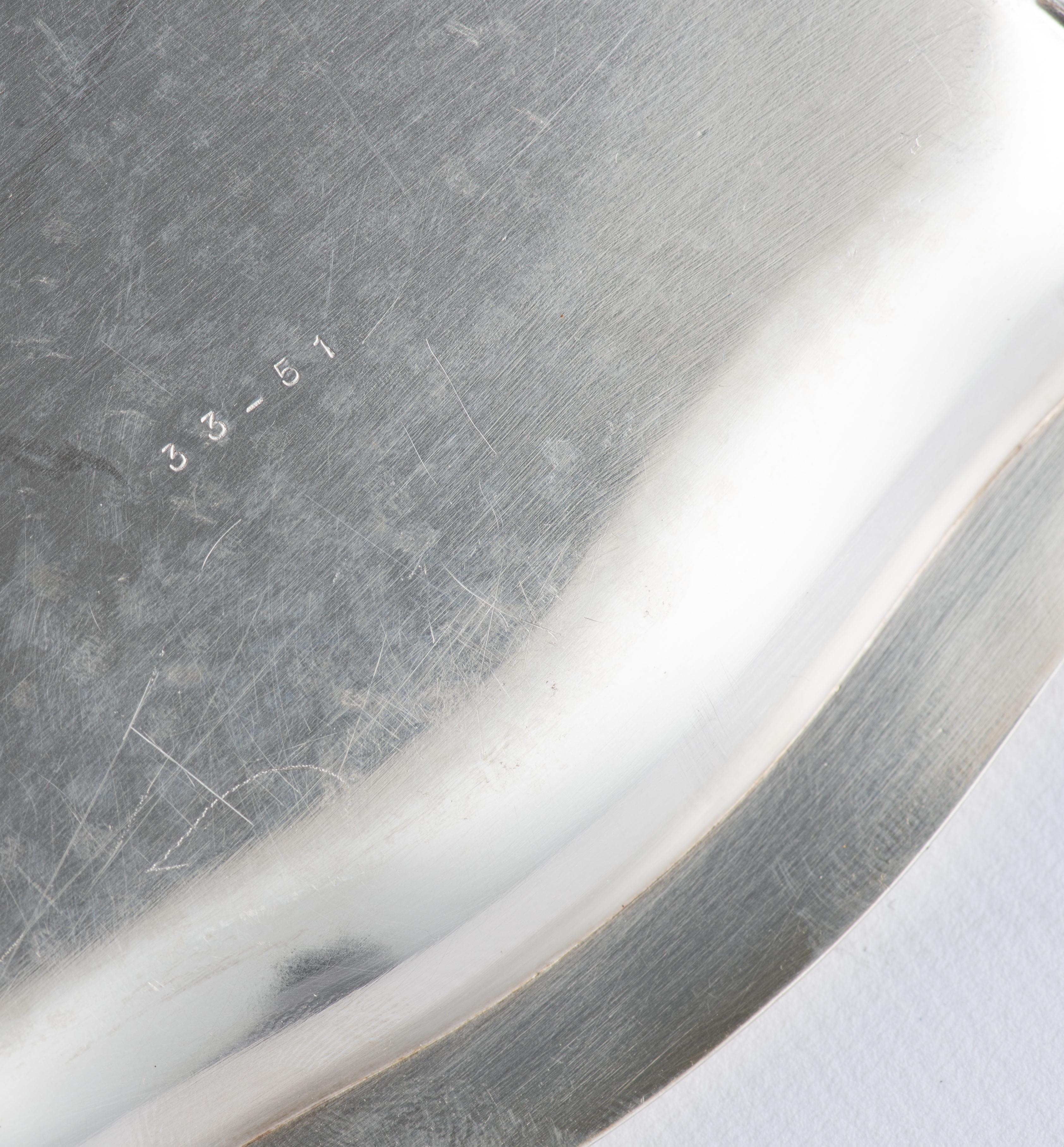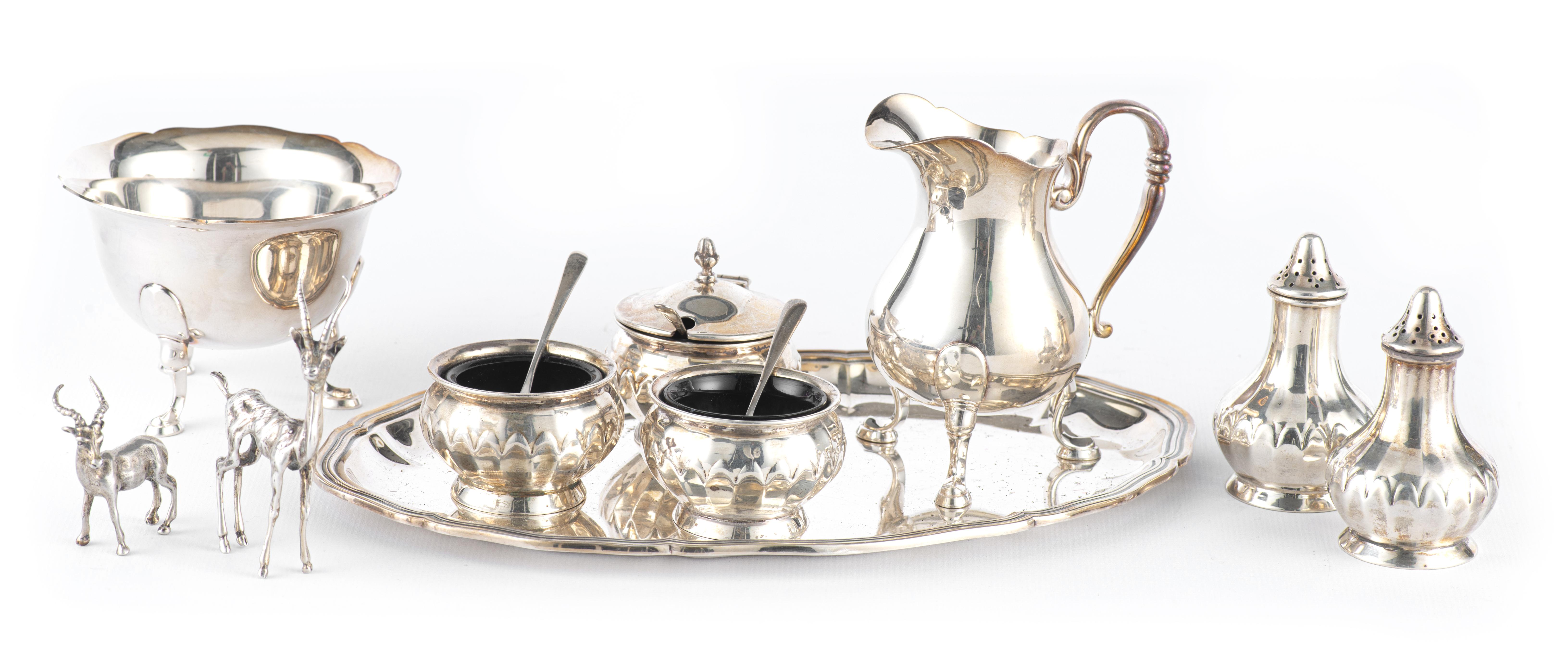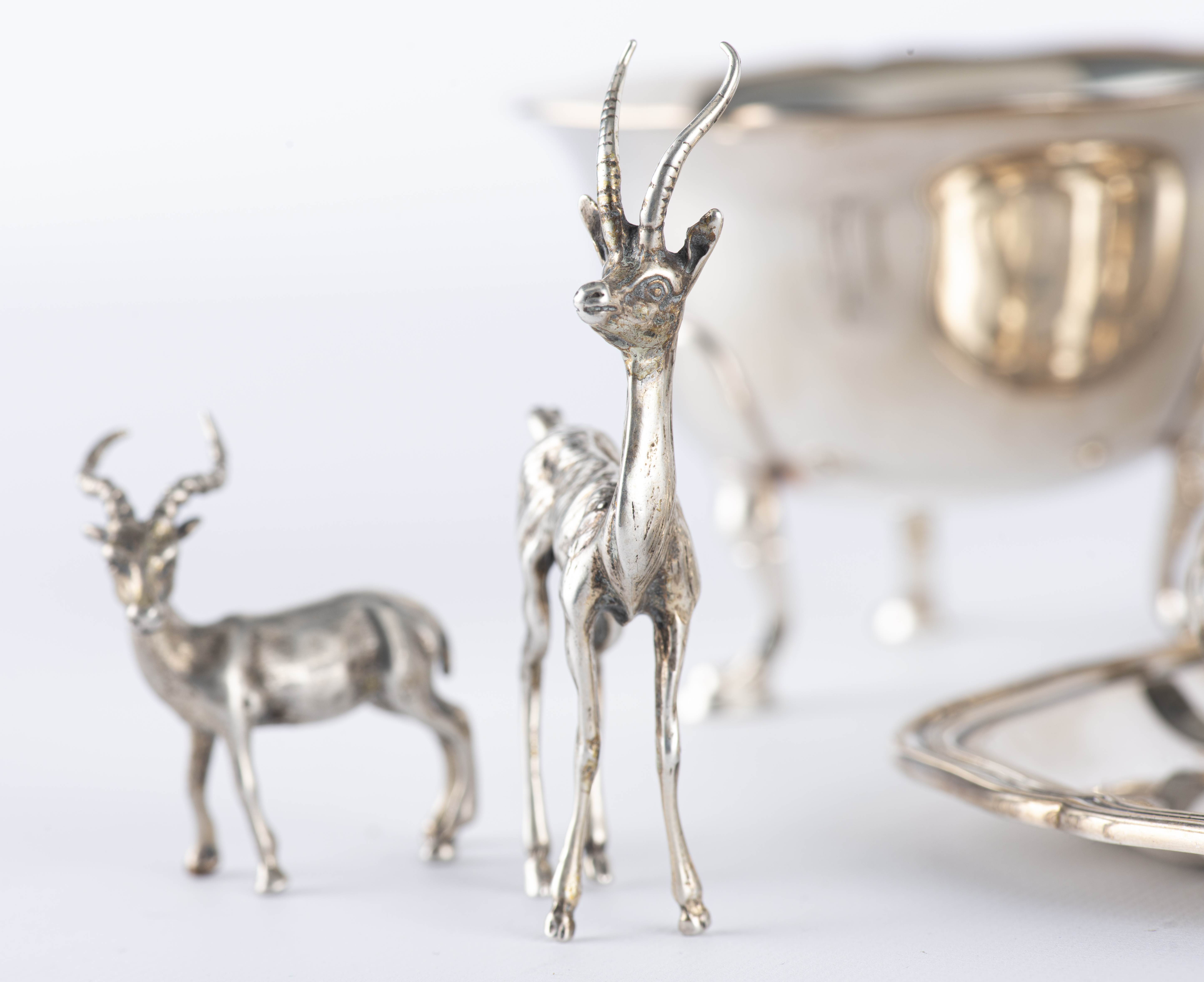 Service d'argenterie comprenant un plateau en argent .800 Jezler, un pot à lait et un sucrier sur 3 pieds de biche, en accompagnement de deux bouquetins en argent .800.