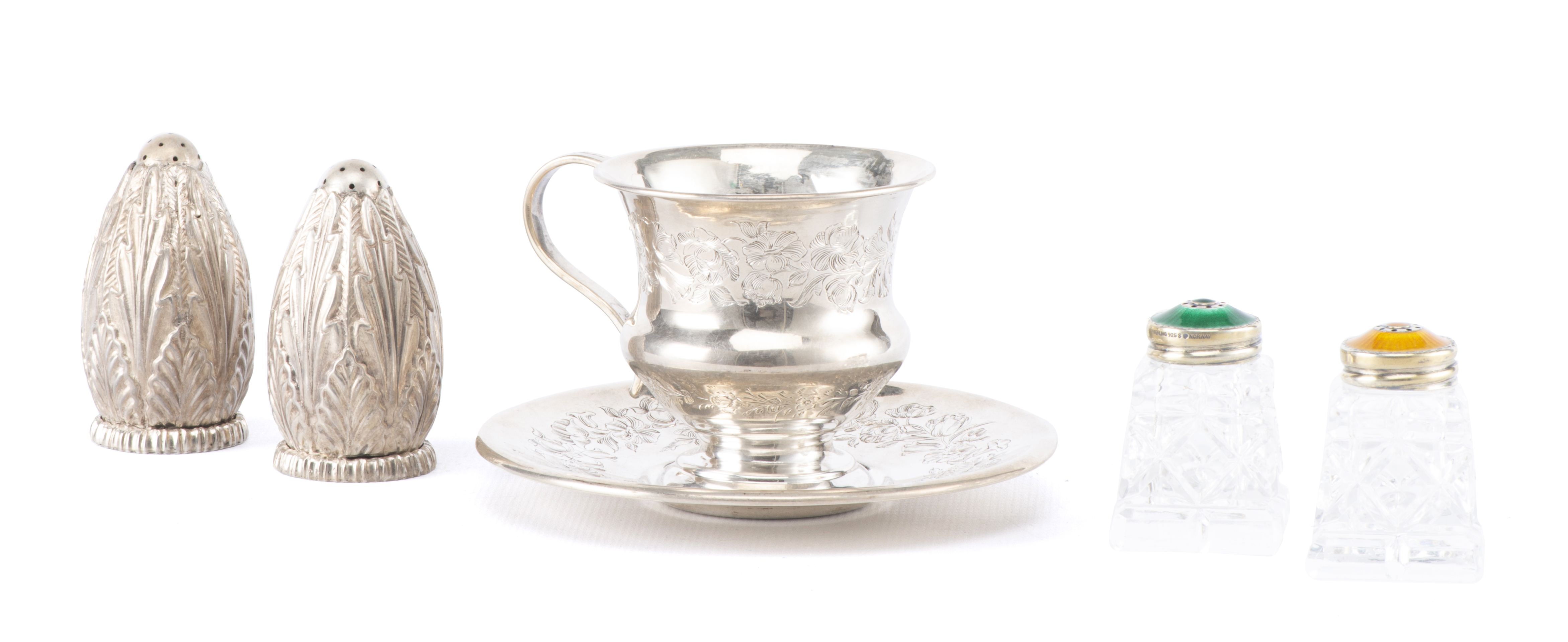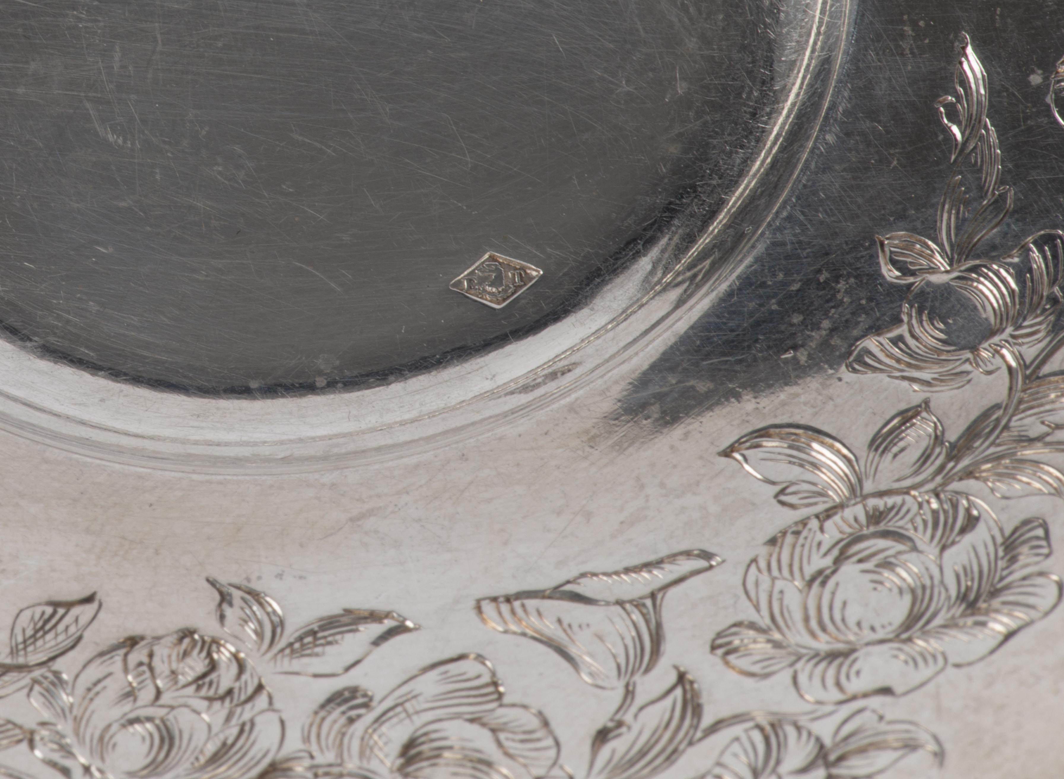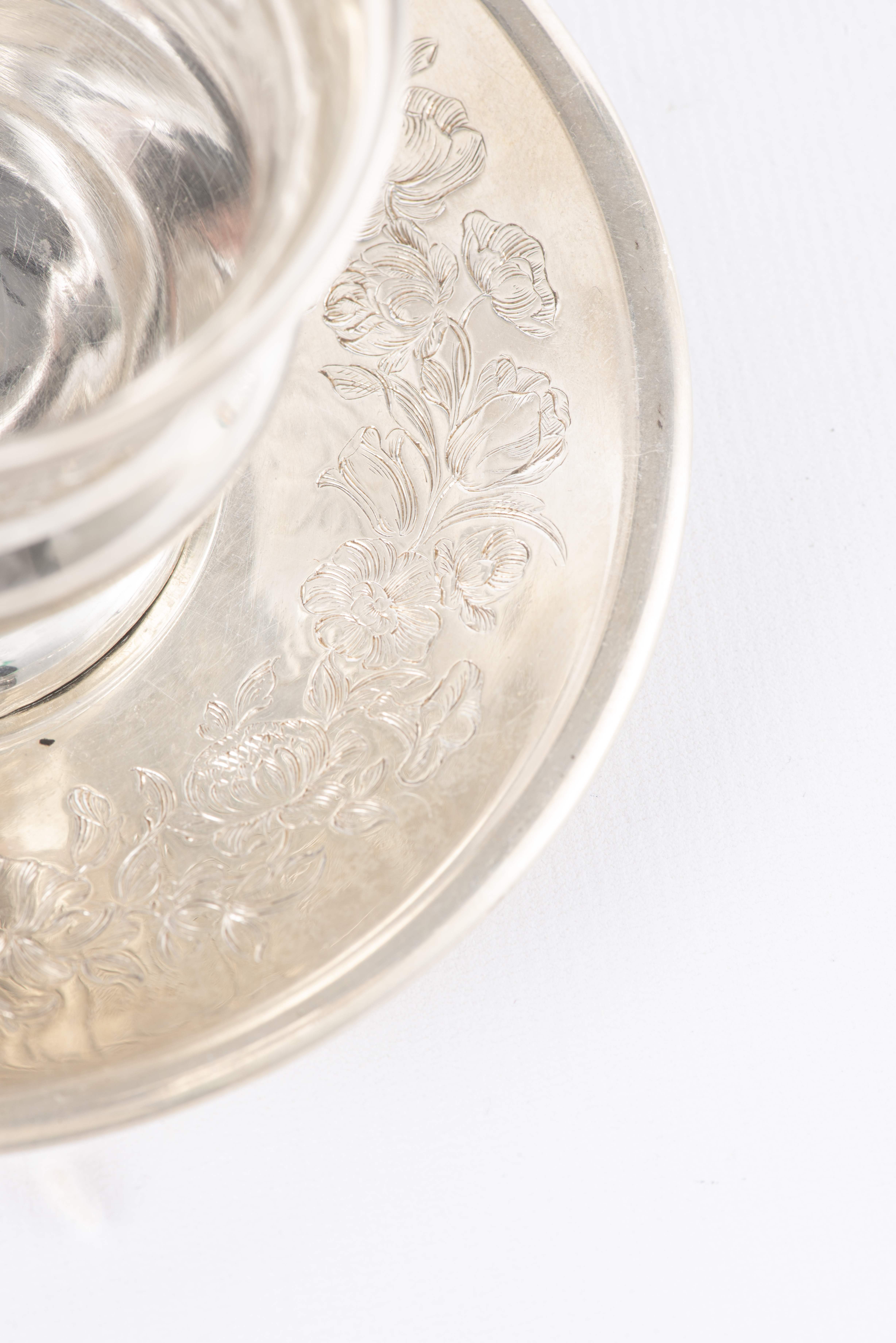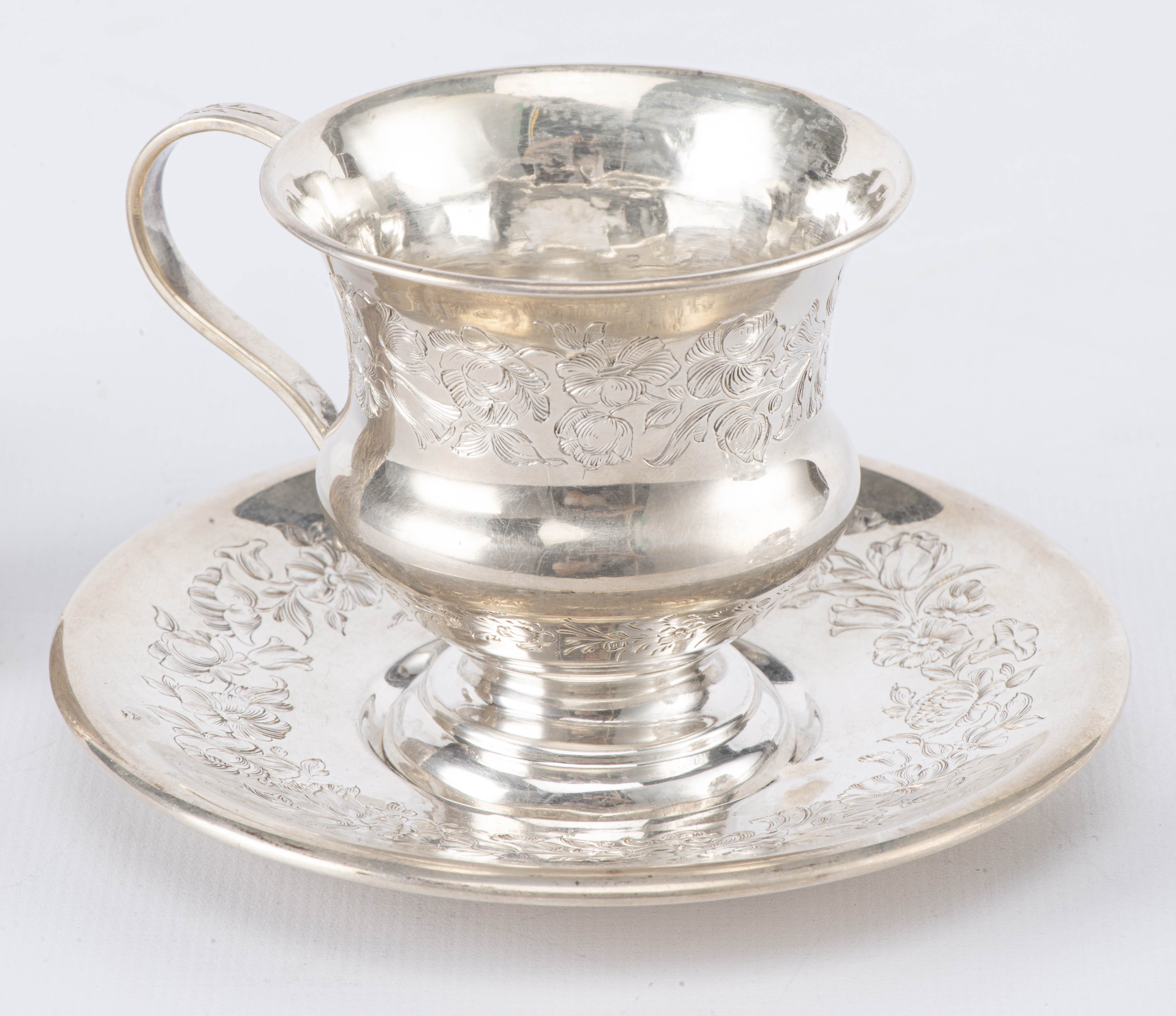 - une tasse sur pied avec une anse en argent français premier titre, décorée avec des motifs floraux avec sa sous-tasse assortie.