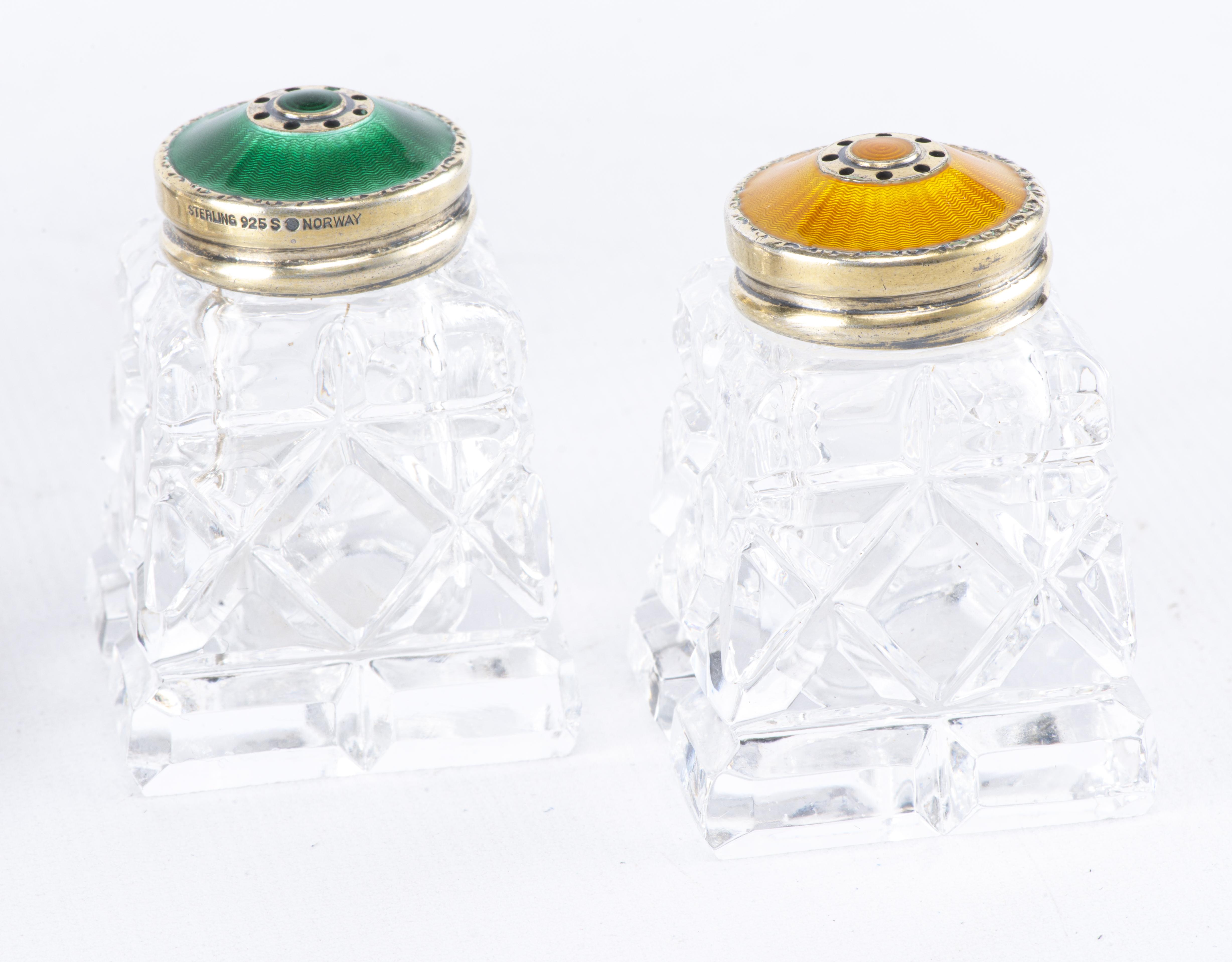 - deux salières identiques en cristal à couvercles émaillées vert et jaune, en argent sterling 923 norvégien