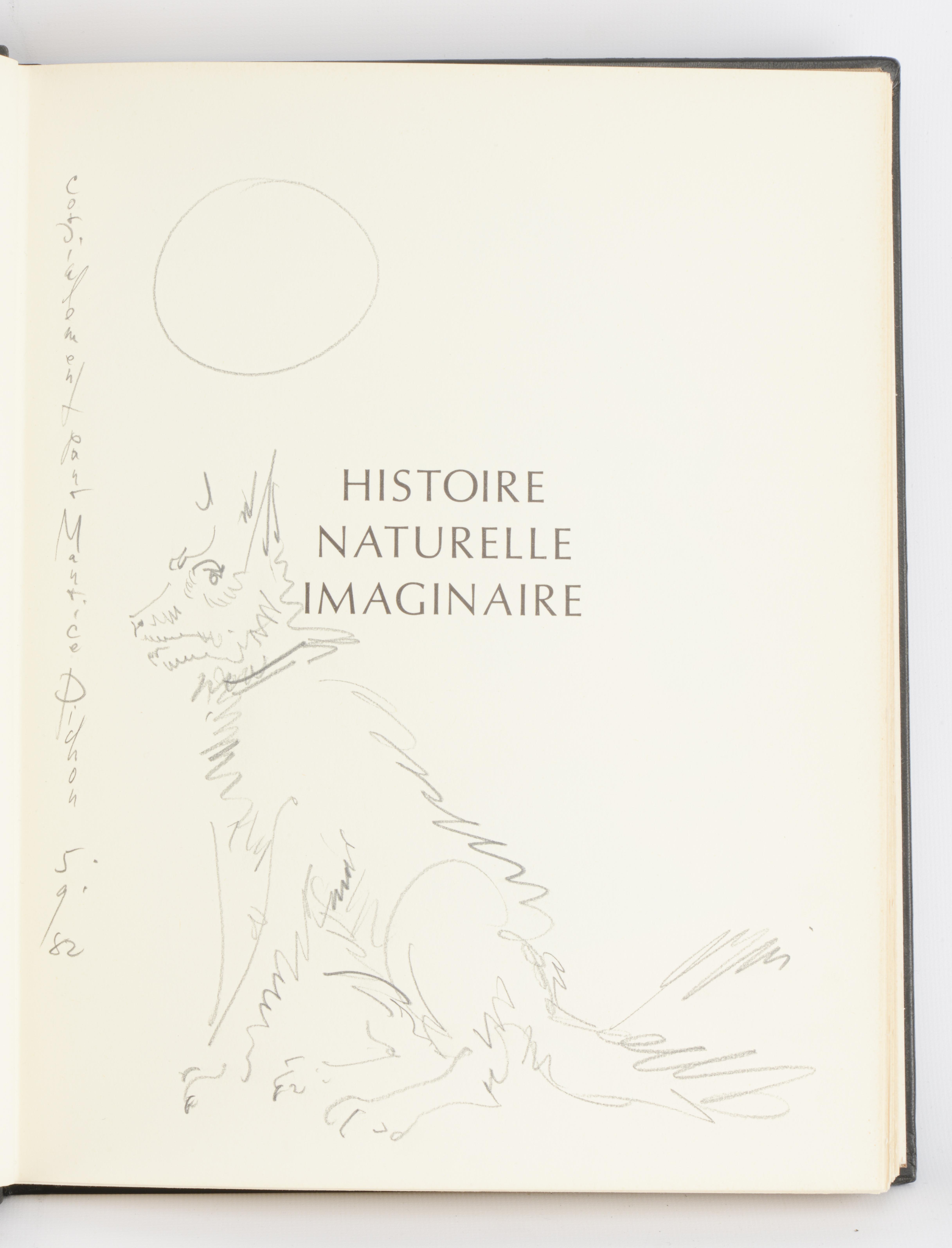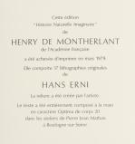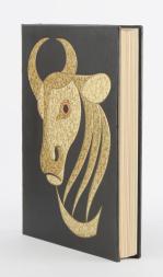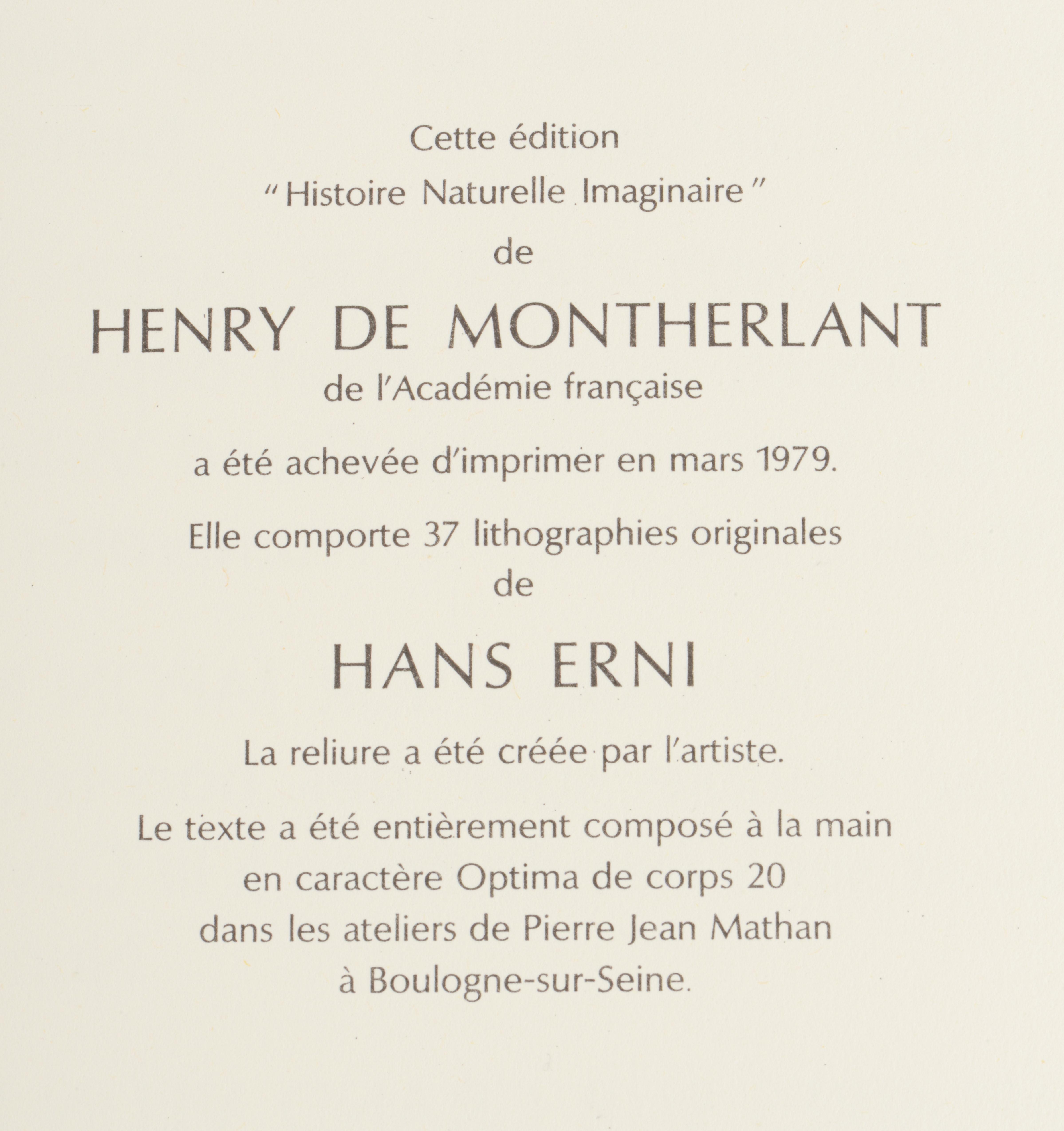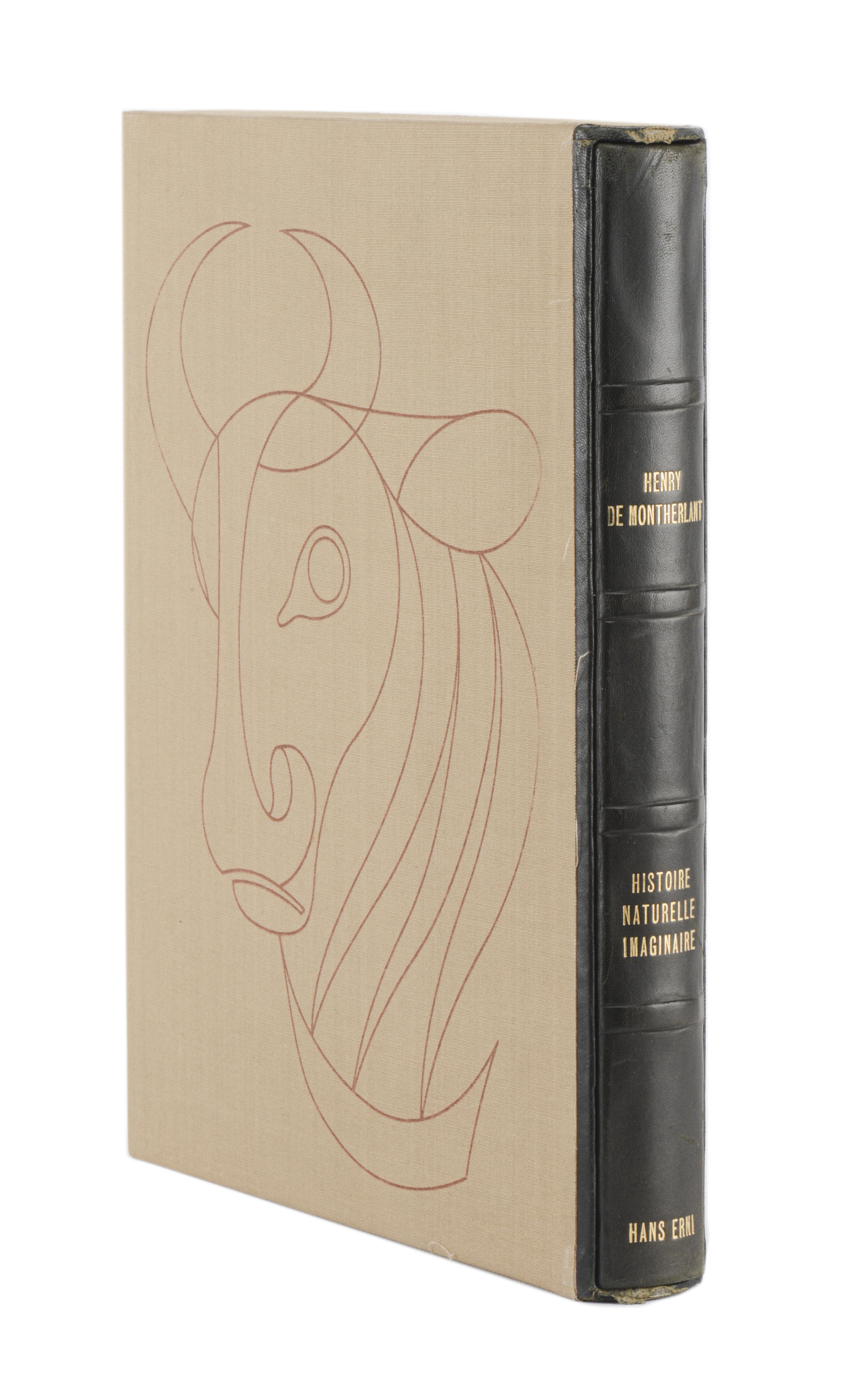 Henri de Montherlant, "Histoire naturelle imaginaire", ed. Pierre Jean Mathan, 1979, Boulogne-sur-Seine, In-folio relié, couverture et dos en cuir noir avec impression d'un taureau laqué doré, dans un coffret, illustré de 37 lithographies originales de Hans Erni, la reliure a été créée par l'artiste et le texte entièrement composé à la main dans les ateliers de Pierre Jean Mathan à Boulogne-sur-Seine, ex. N° 397 de 281 à 1500 sur Vélin de Lana et lithographies sur Vélin de Rives à la Cuve comportant l'état définitif des illustrations.