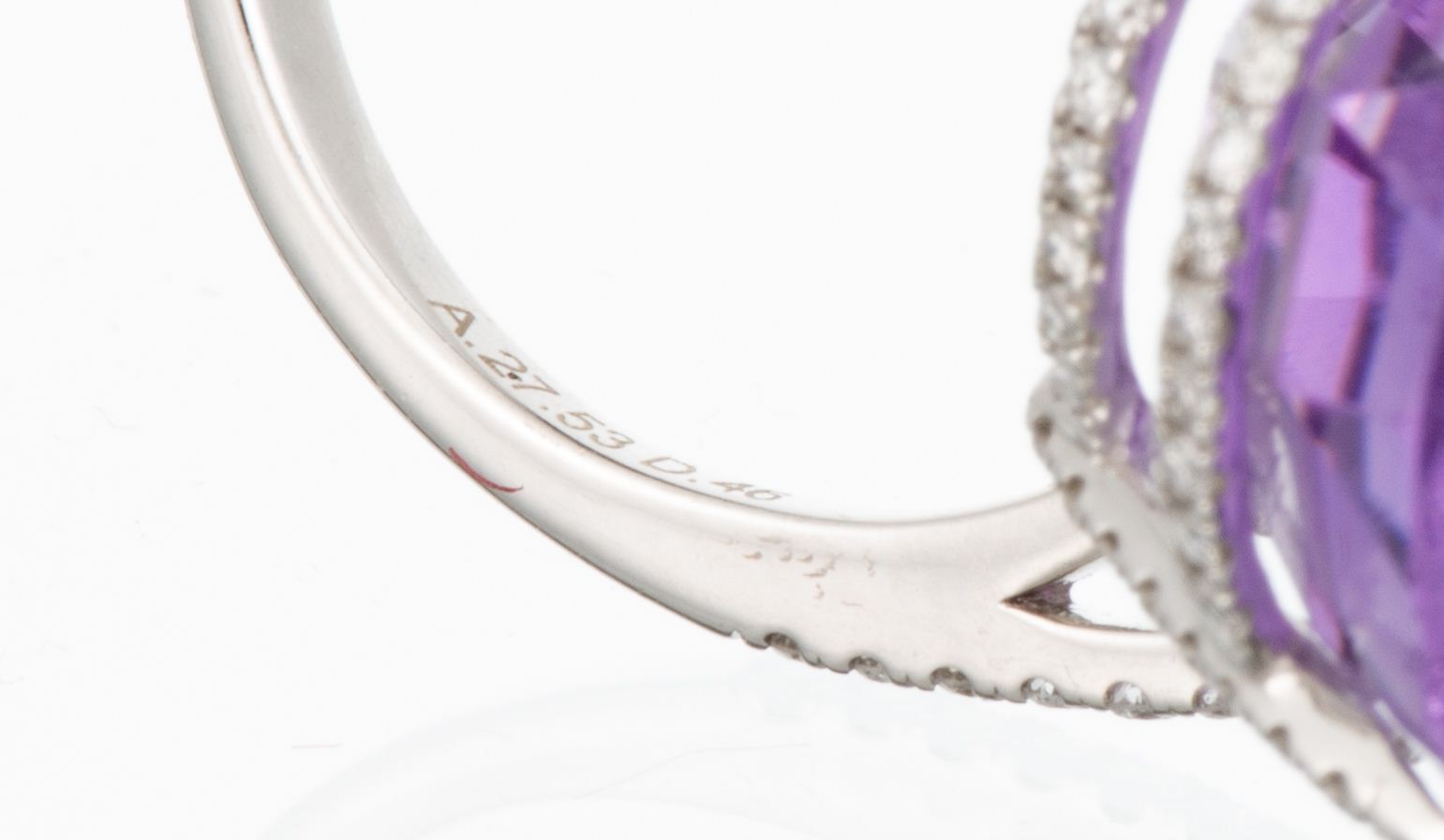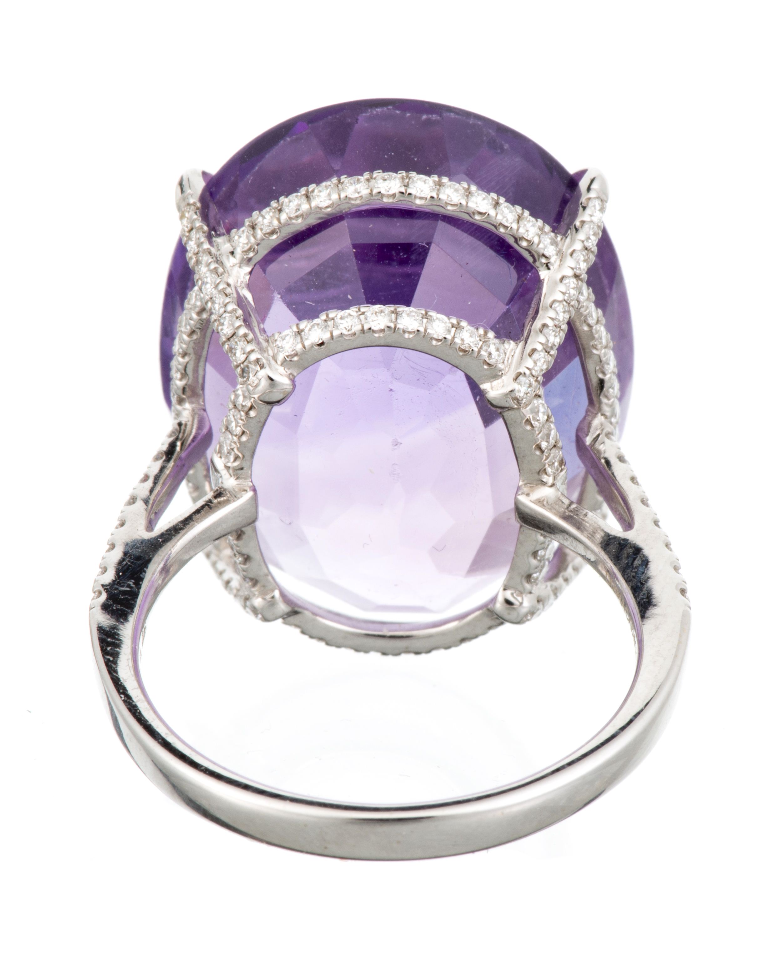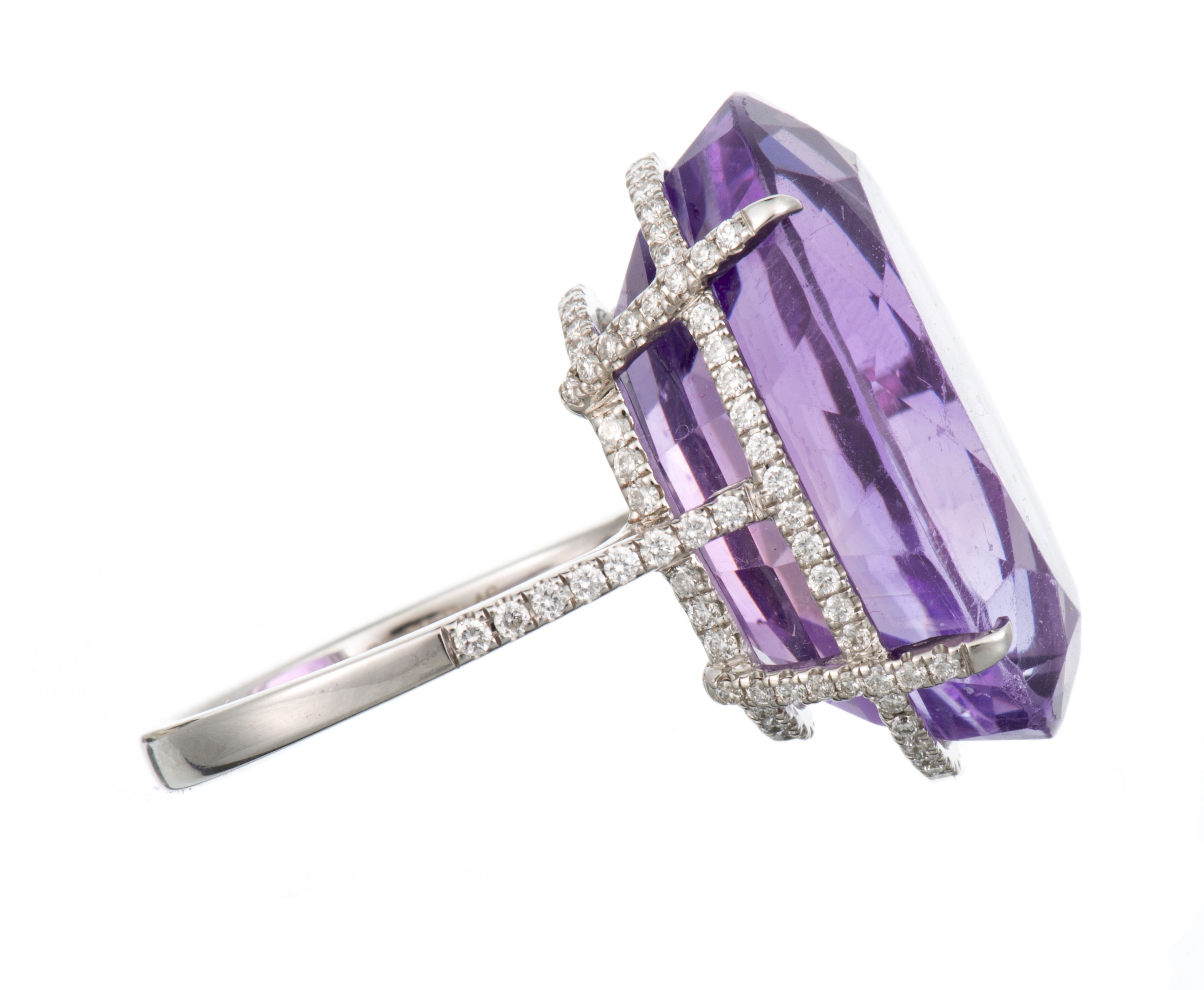 Diana CARMICHAEL, bague en or gris .750 avec une améthyste de 27.53 cts sertie de diamants sur la monture pour un total 0.46 ct