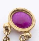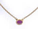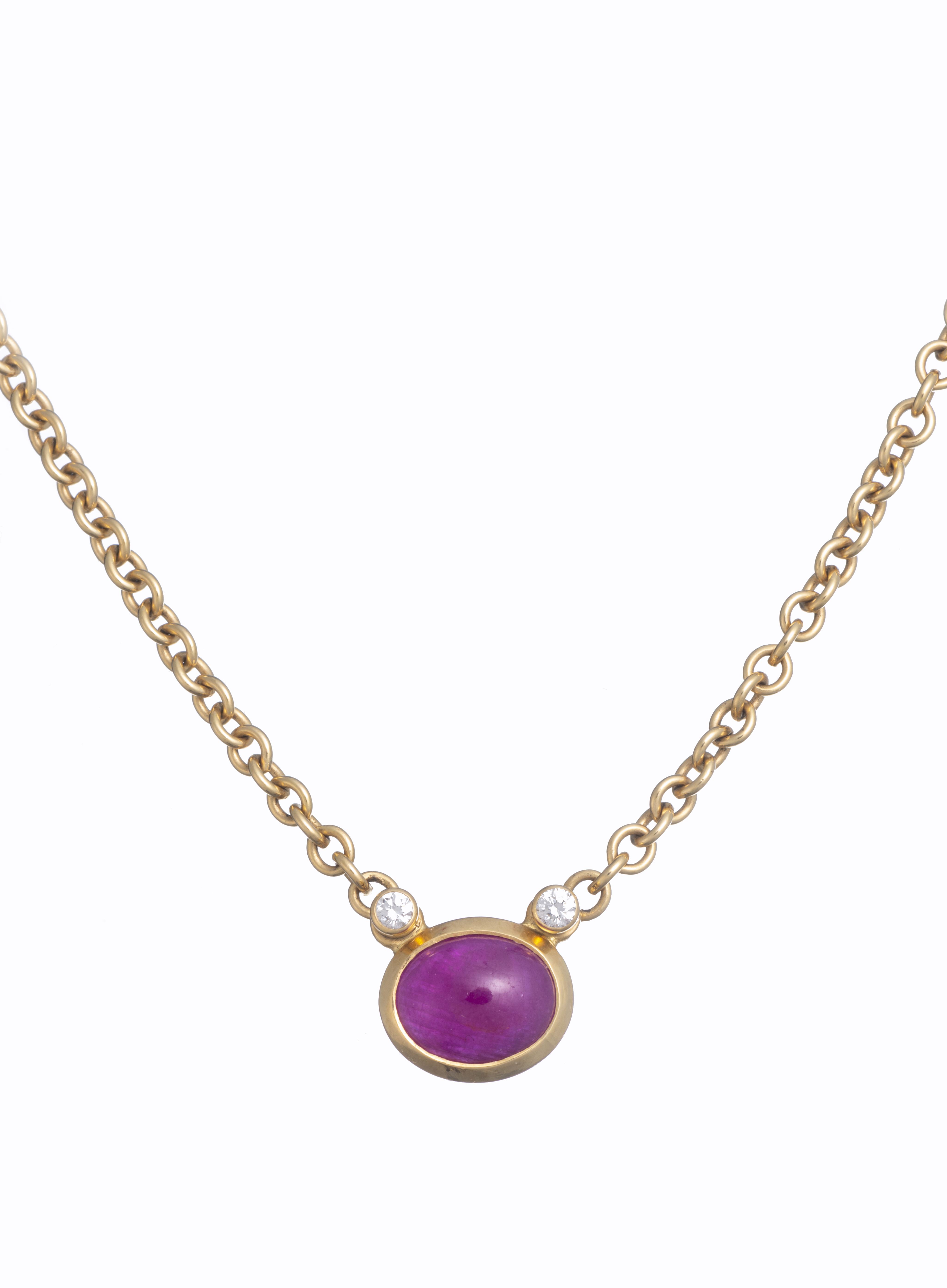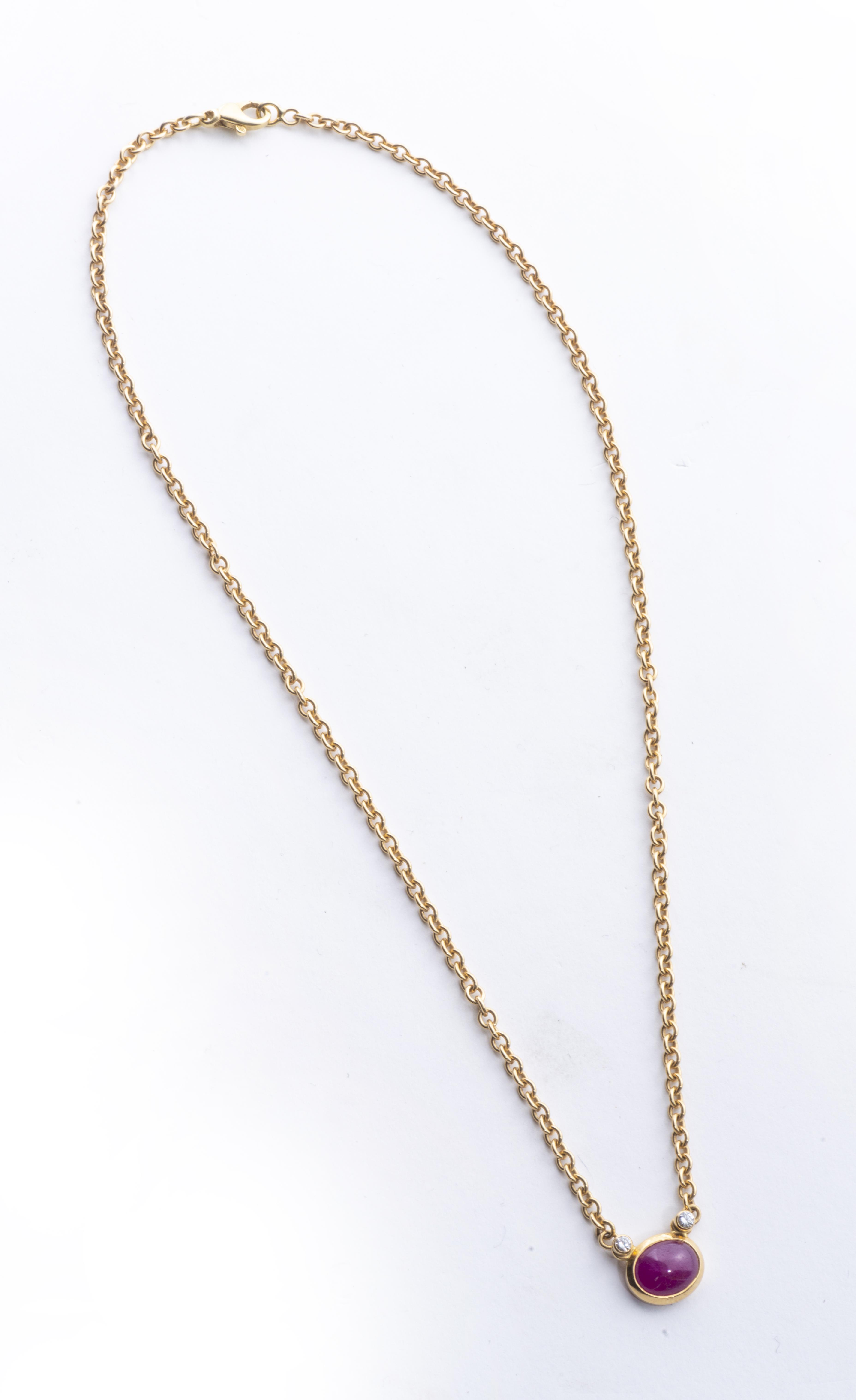 Collier tour de cou en or jaune .750 avec un pendentif formé d'un rubis cabochon à serti clos et de deux diamants de taille brillant pour un total de 0.6 ct.