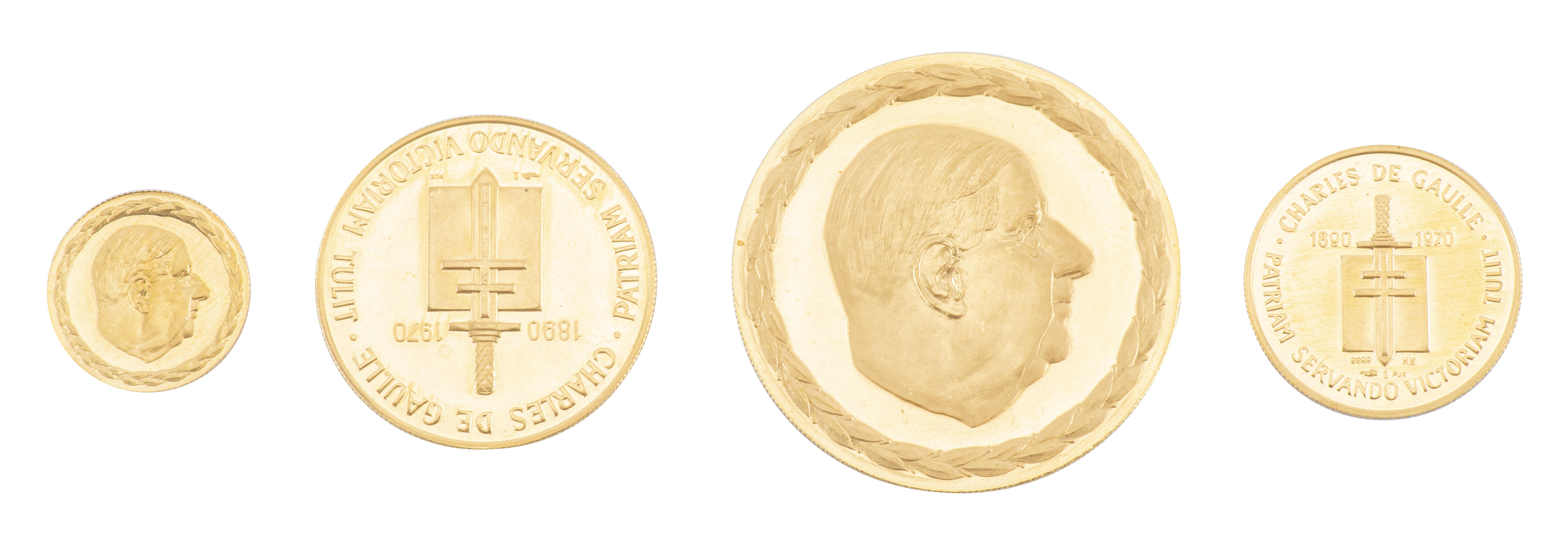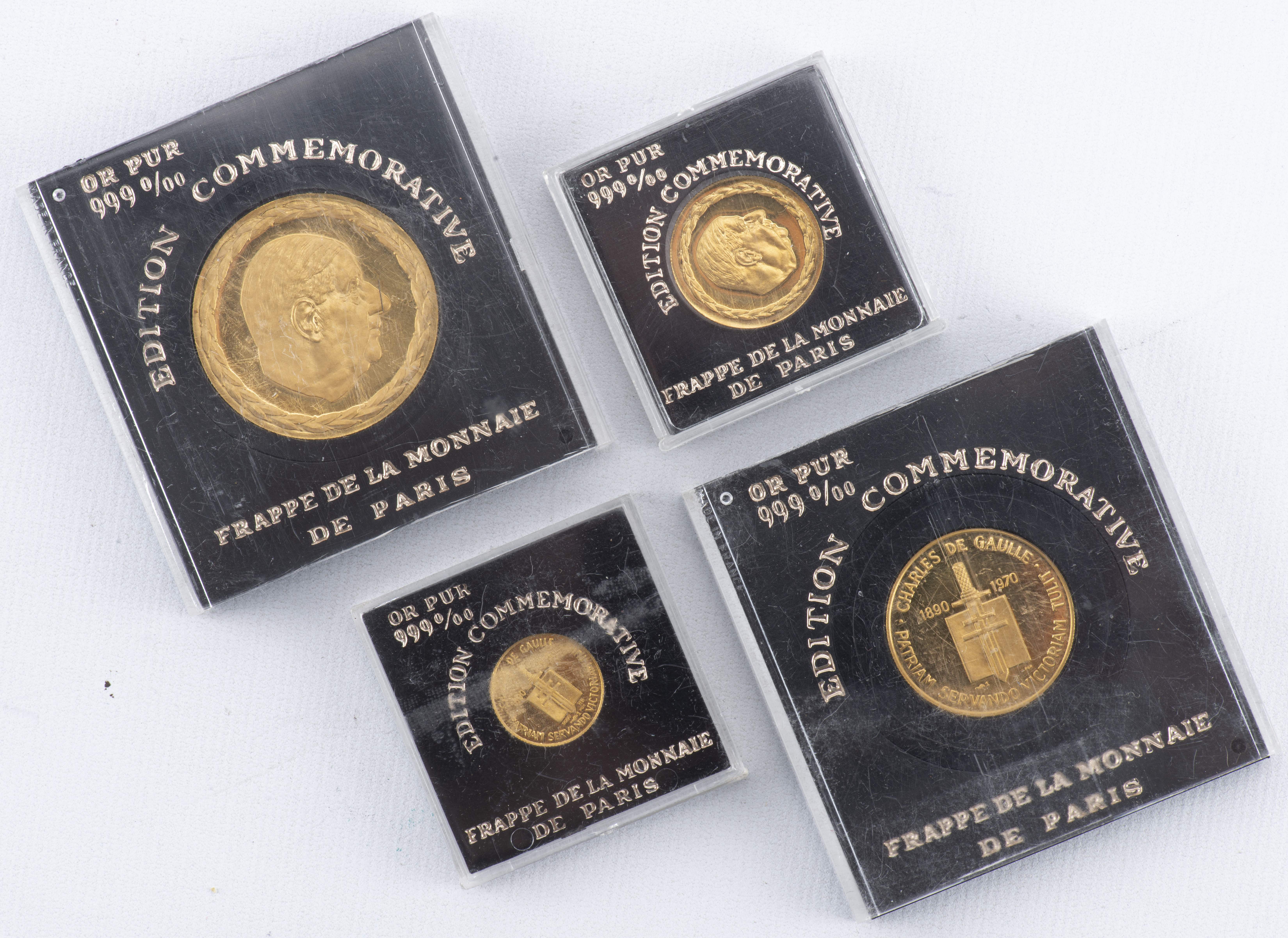 Quatre pièces en or jaune .999, frappe de la monnaie de Paris édition Commémorative Charles de Gaule 1890-1970 Patriam Servando Victoriam, de taille différentes.