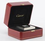 CARTIER, réveil à boîtier carré en acier chromé, mécanisme automatique, cadran noir et chiffres romains, bouton sonnerie à l'arrière. Vendu avec son boîtier. Fabriqué en Suisse. Num. 103442GD 2745