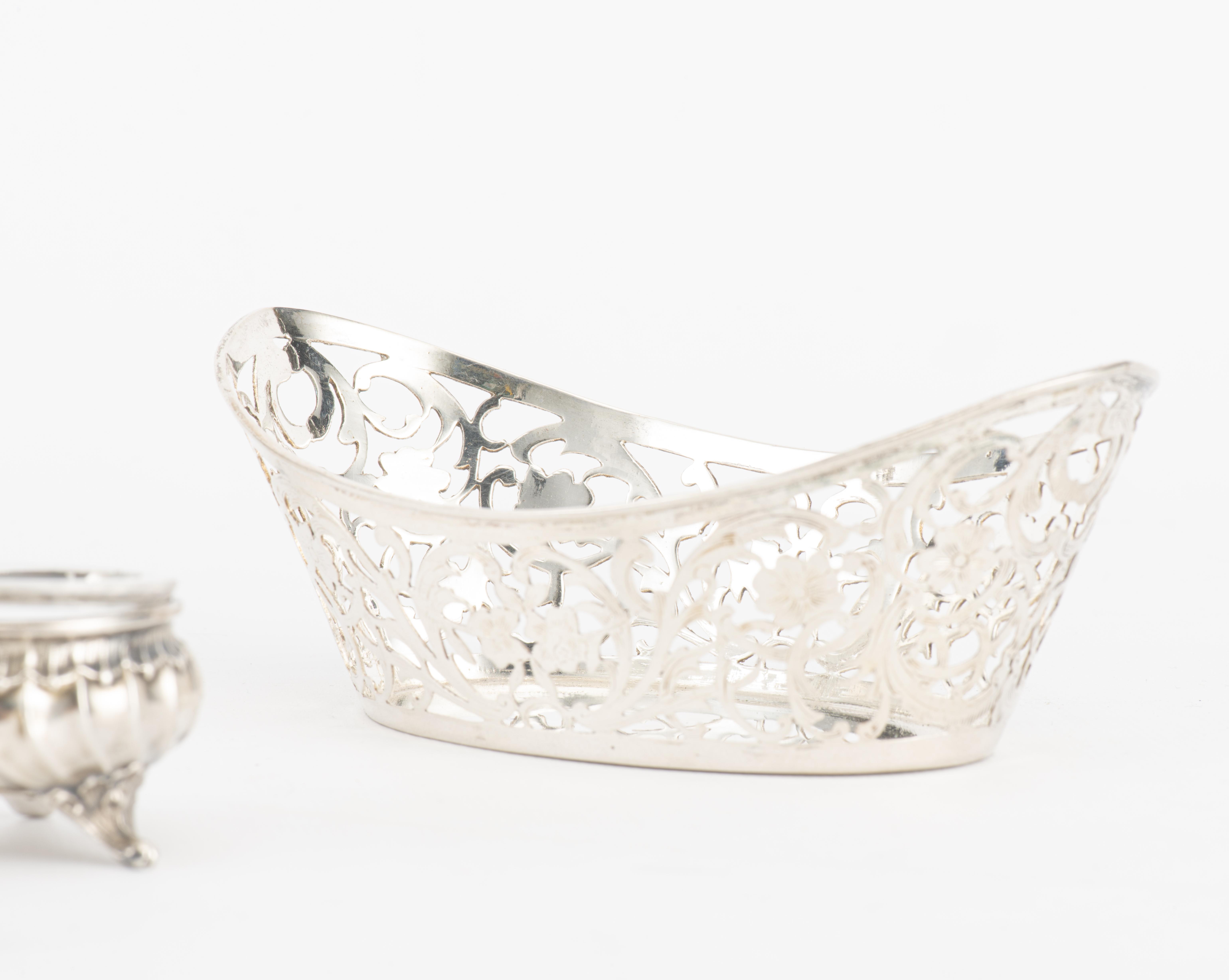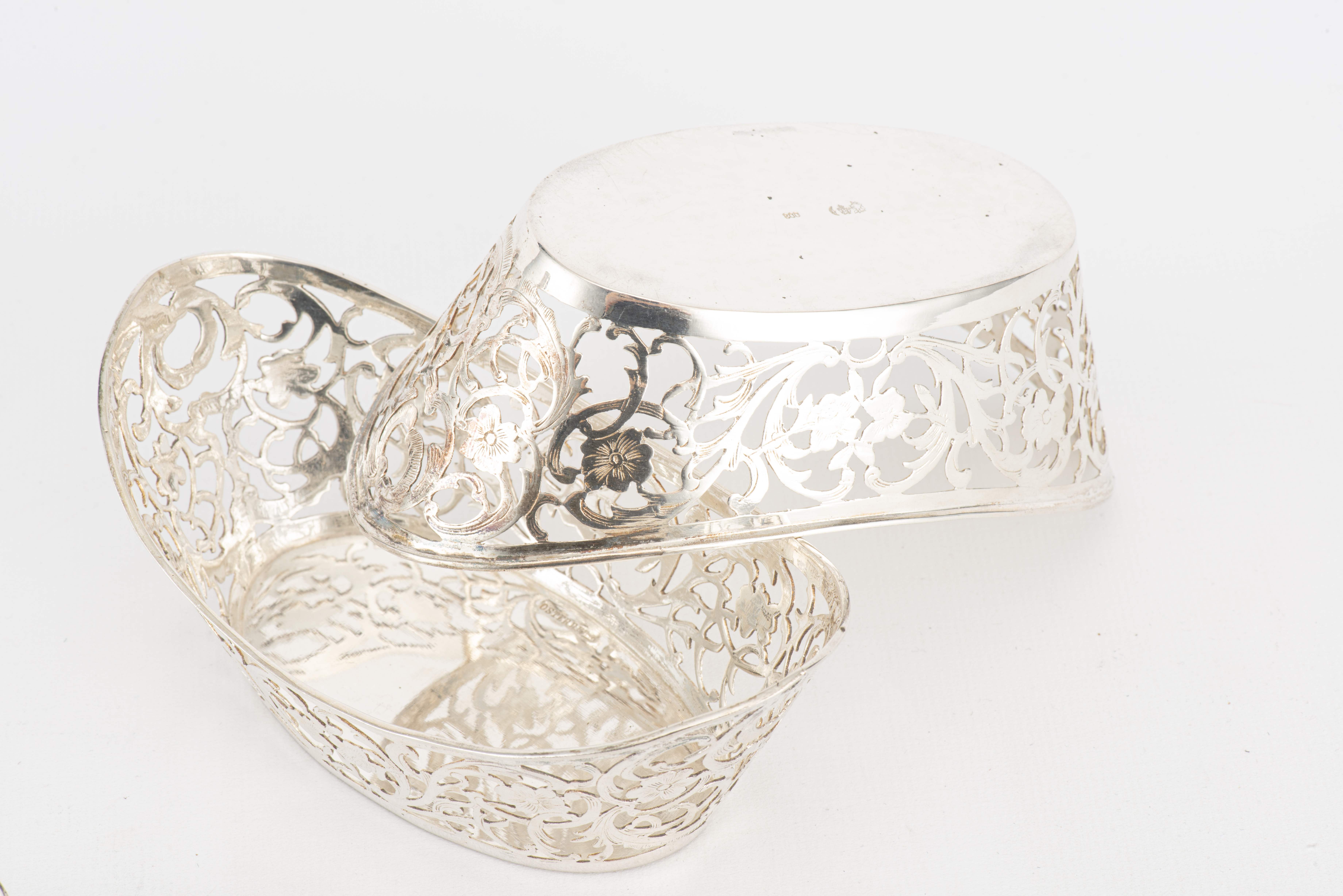 - paire de paniers ovales en argent .800 allemand, bordure ajourée à décor de fleurs et feuillage. H. 5x13x7.4 cm
