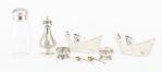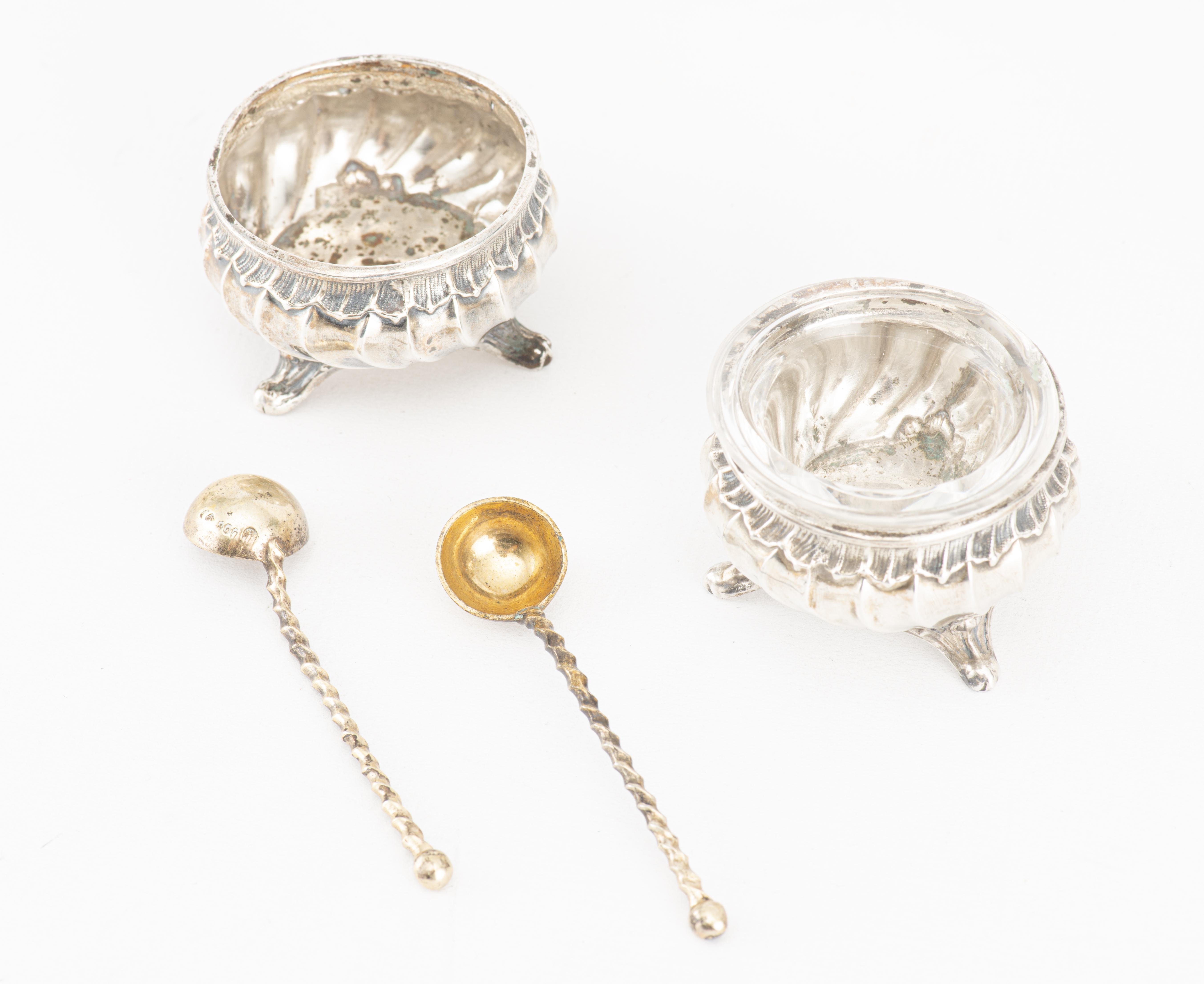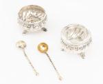 - paire de salières tripodes en argent .800 allemand (1 seul insert en verre) et deux cuillères à sel, cuillerons vermeil et manches torsadés.