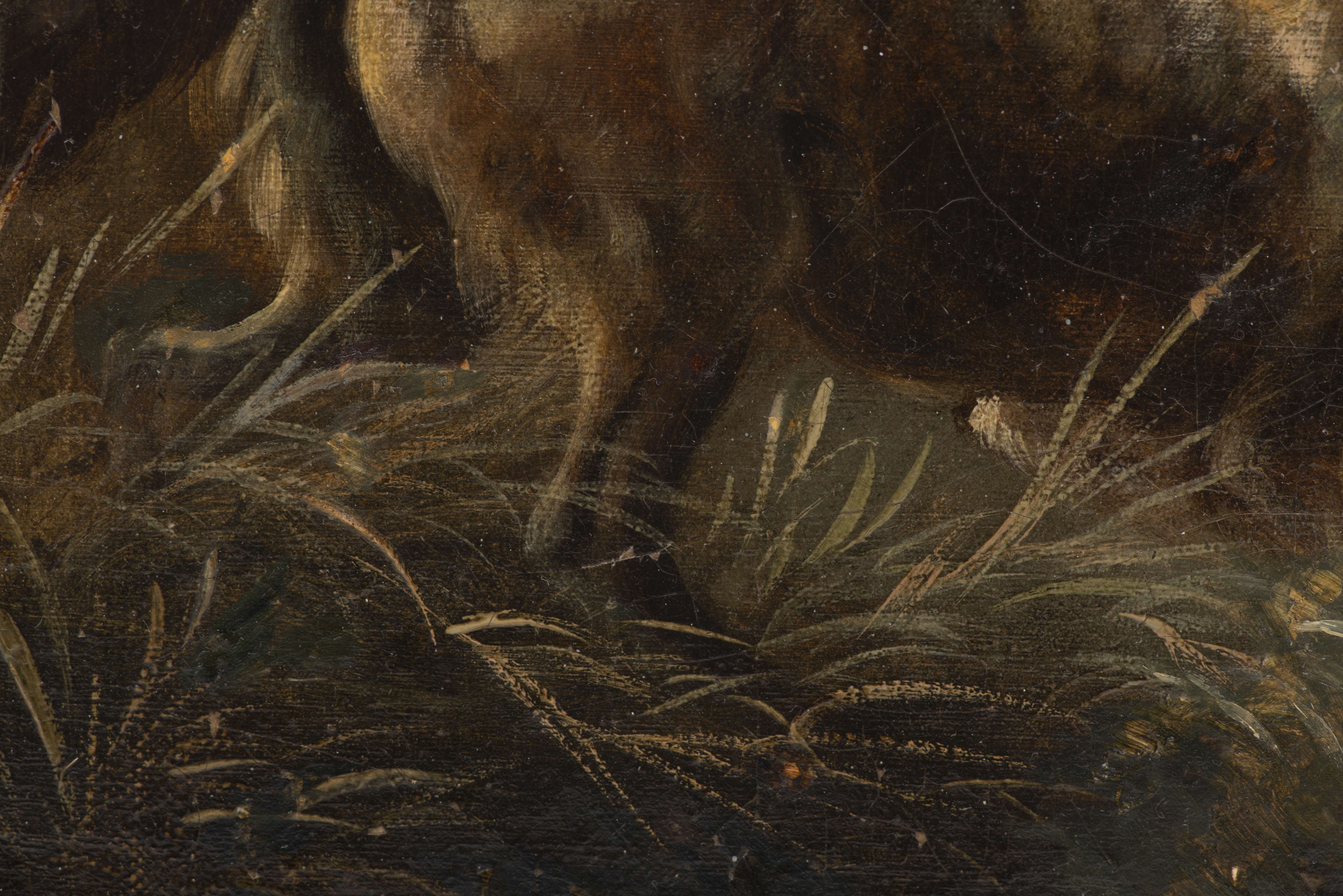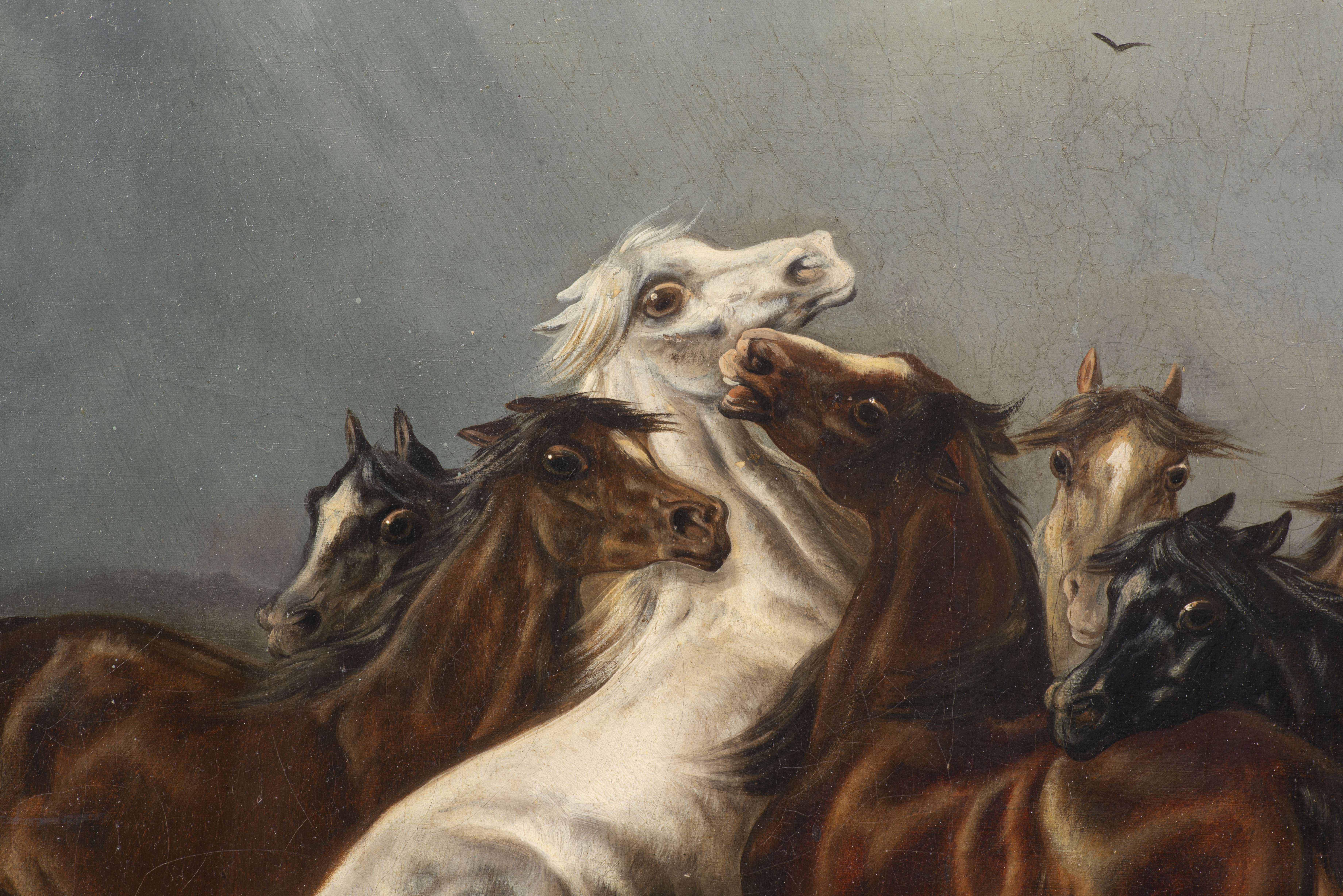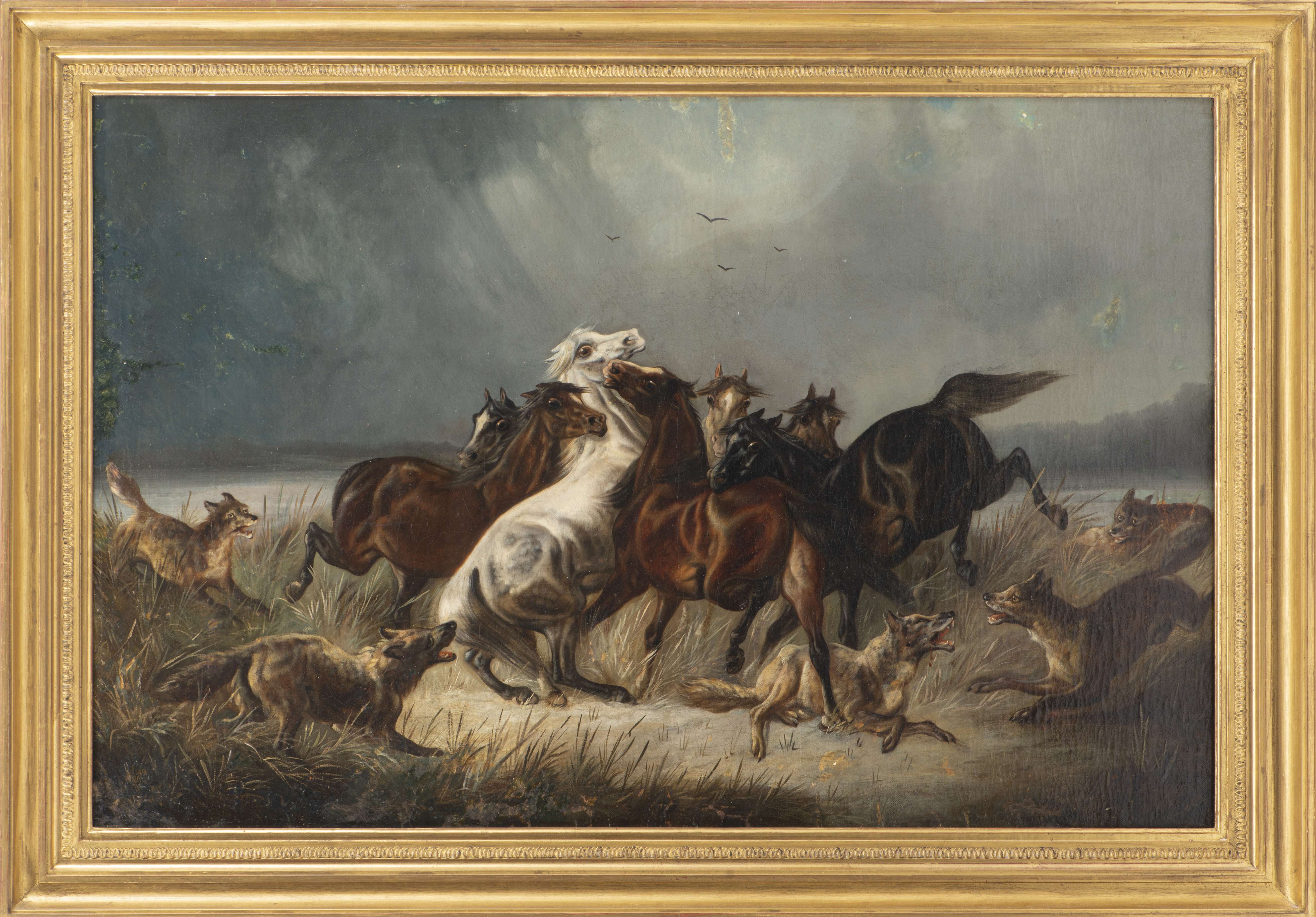 Ecole russe XIXe "Attaque des chevaux sauvages par les loups", huile sur toile, non signé