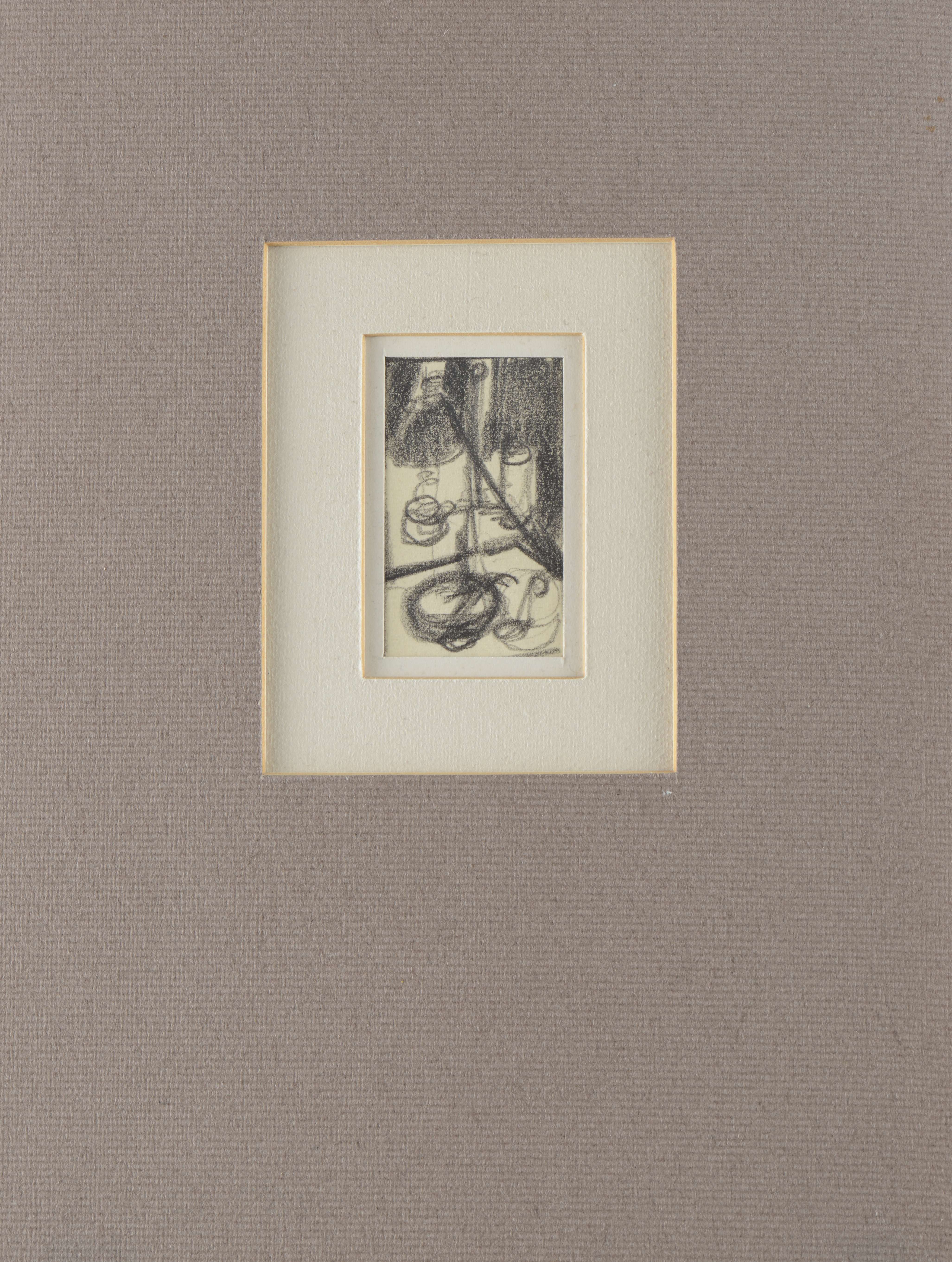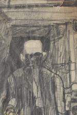 "Le père Henri dans sa cuisine", dessin, crayon sur papier, signé et daté Schmid 47 en bas à droite. Coin en haut à gauche brulé. Œuvre collée sur sur une feuille de papier à l'aide de scotch
