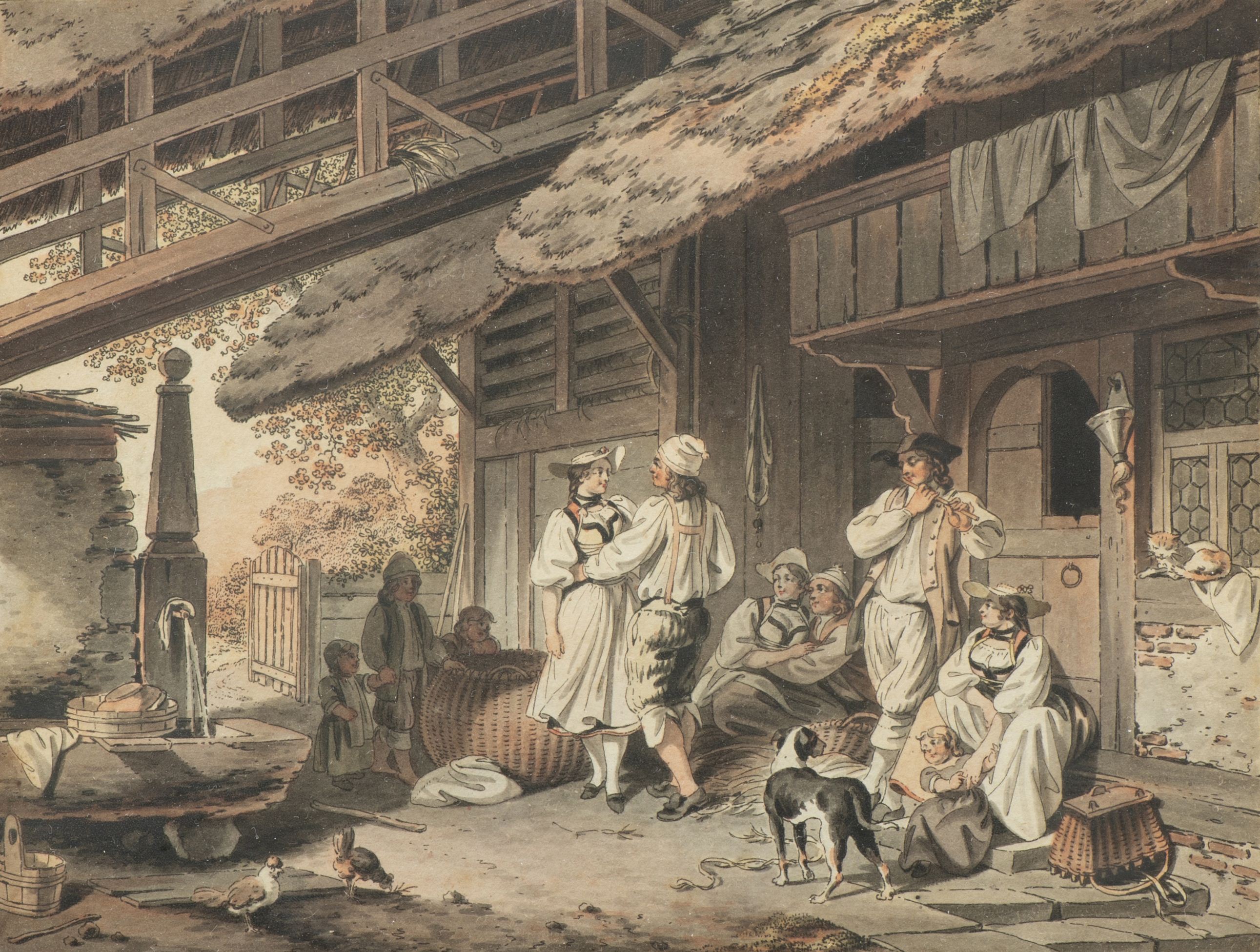 Pour "les chanteuses du mois de mai", la scène se situe à l'extérieur d'une maison suisse au toit de chaume ; une femme assise sur un banc contre la maison, coiffée d'une casquette noire et d'une robe blanche et tenant un enfant dans ses bras ; son mari se tient derrière la porte de gauche ; un chat blanc et noir regarde dans un panier d'osier aux pieds de la femme ; les deux personnages regardent vers la droite un groupe de jeunes, la fille aînée tenant une petite branche avec un ruban attaché et un médaillon rayé sur son bras droit, la fille à côté d'elle avec une longue tresse attachée avec un ruban noir en bas d'elle au dos, deux filles beaucoup plus jeunes, un garçon et un chien ; à l'extrême droite se trouve une porte au-delà de laquelle se trouve un chemin de campagne ; au-dessus de la porte de gauche se trouve une cabane à oiseaux ; divers ustensiles et instruments ménagers se trouvent autour de la façade de la maison.