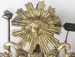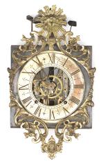 Mouvement de morbier Louis XIV à cadran circulaire évidé en bronze doré, bandeau au soleil, gerbe de blé et fleurs, tablier aux fleurs et médaillon aux trois flèches pointant vers le sol. 1 cloche et deux marteaux.