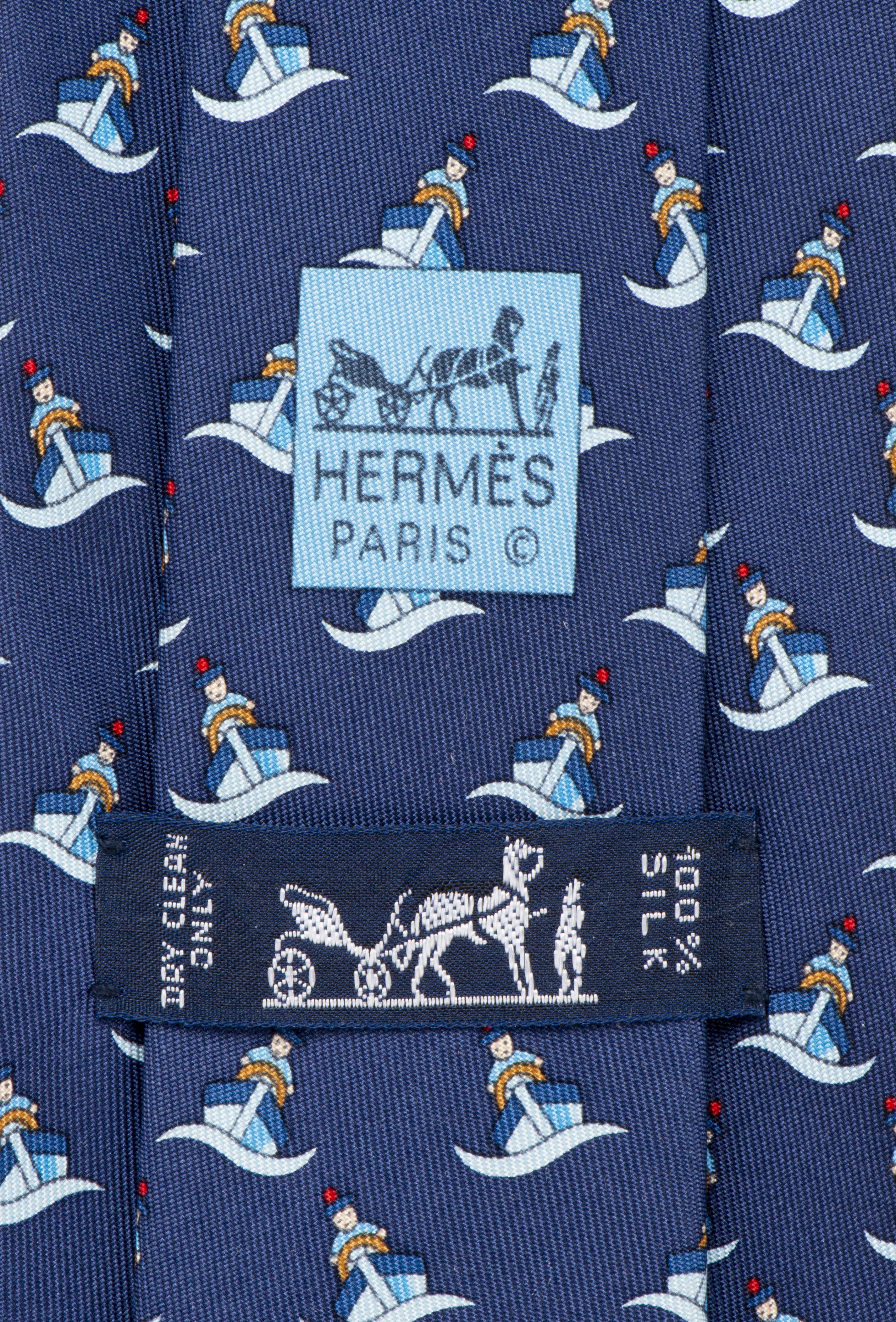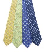 Hermès, lot de quatre cravates en soie à motif dans les tons jaune, vrt clair et bleu.
