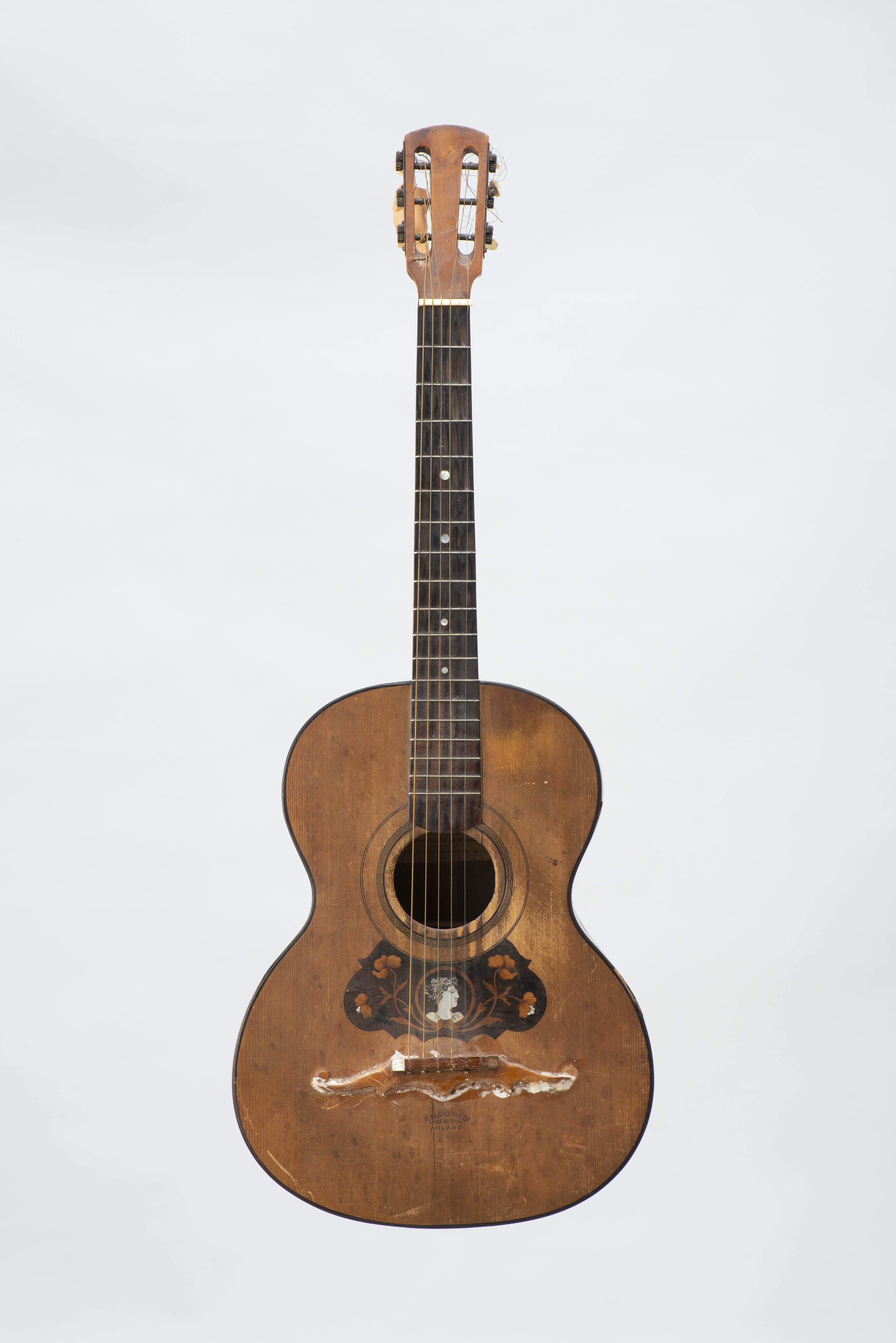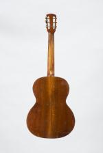 Guitare P. Manfredi à Milan XIXe, joli décor de marqueterie sur la table, mécanique simple, fond noyer