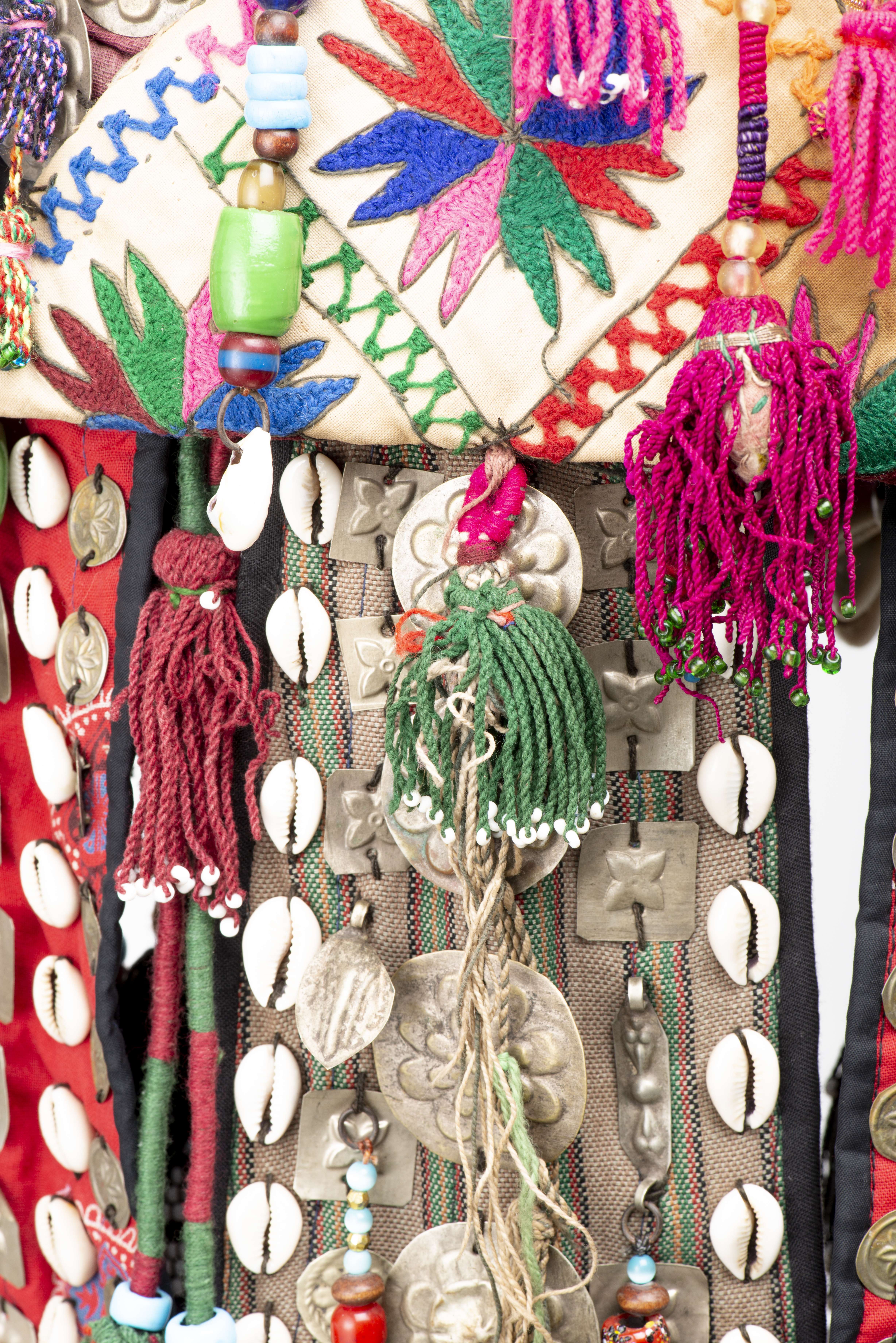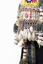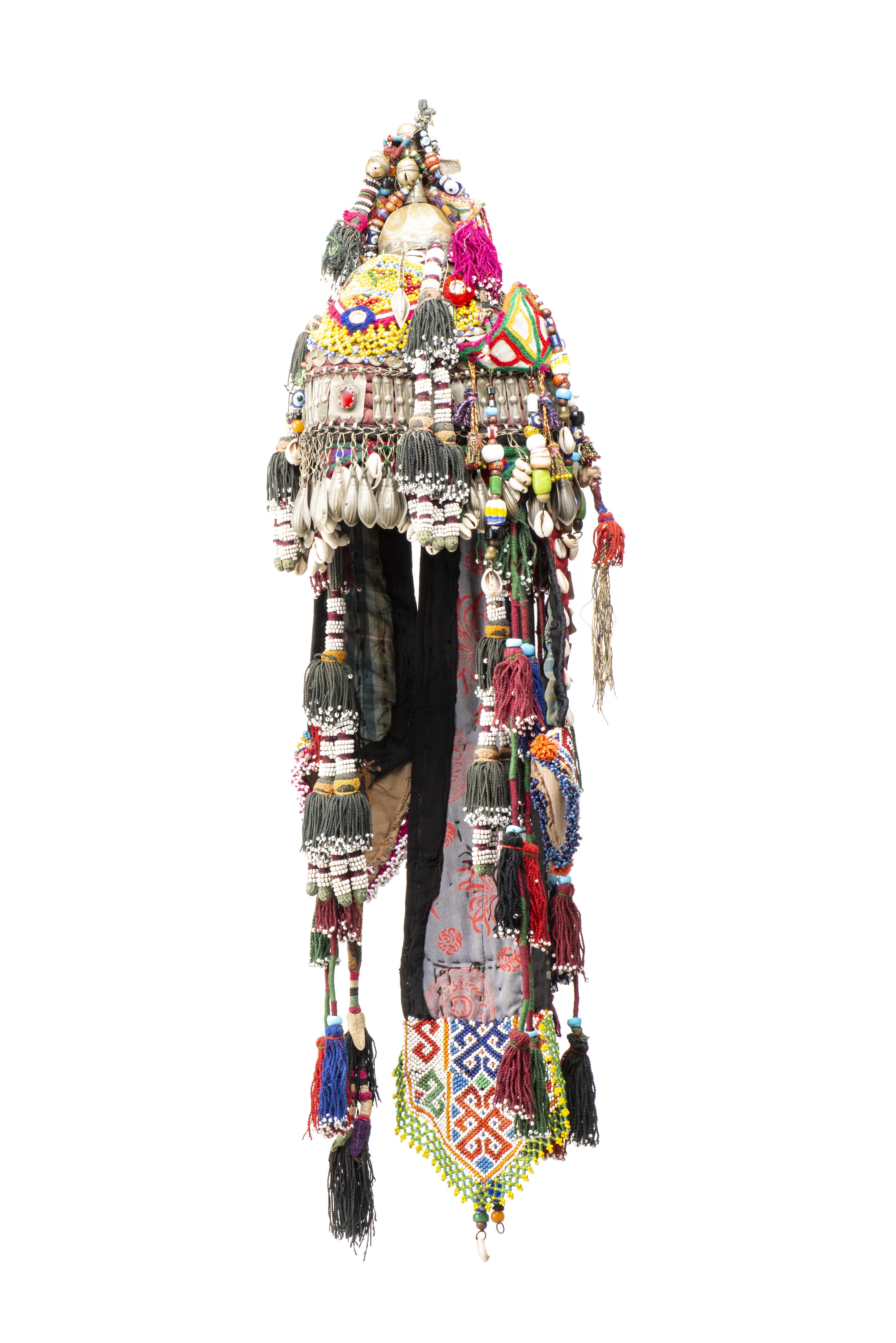 Coiffe ancienne irannienne à décor de métal, perles, coquillages, tissu, etc.