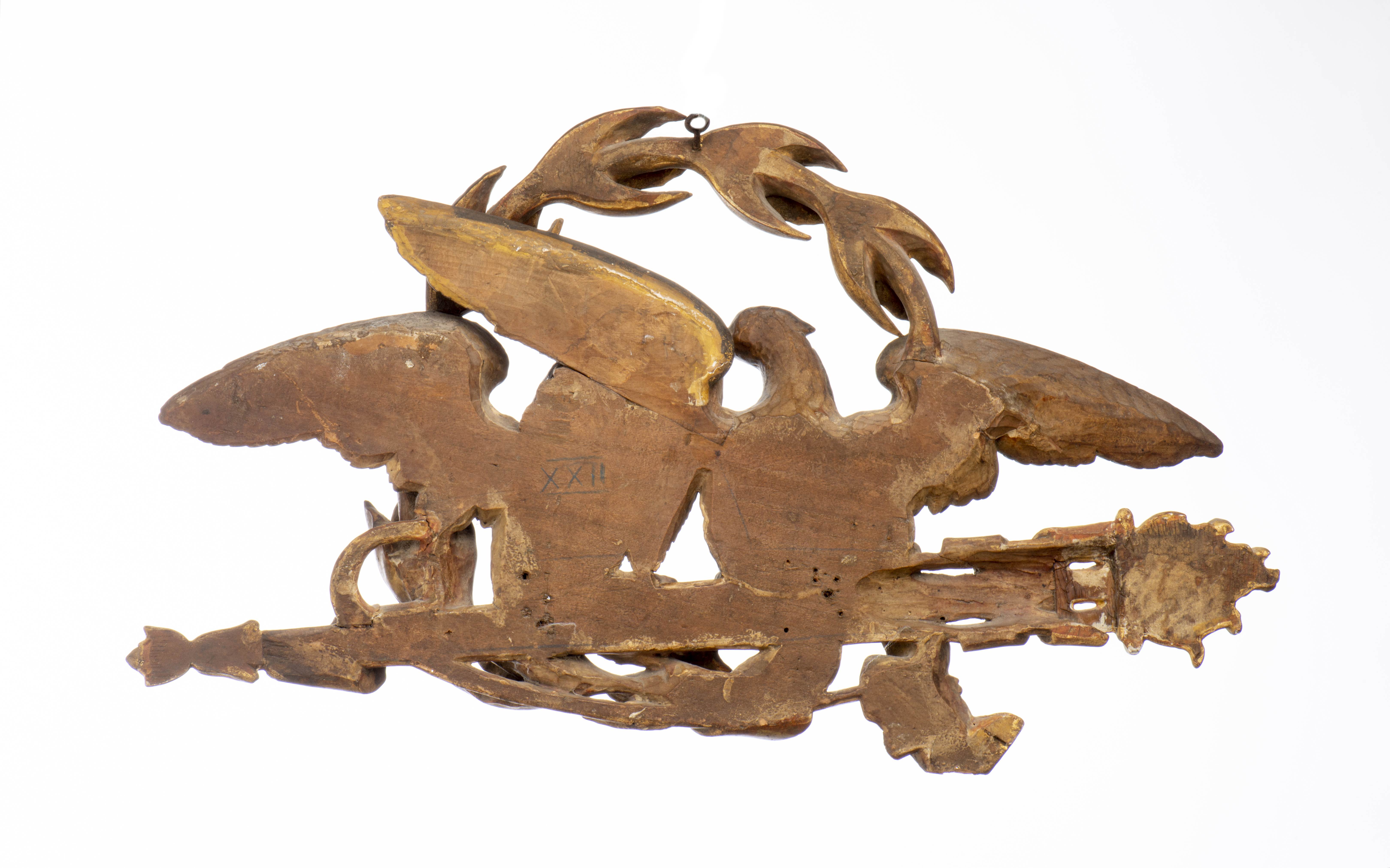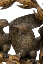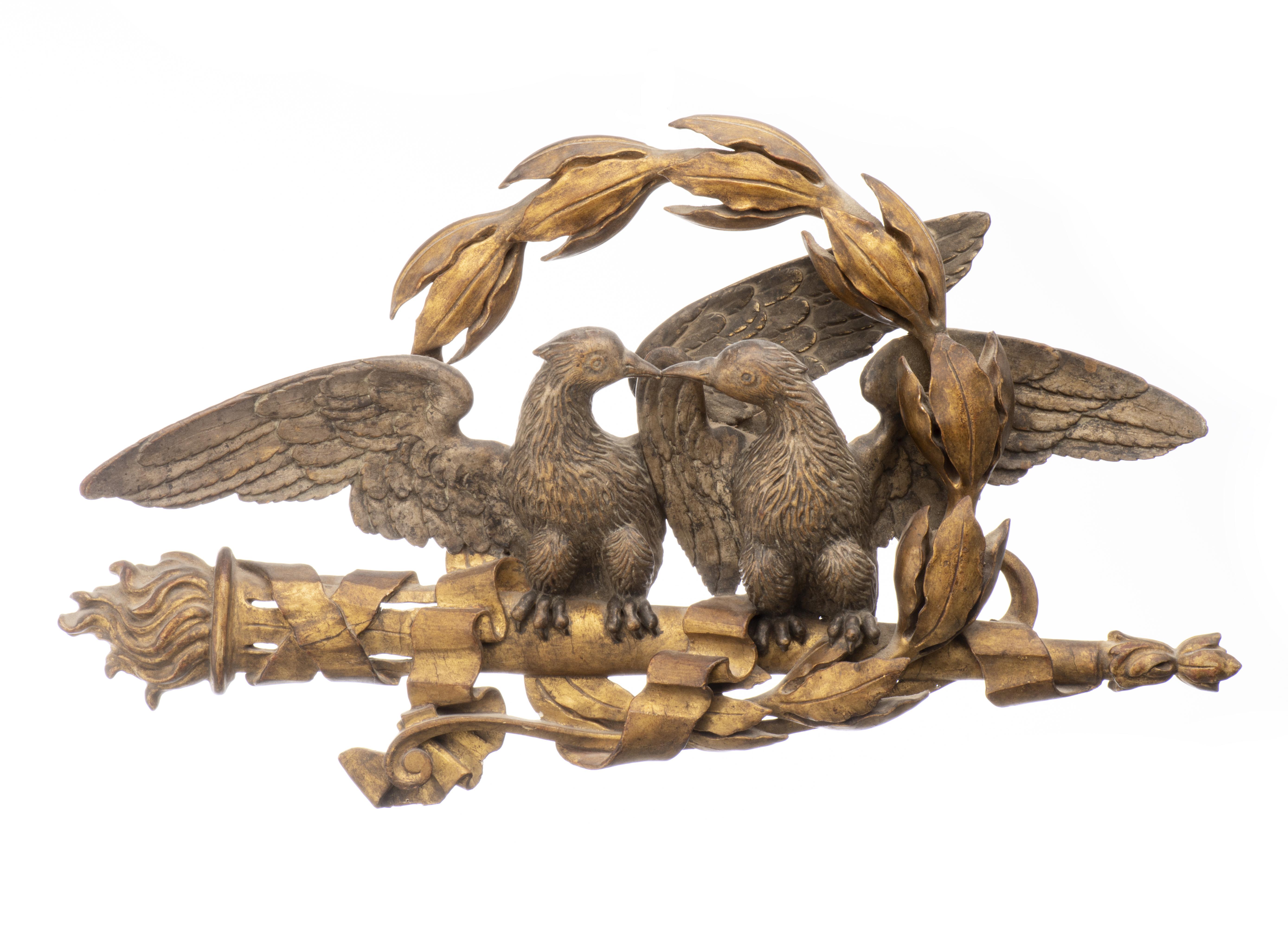 Travail XVIIIe, haut de trumeau en bois doré agrémenté de deux colombes.
