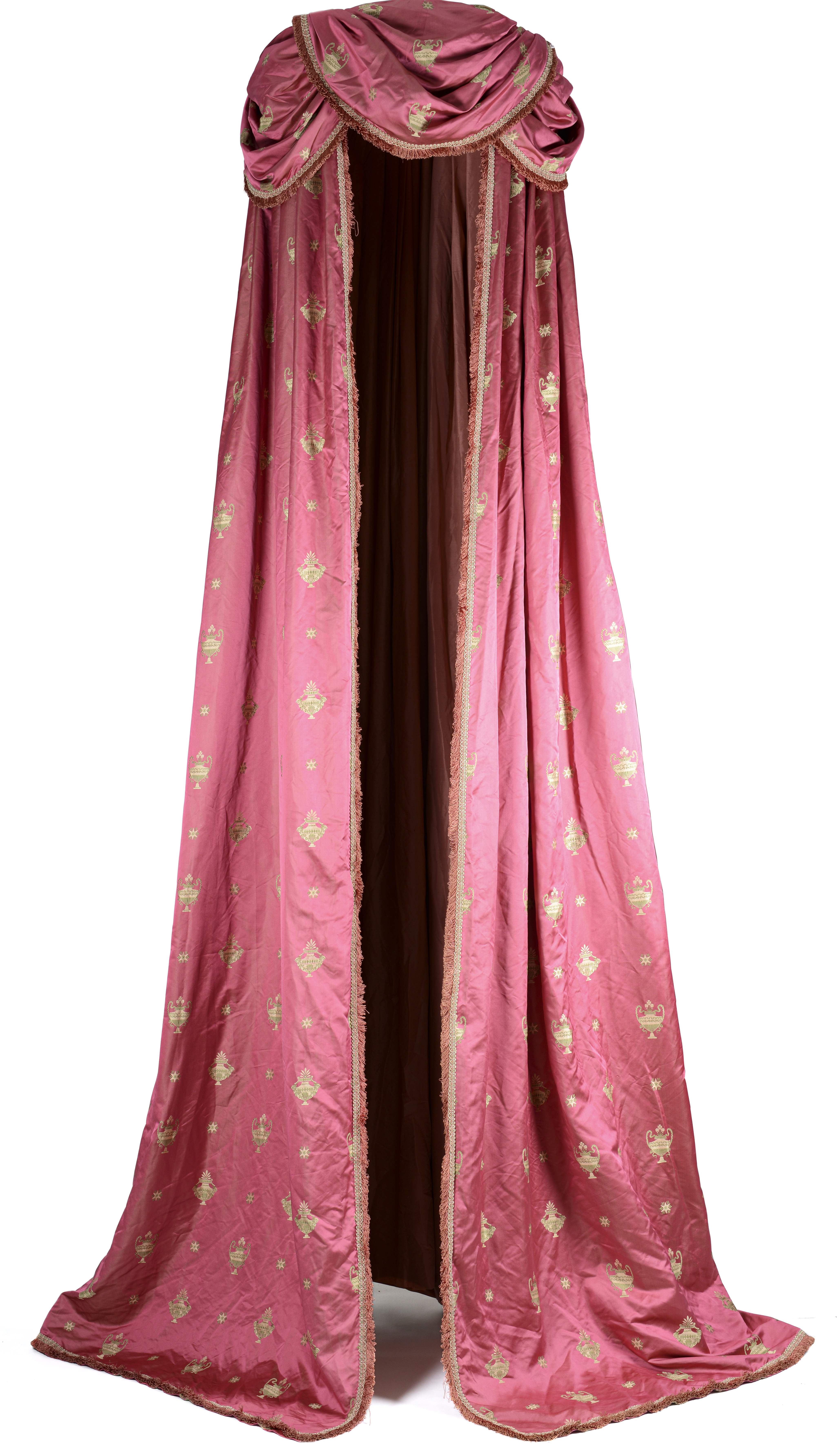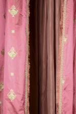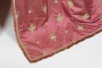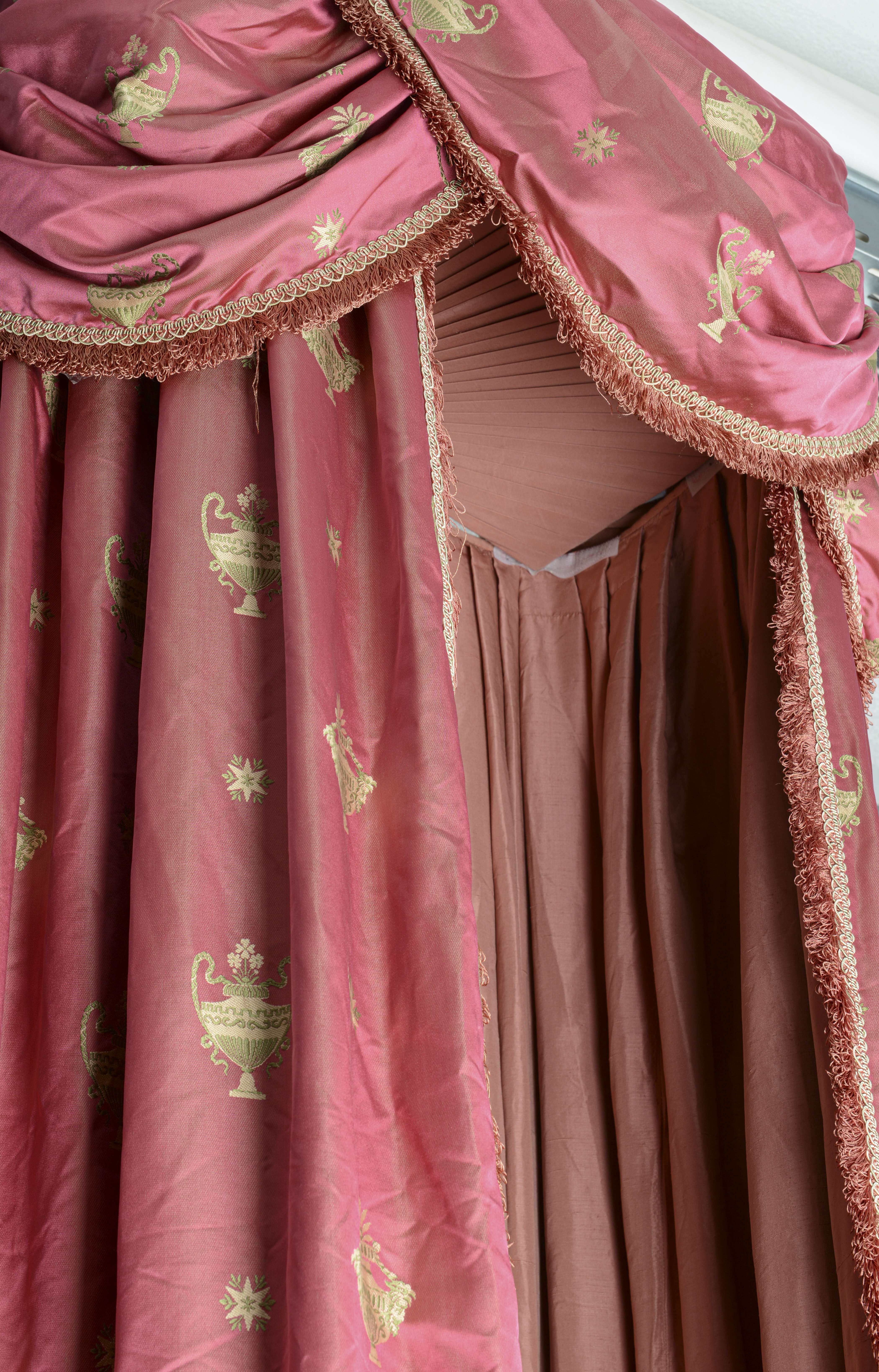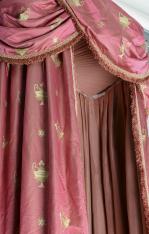 Ciel de lit de style Louis XVI en soie à motif et doublure en soie rose.