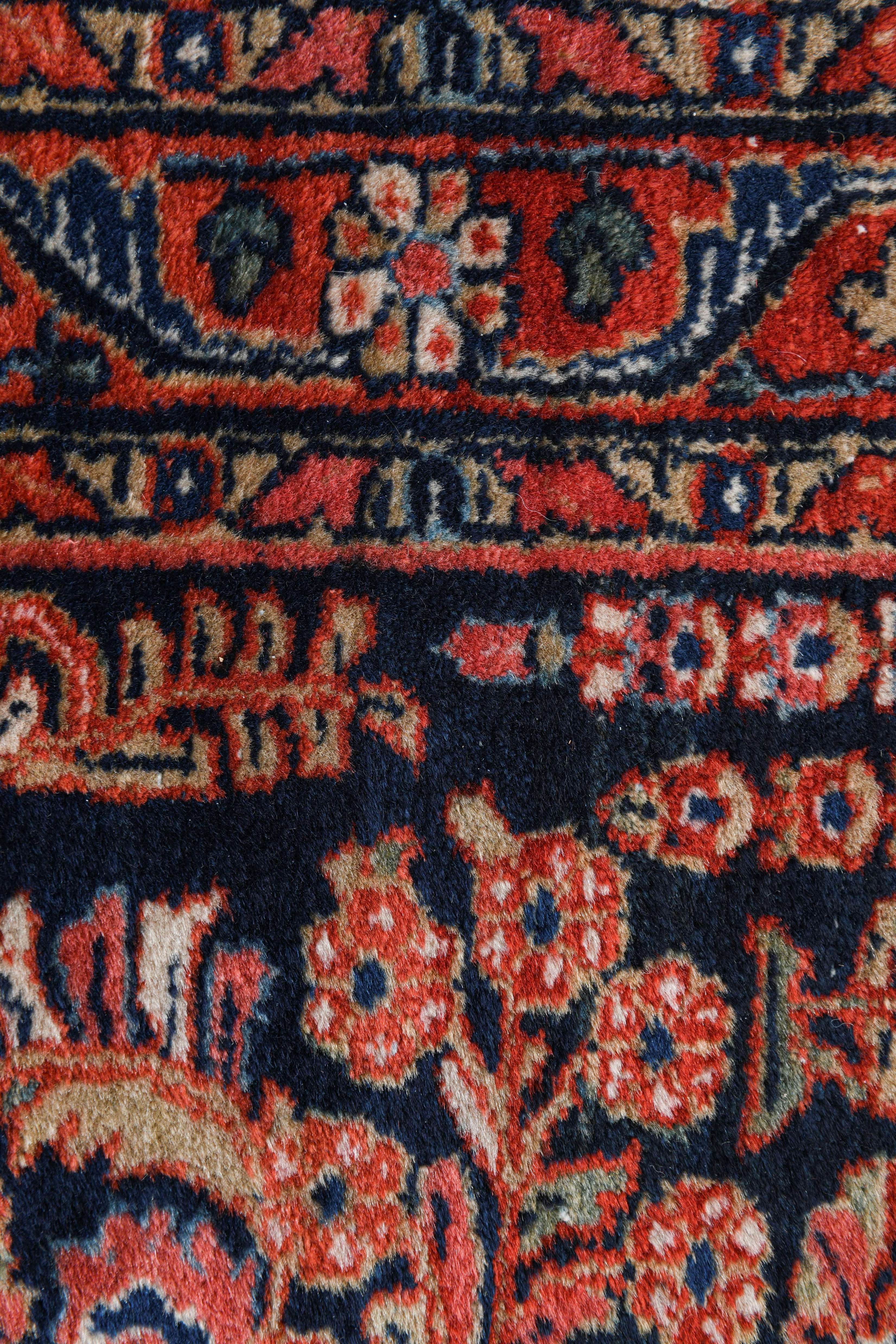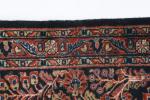 Tapis Saroug de passage à décor de vases de fleurs et décor floral sur champ principal bleu, bordure principale à frise florale sur champ rouge.