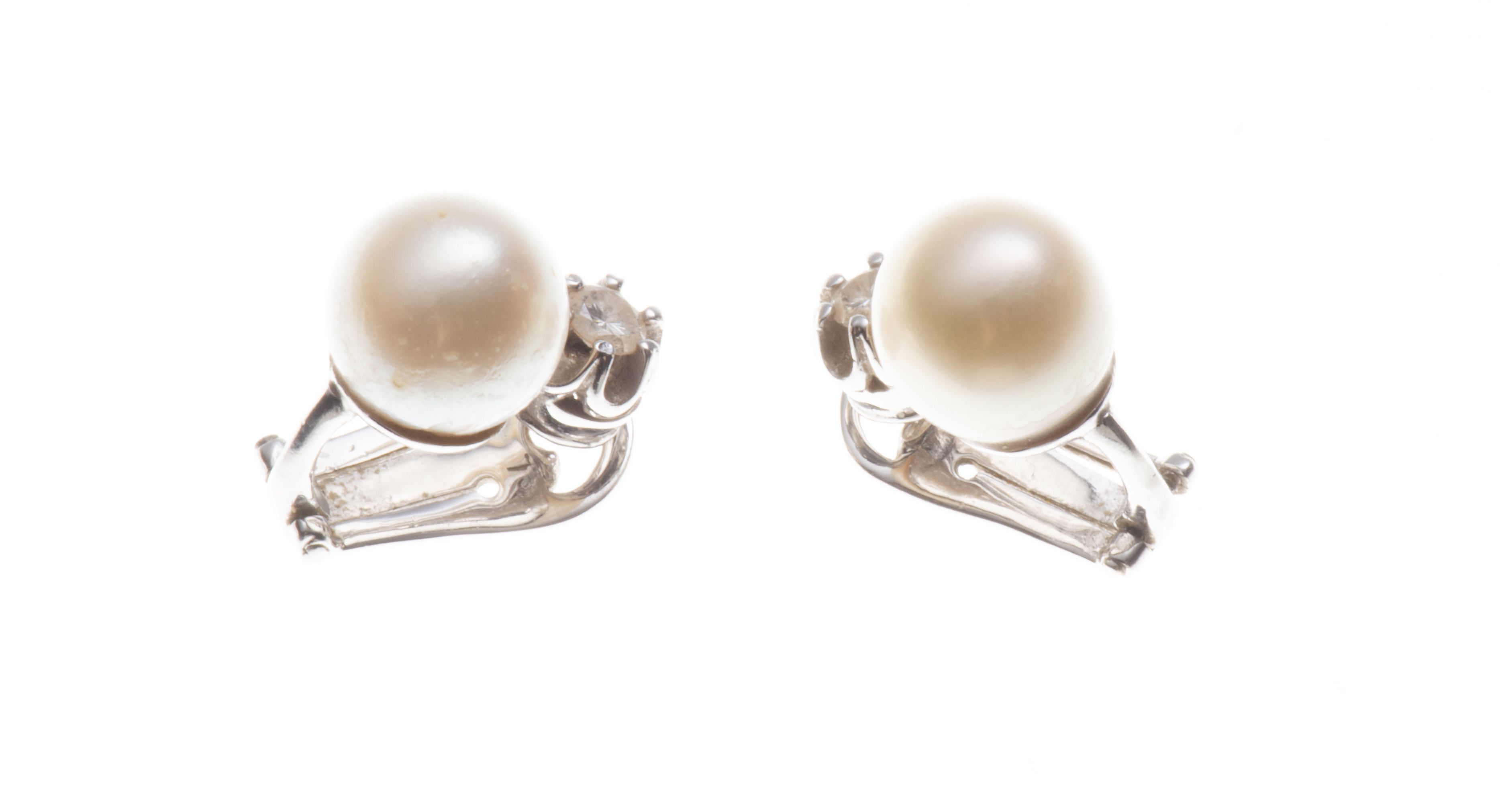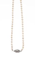 Demi-parure comprenant un collier de 55 perles et une paire de boucles d'oreilles à une perle et un diamant de 0.07 ct chacune.