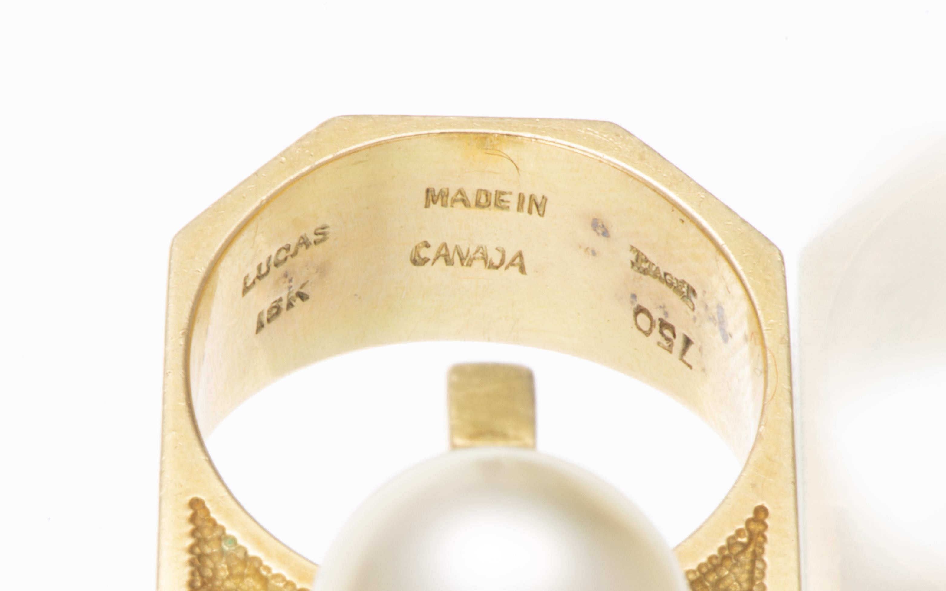 PIAGET (pour le marché canadien) bague 3 perles des Mers du Sud, une rose, une grise et une blanche d'un diamètre de 11-11.5 mm sur une monture en or jaune .750.