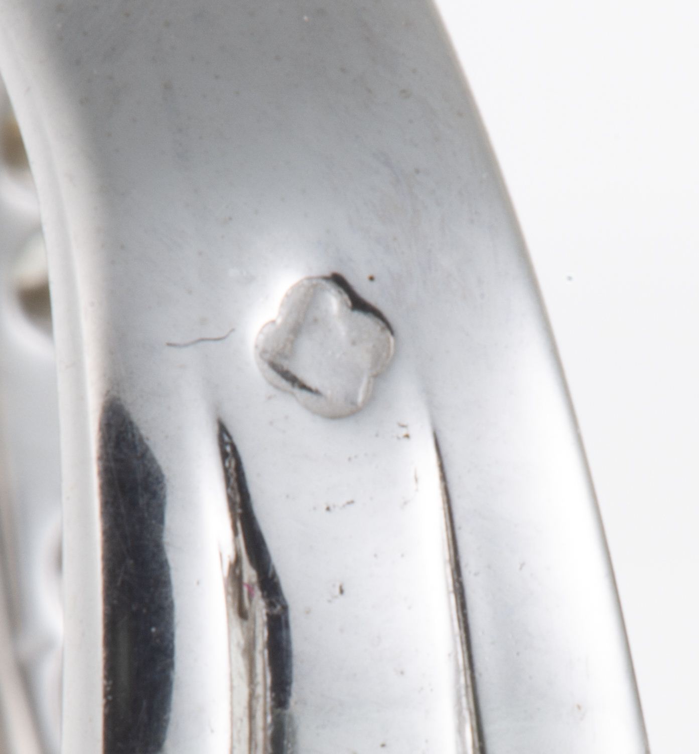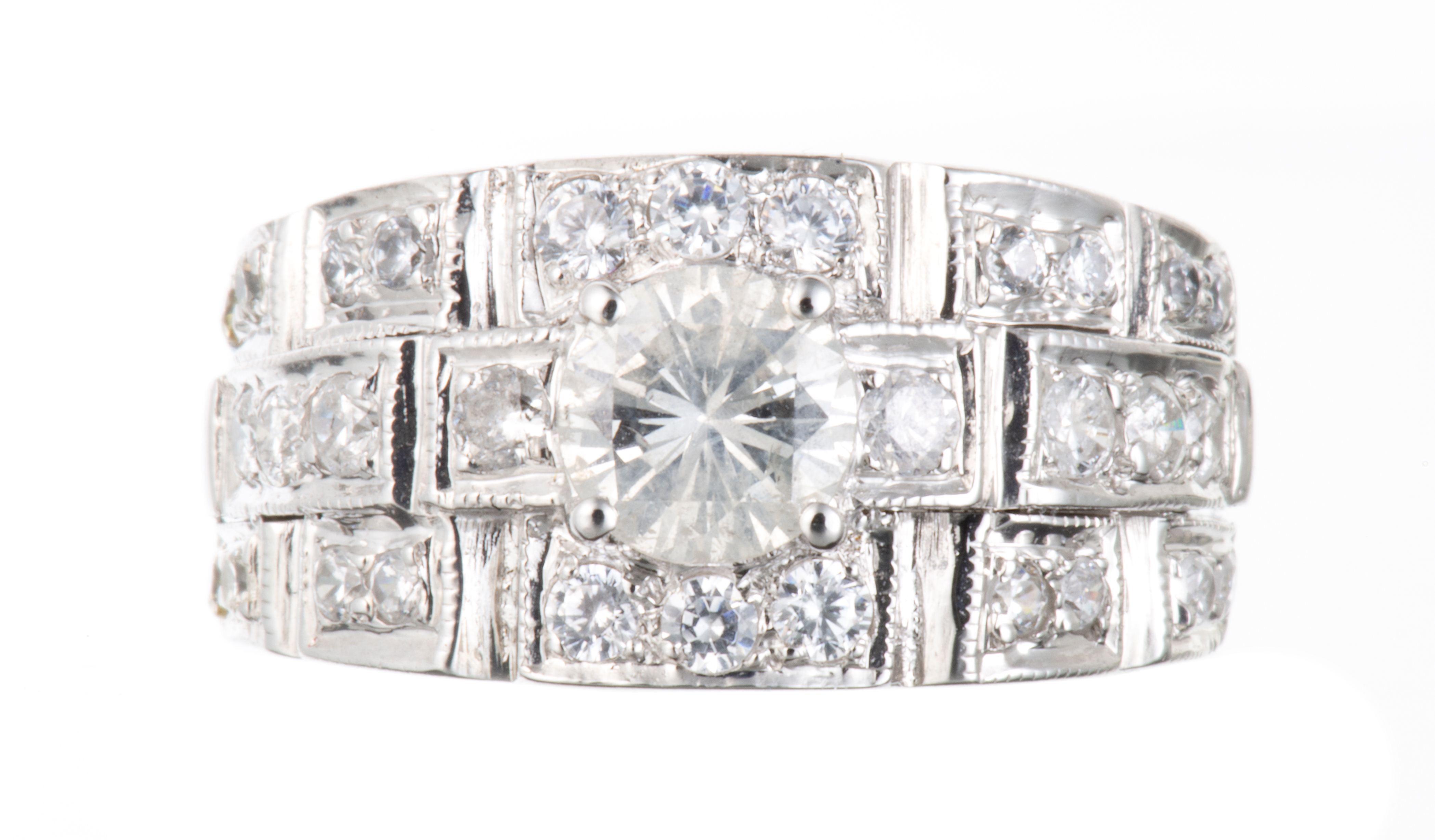 Bague en or gris .750 avec un un diamant de taille rondiste de 0.60 ct et un sertissage de 30 diamants de taille brillant pour un total de 0.8 ct.